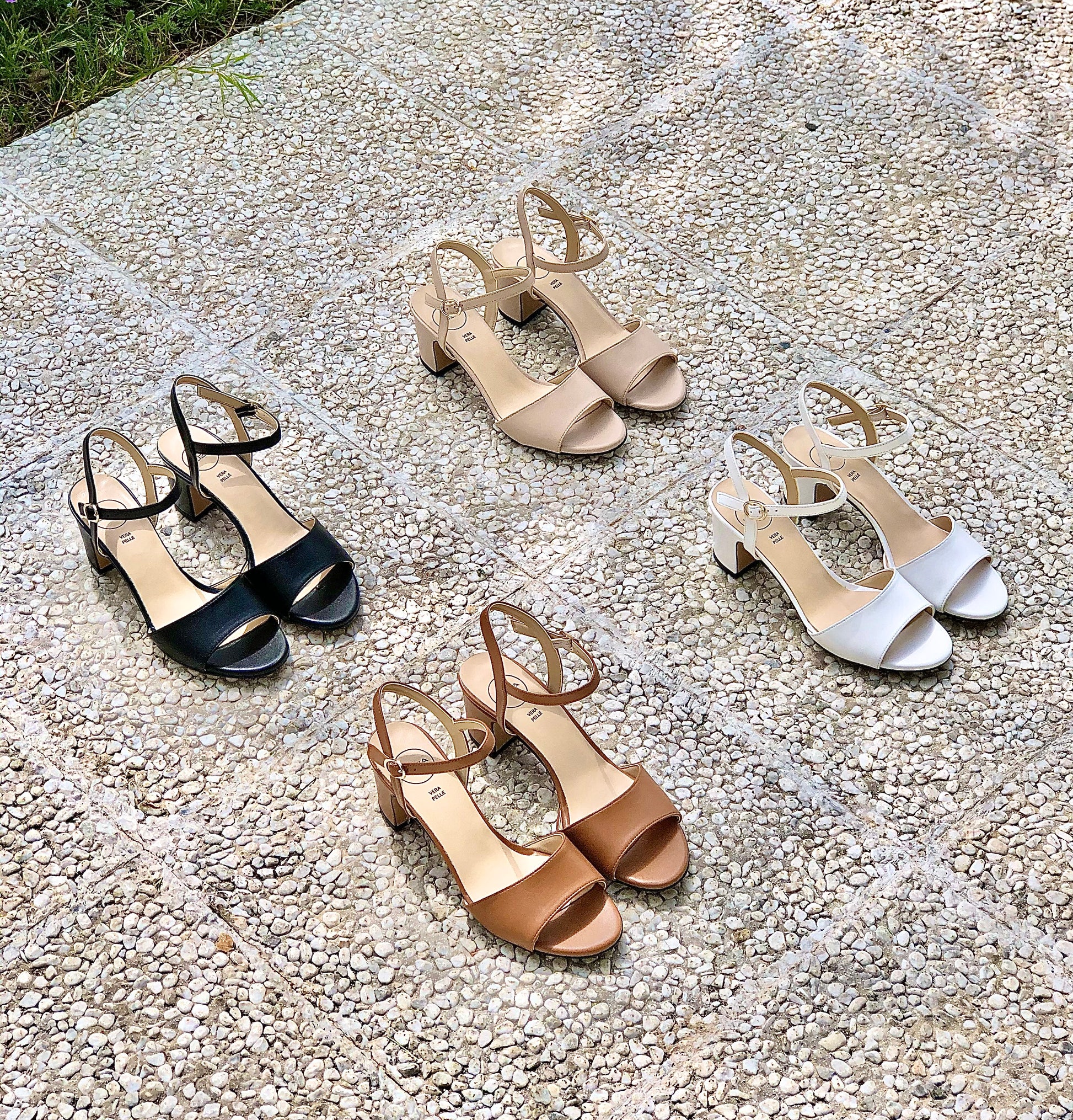 Leren riem en sandalen met hak van 5 cm.