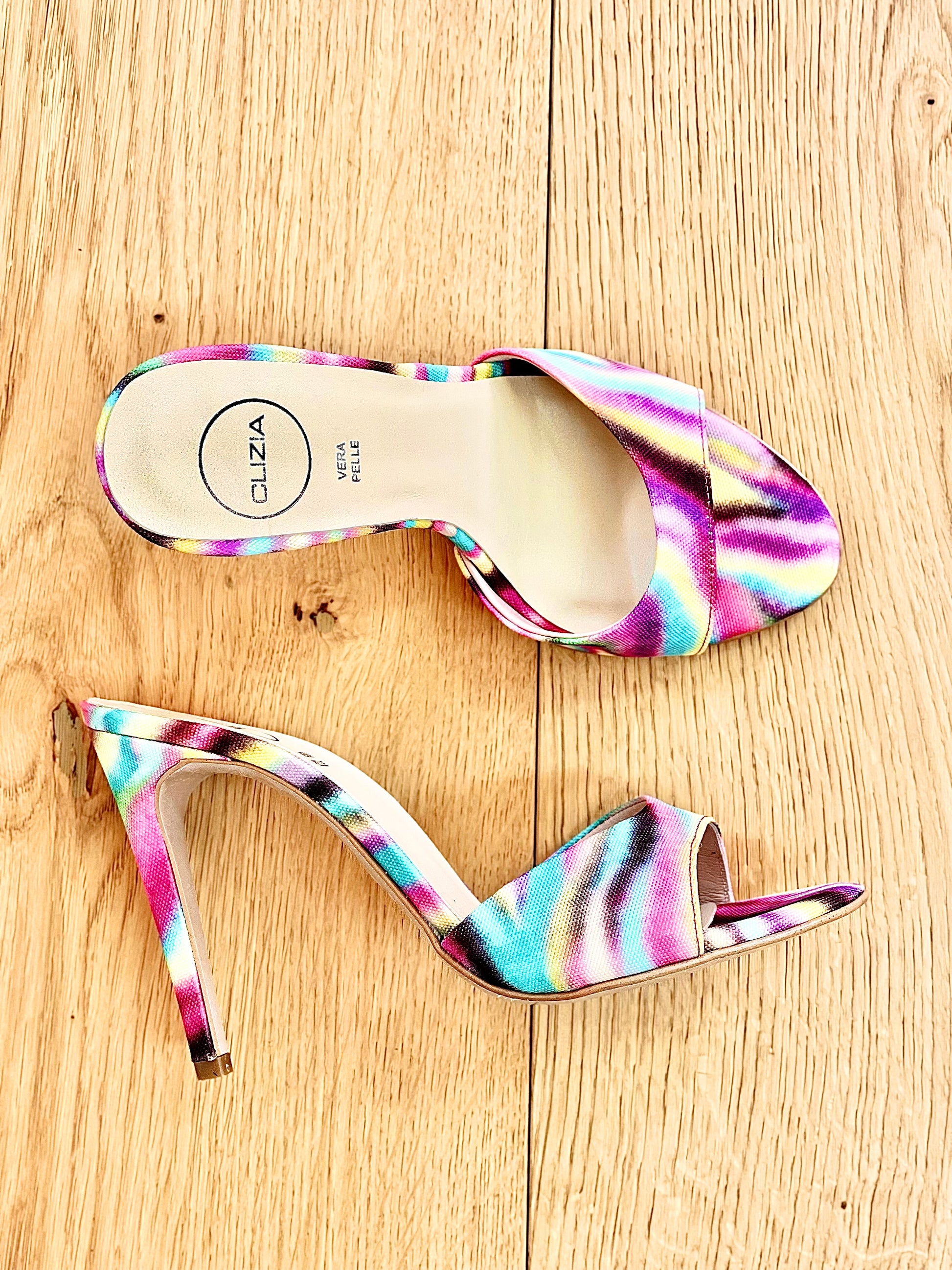 Veelkleurige hoge muiltjes sandalen met een hak van 10 cm.