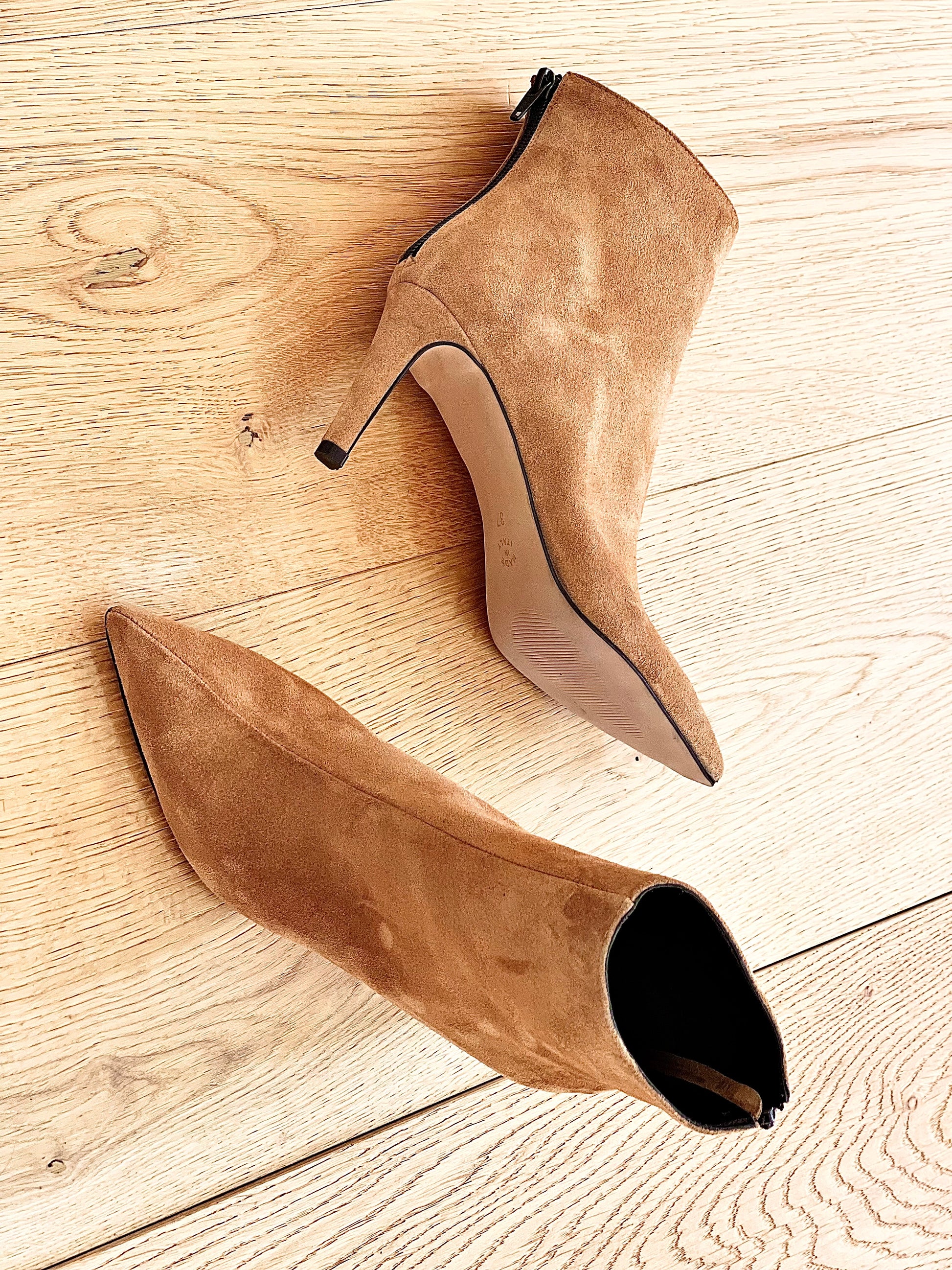 Suède enkellaarsjes met naaldhak en ritssluiting.