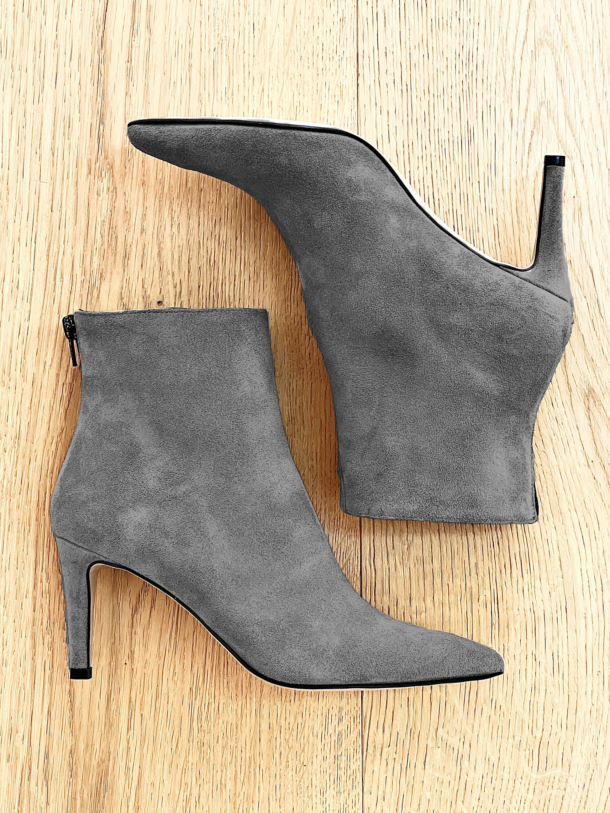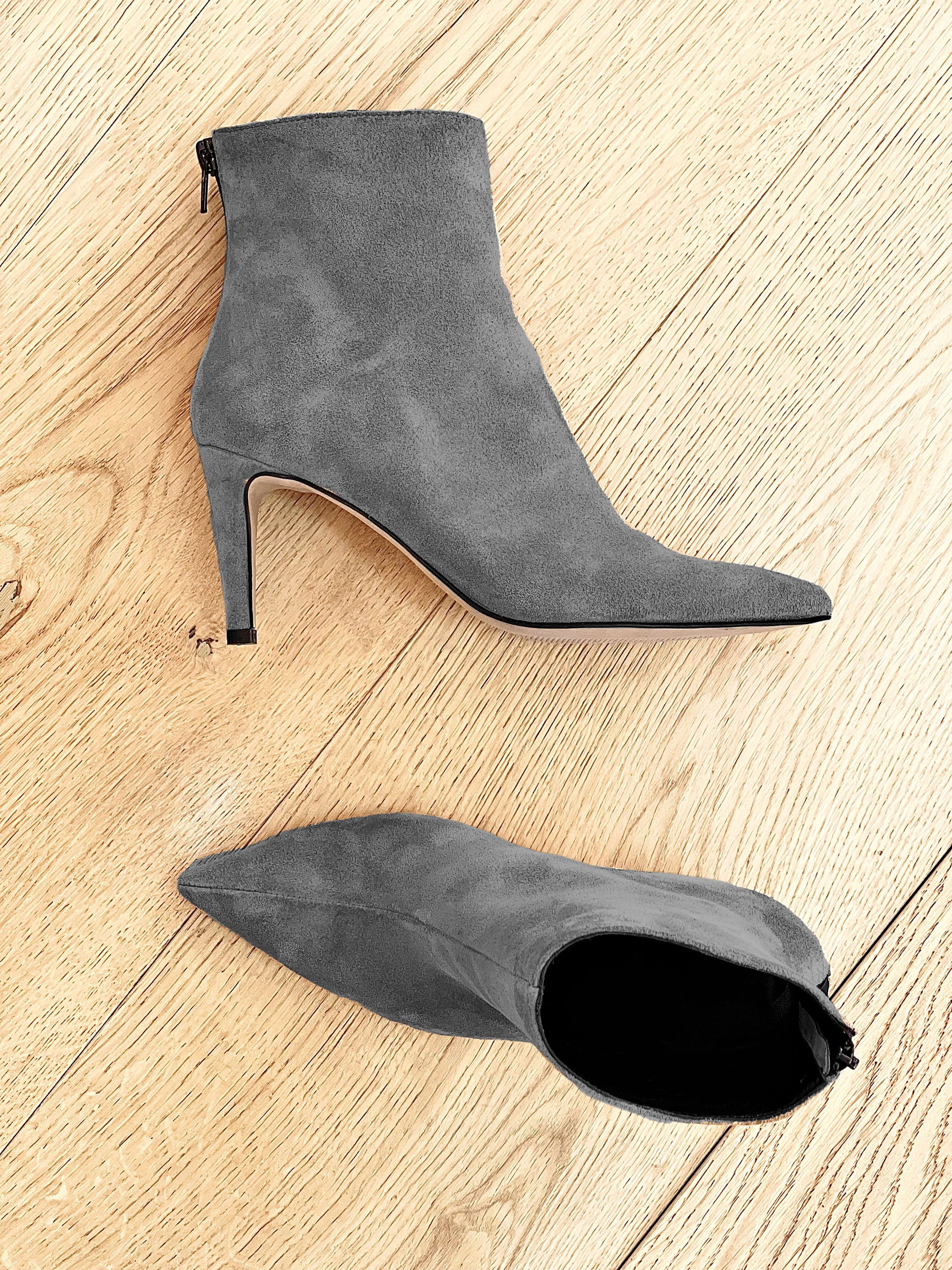 Suède enkellaarsjes met naaldhak en ritssluiting.