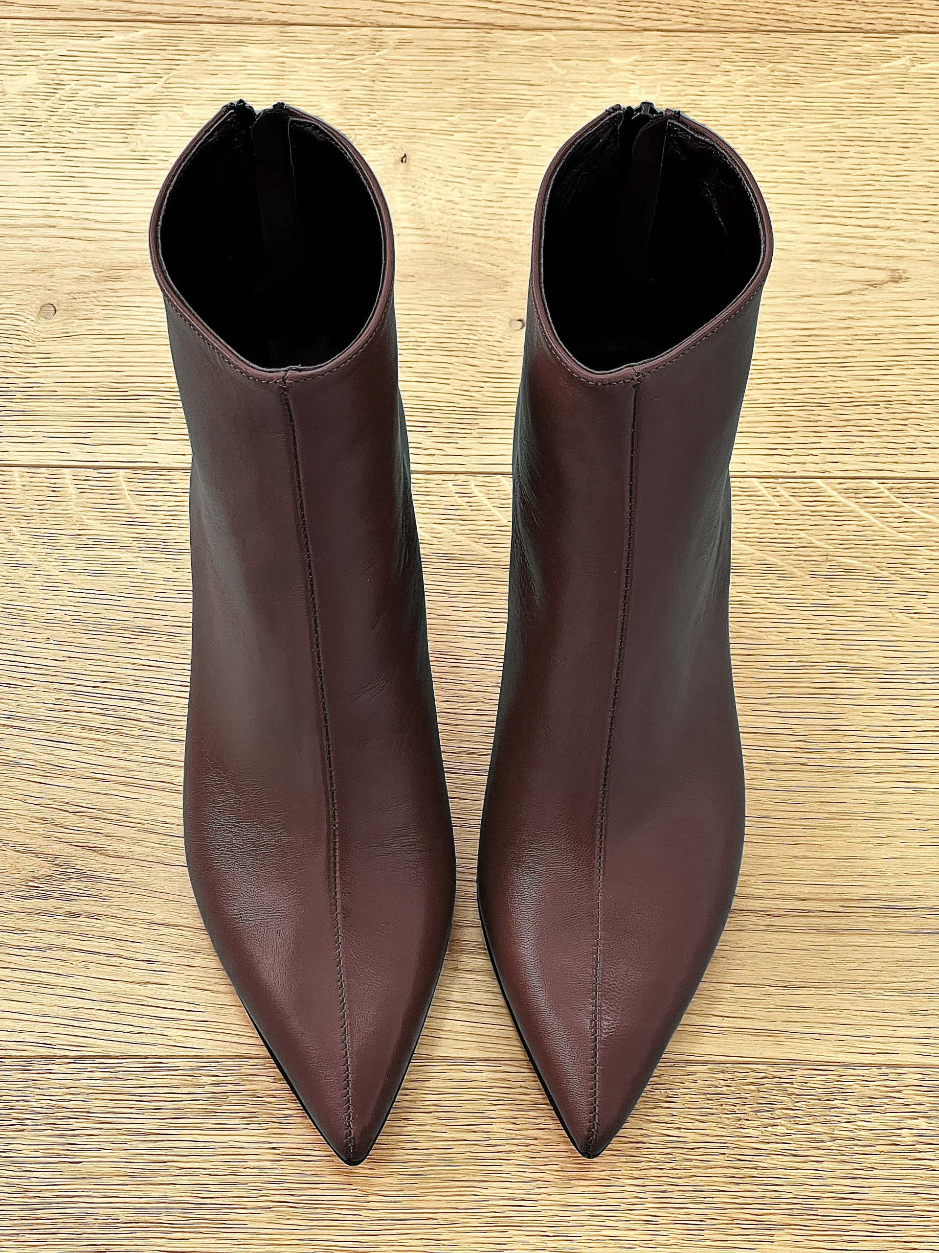 Enkellaarsjes met naaldhak en ritssluiting aan de achterkant.