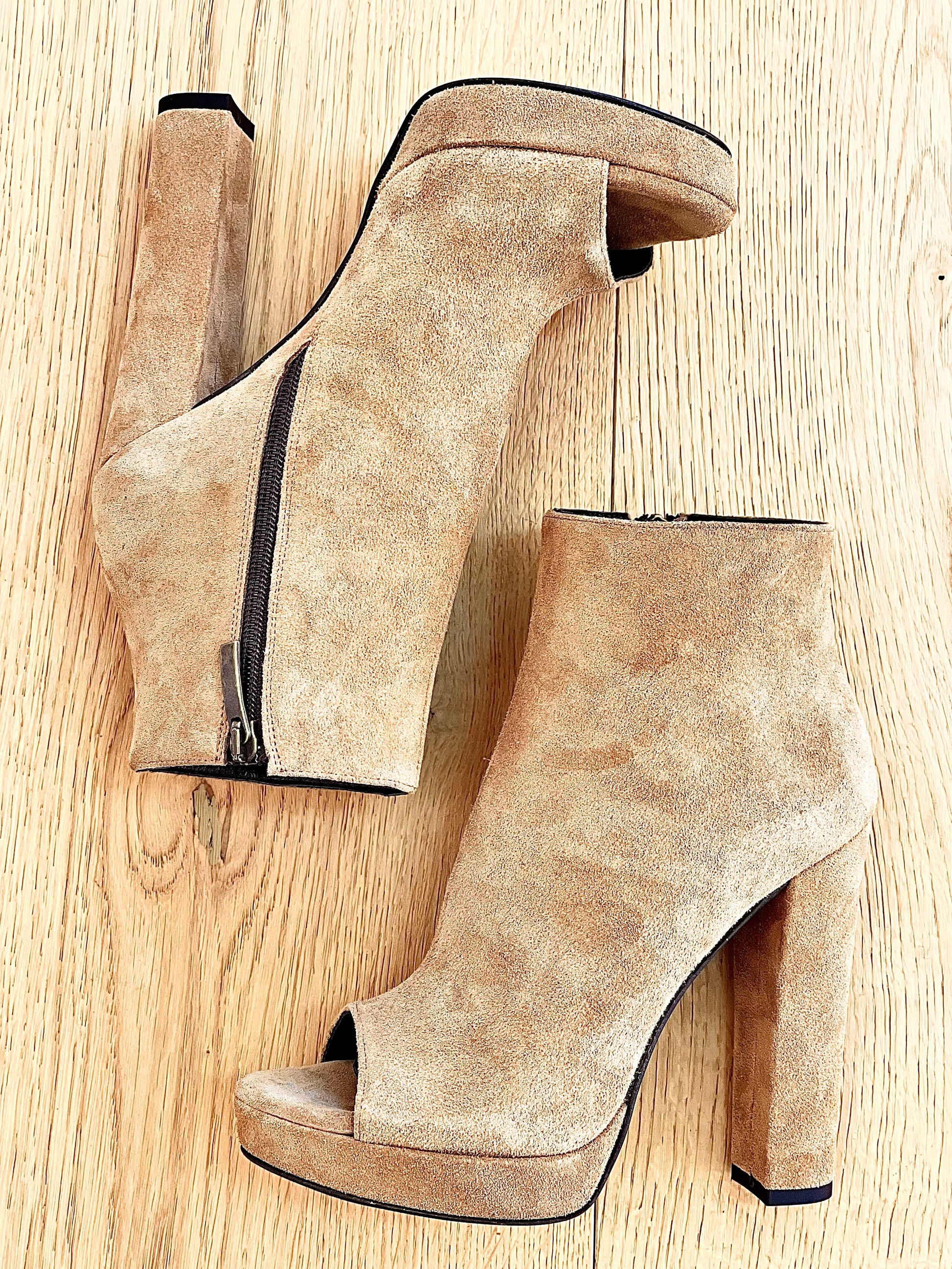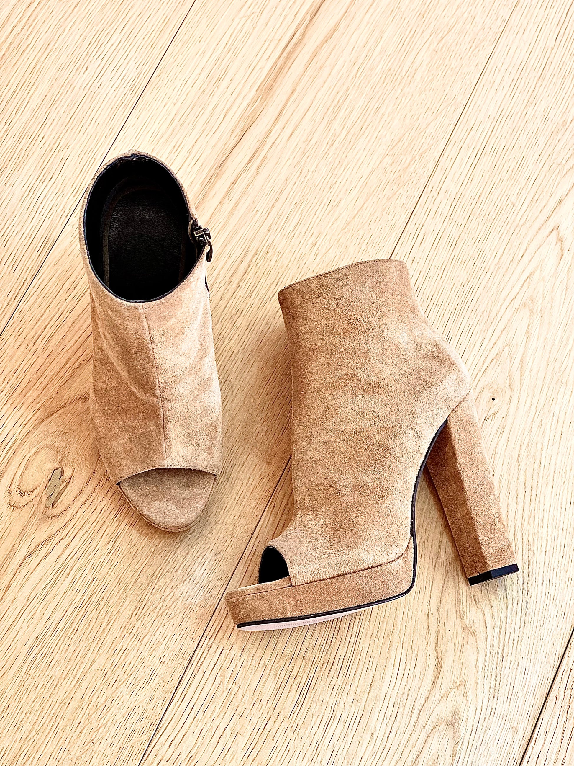 Hoge suède enkellaarsjes met een hak van 12 cm en een plateau van 2 cm.
