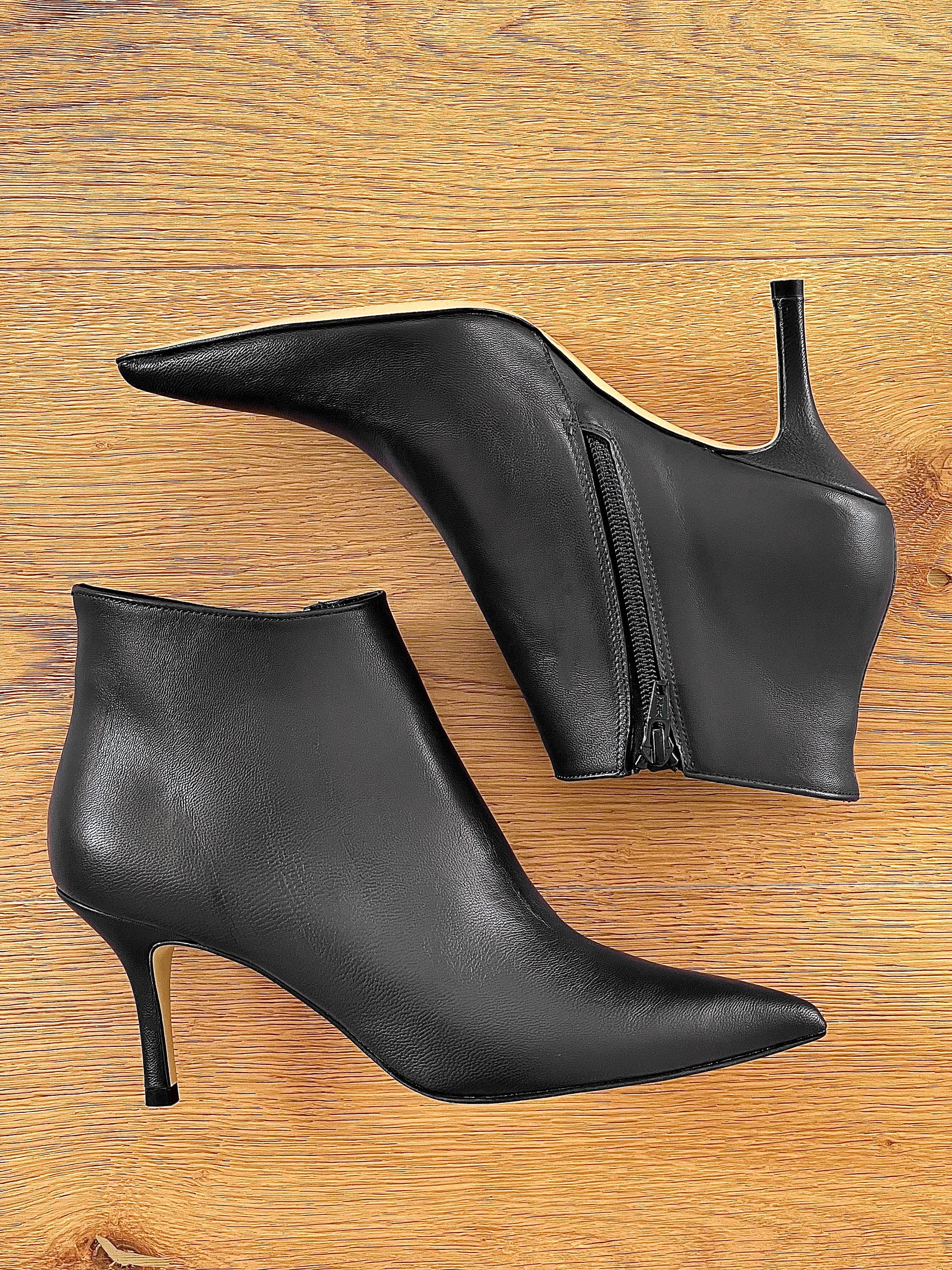 Spitse enkellaarsjes met een hak van 8 cm.