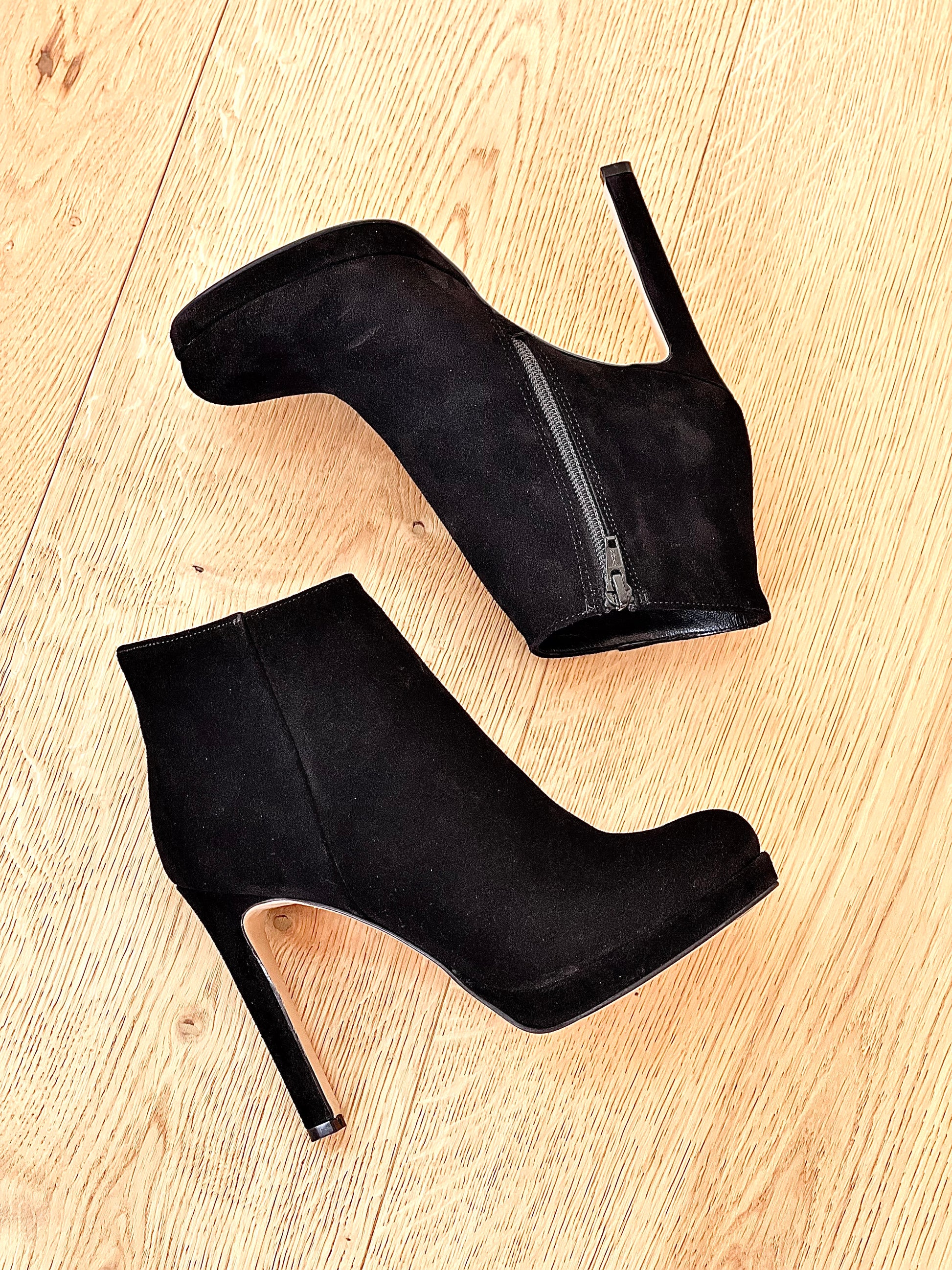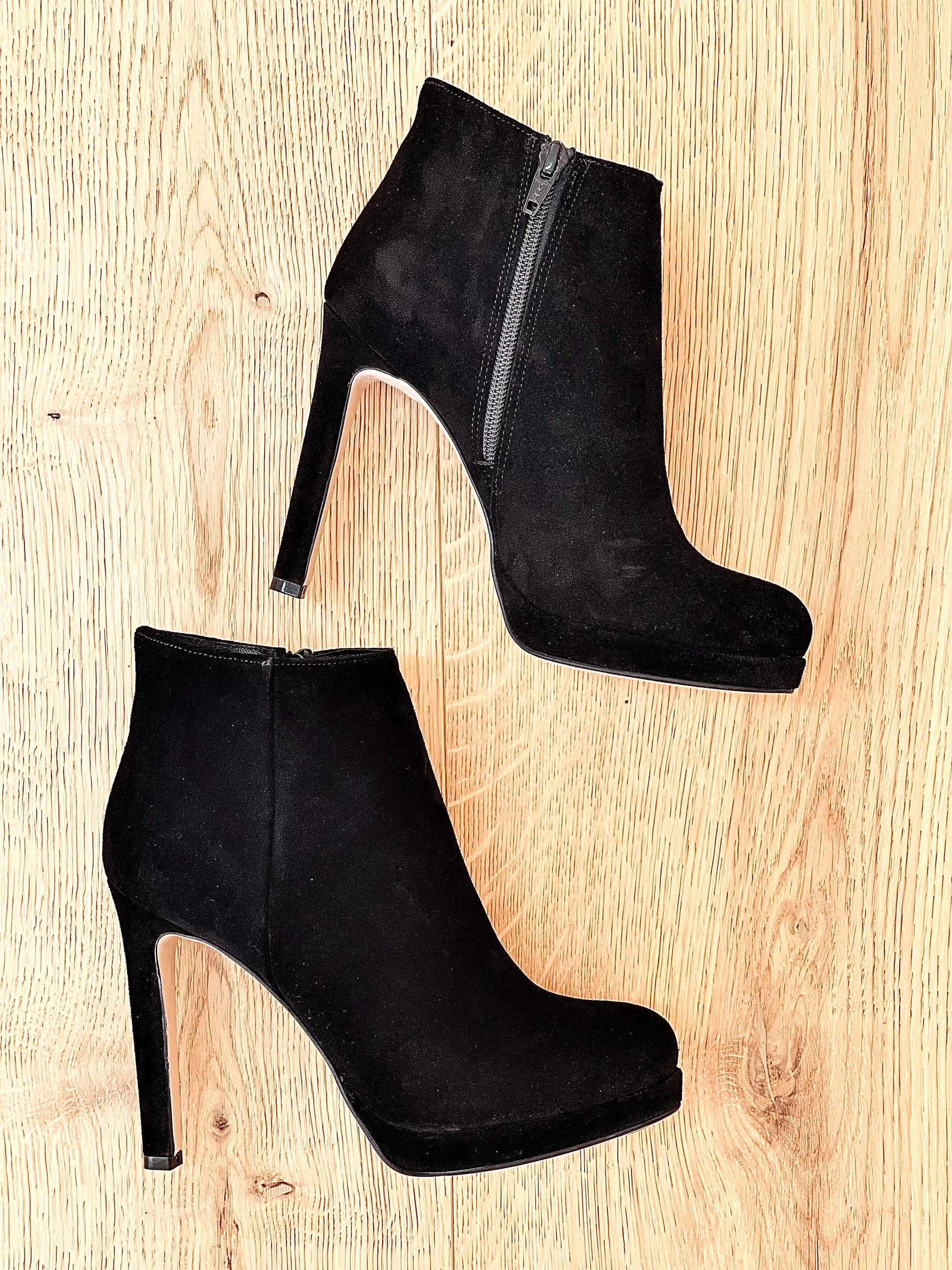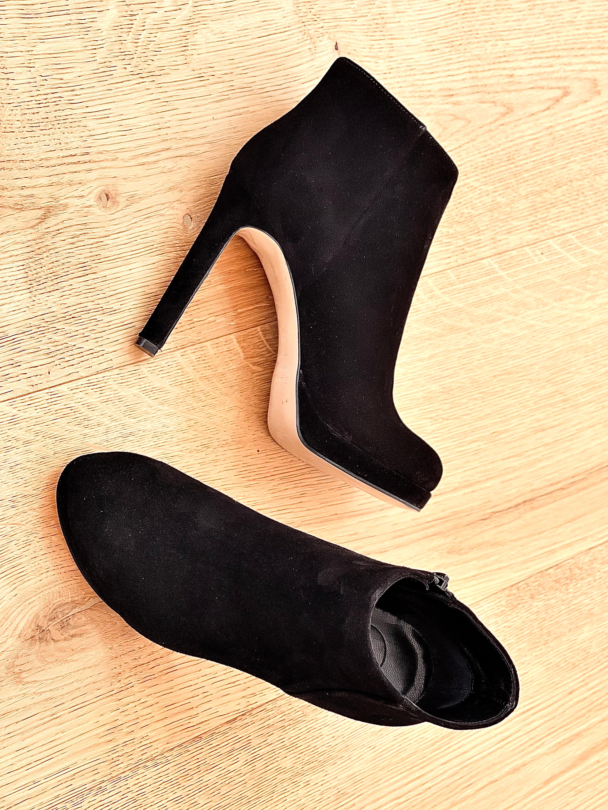 Suède enkellaarsjes met ronde neus, plateau en hoge hak.