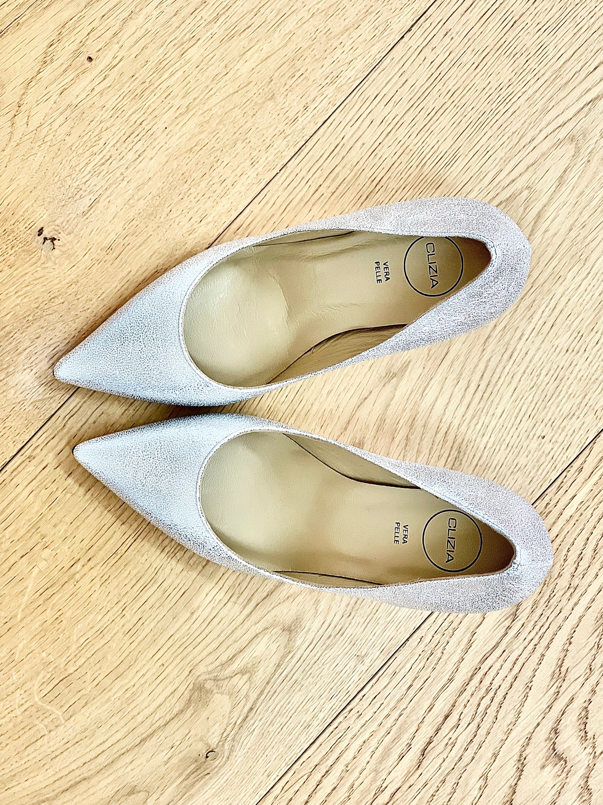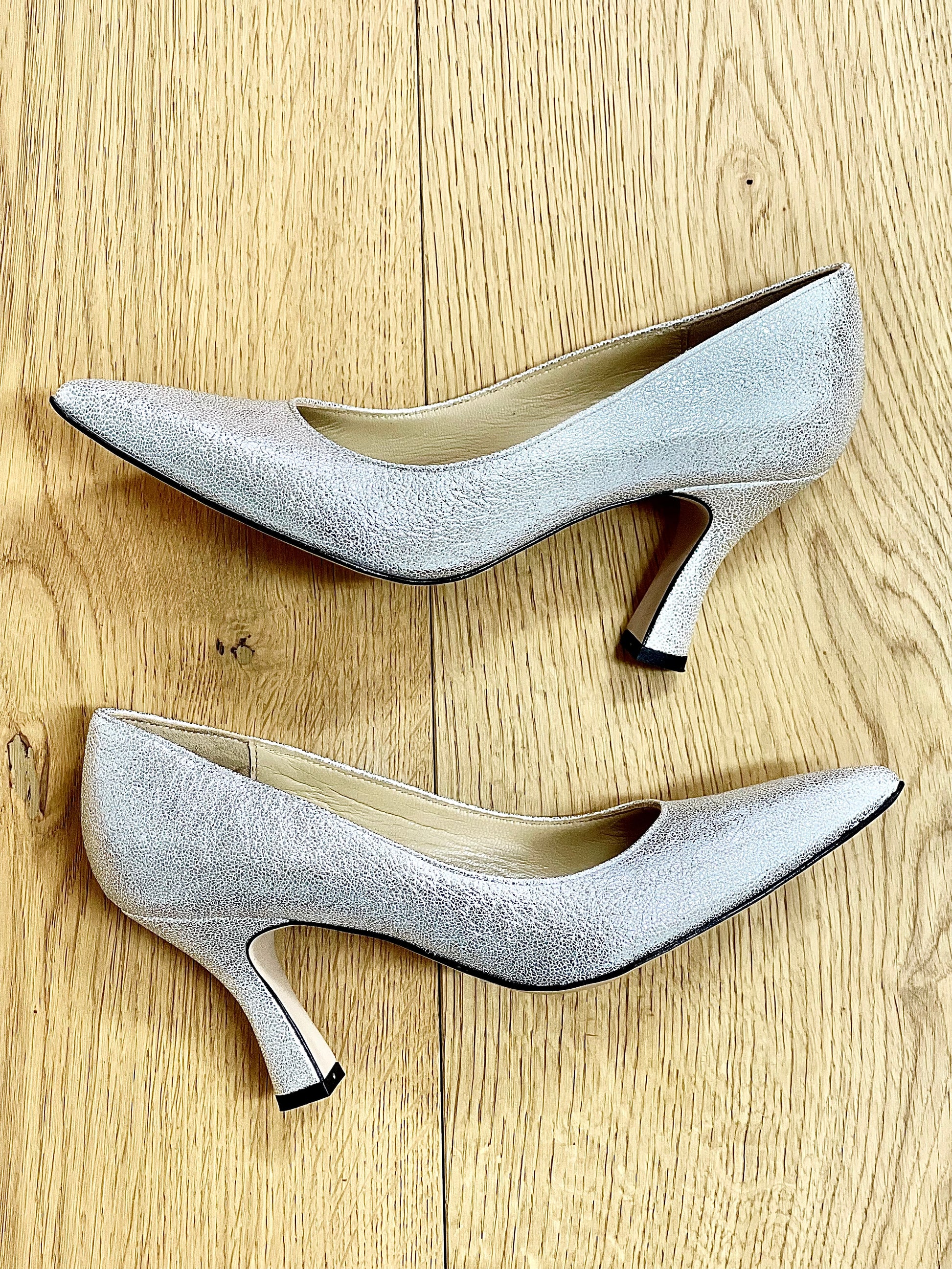 Gelamineerde pumps met spitse teen en een hak van 8 cm.