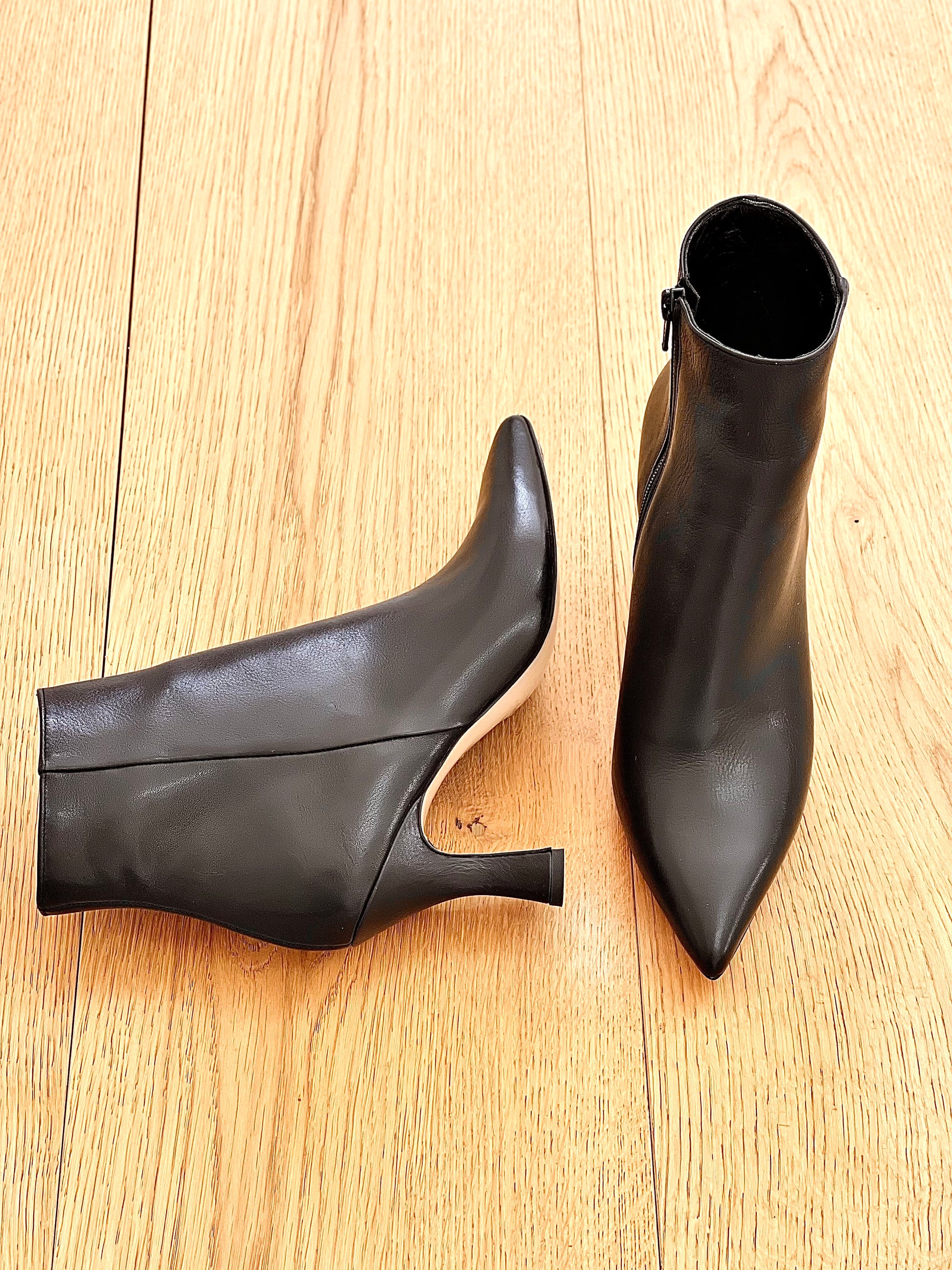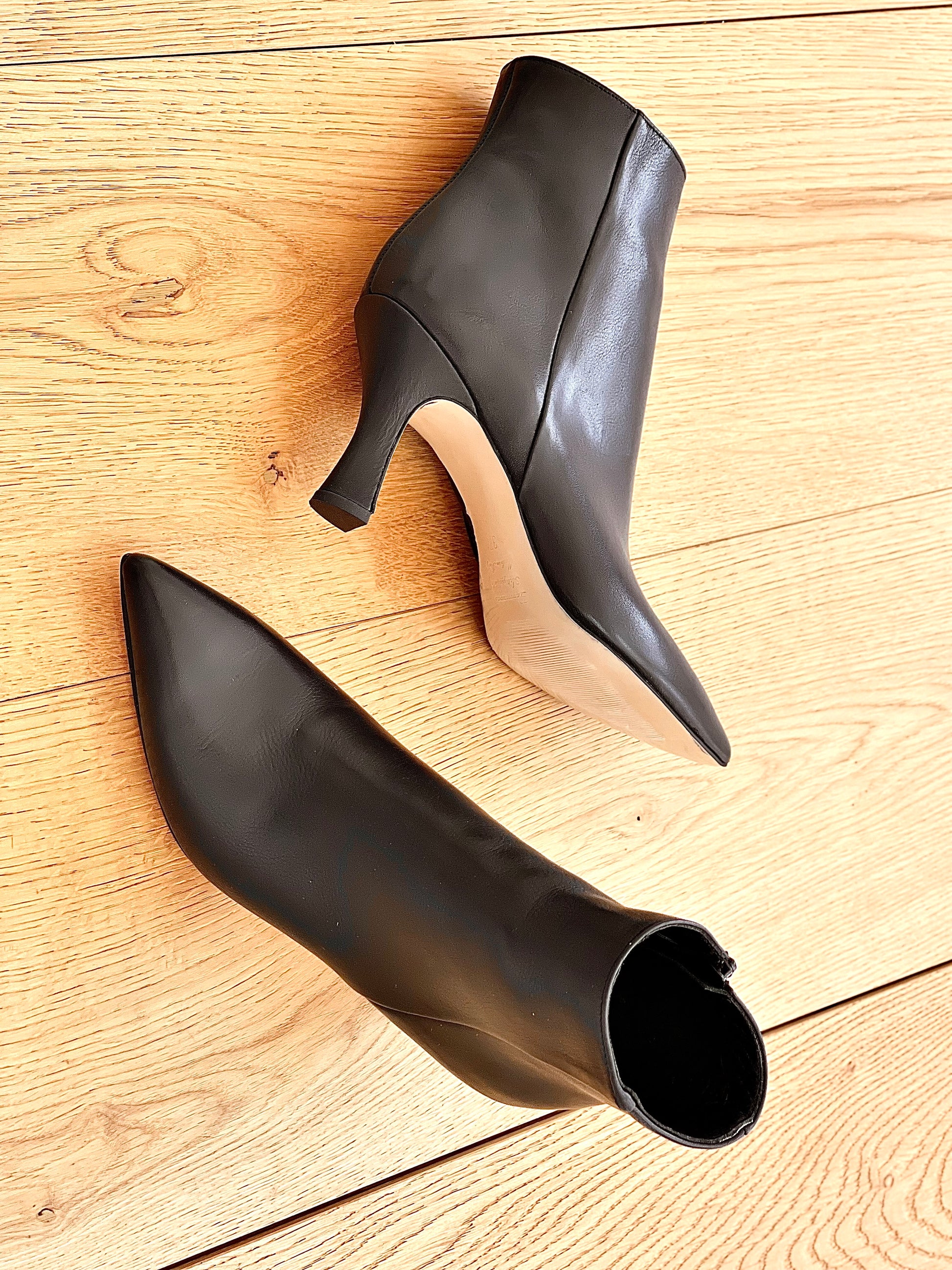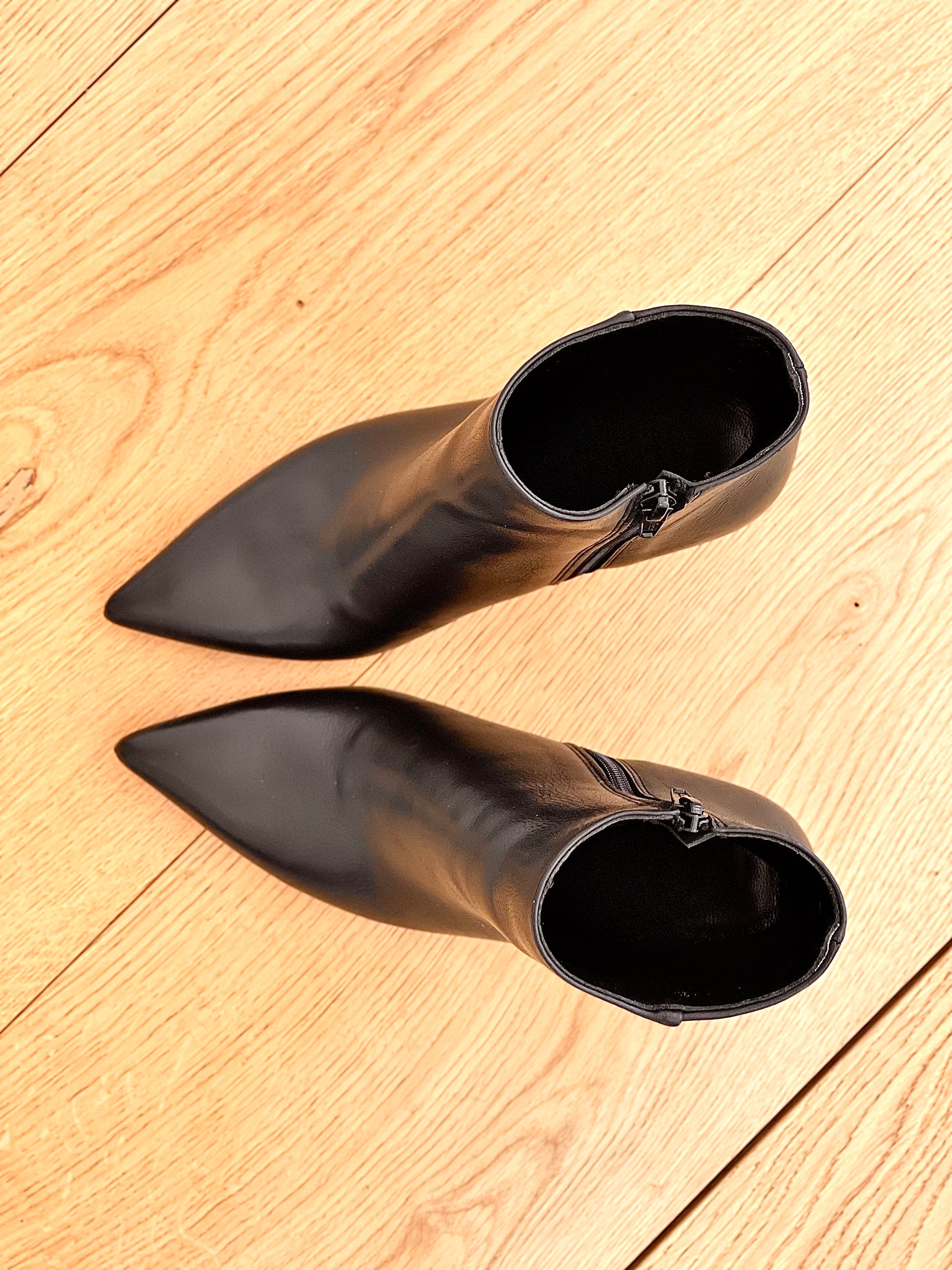 Leren enkellaarsjes met spitse teen en een hak van 8 cm.