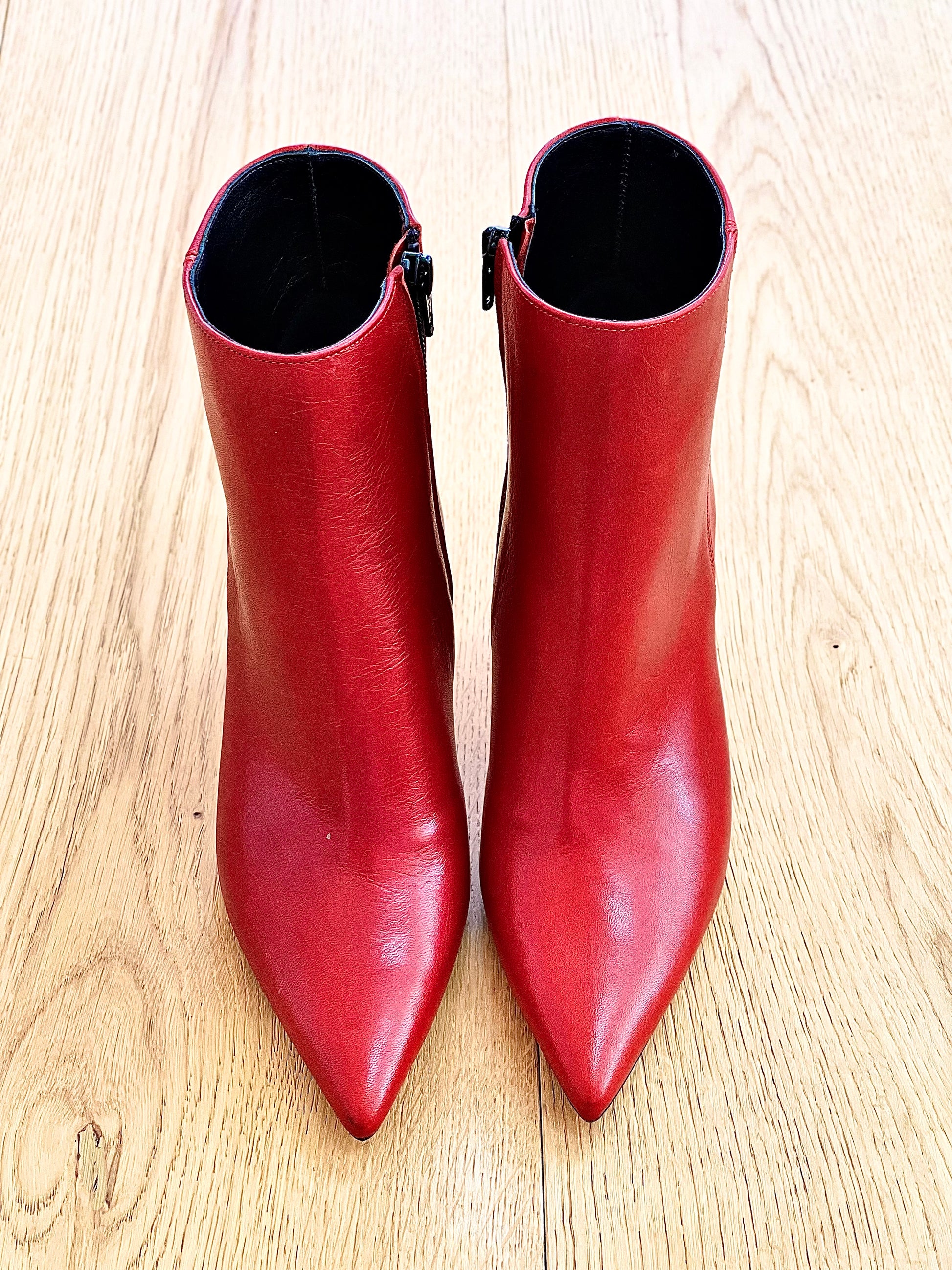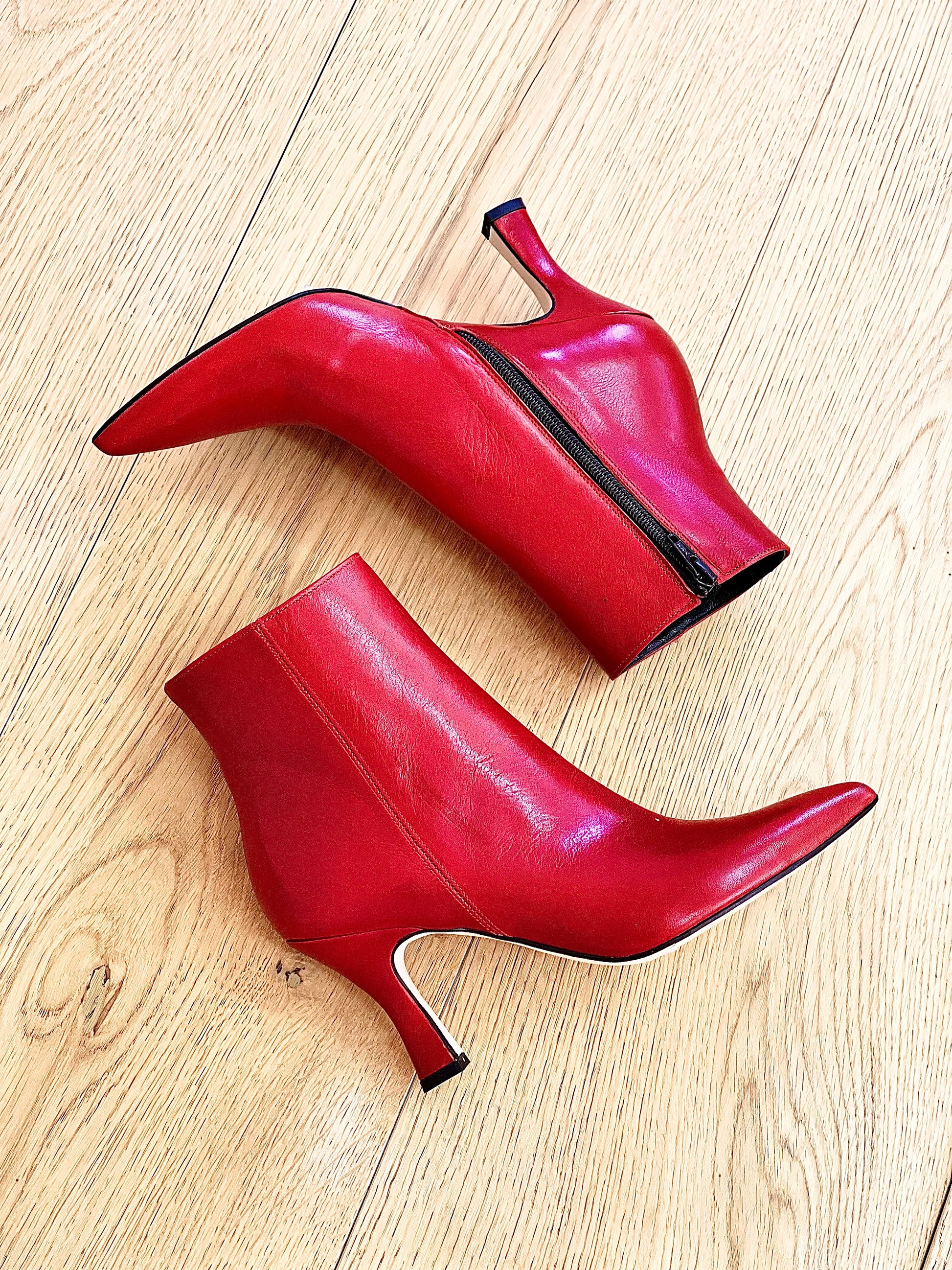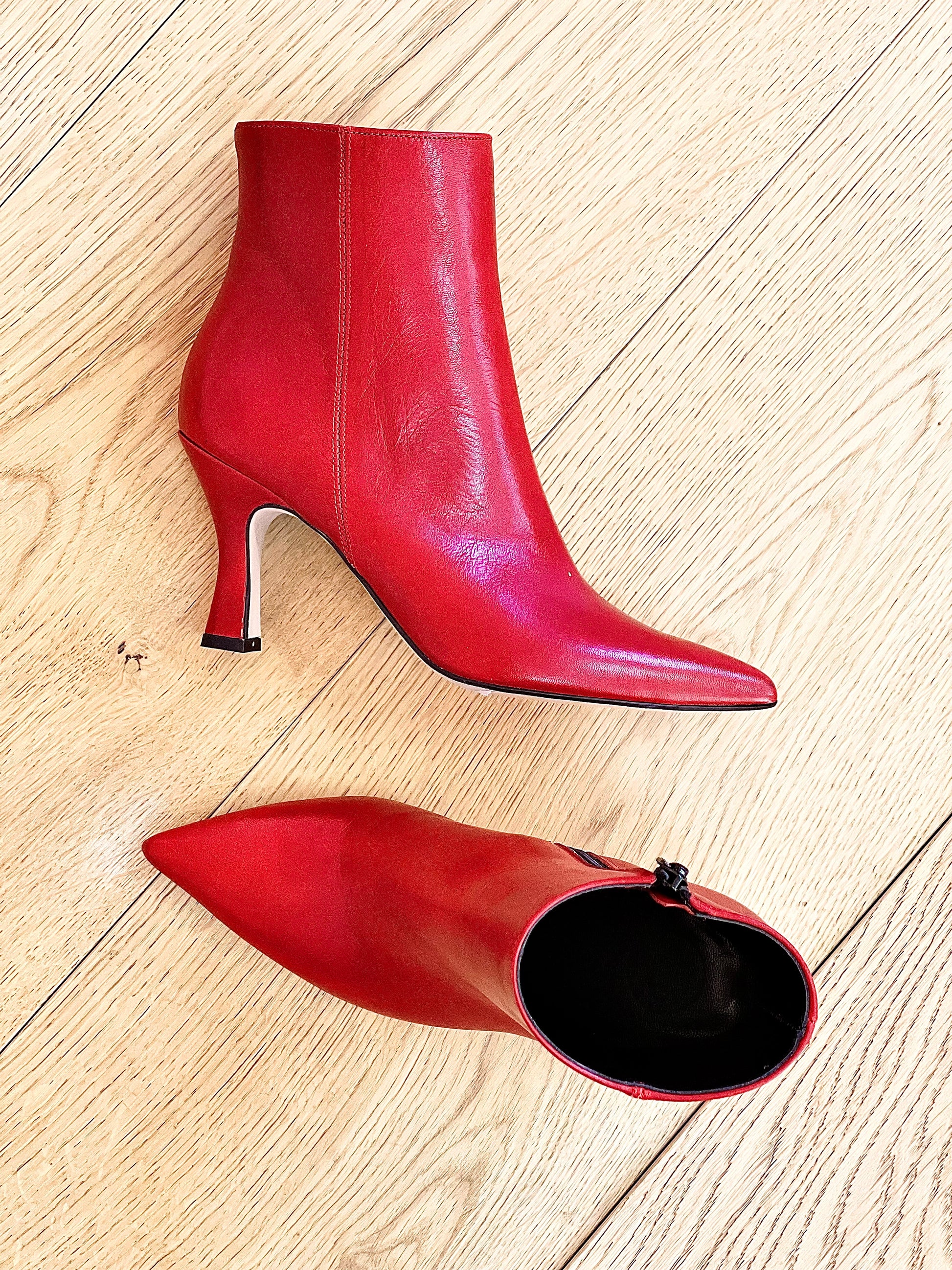 Leren enkellaarsjes met spitse teen en een hak van 8 cm.