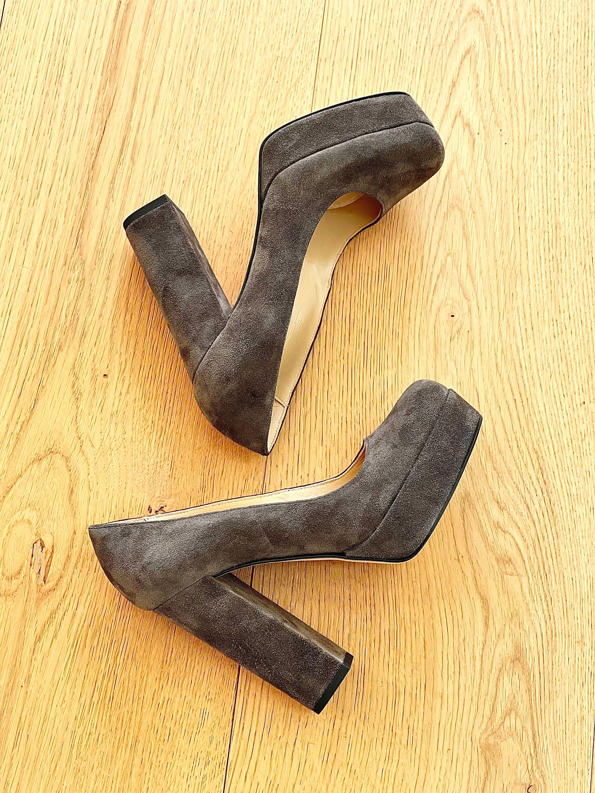 Halfhoge puntige suède pumps met brede hak en plateau.