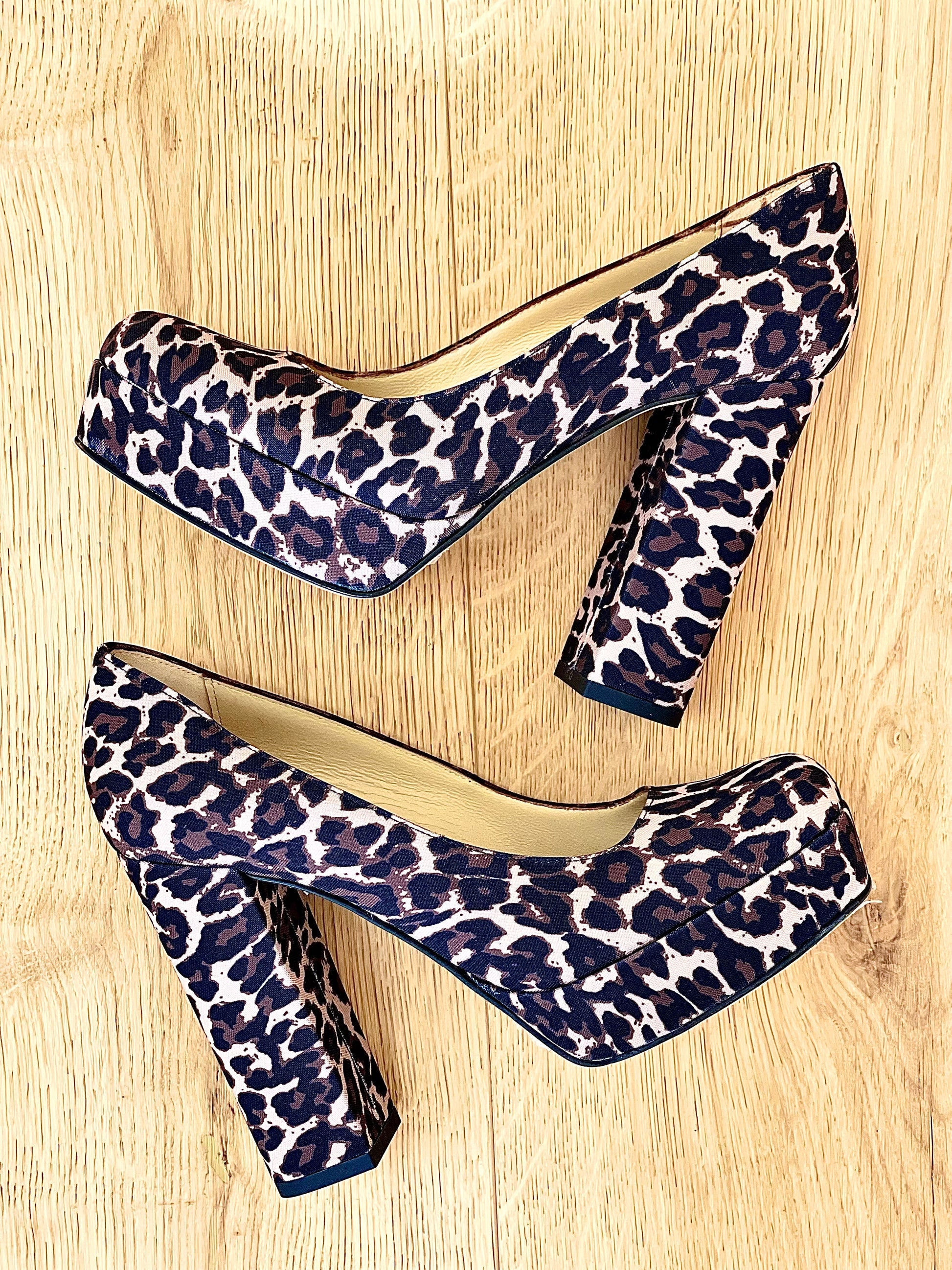 Halfhoge spitse pumps met brede dierenhak en plateau.