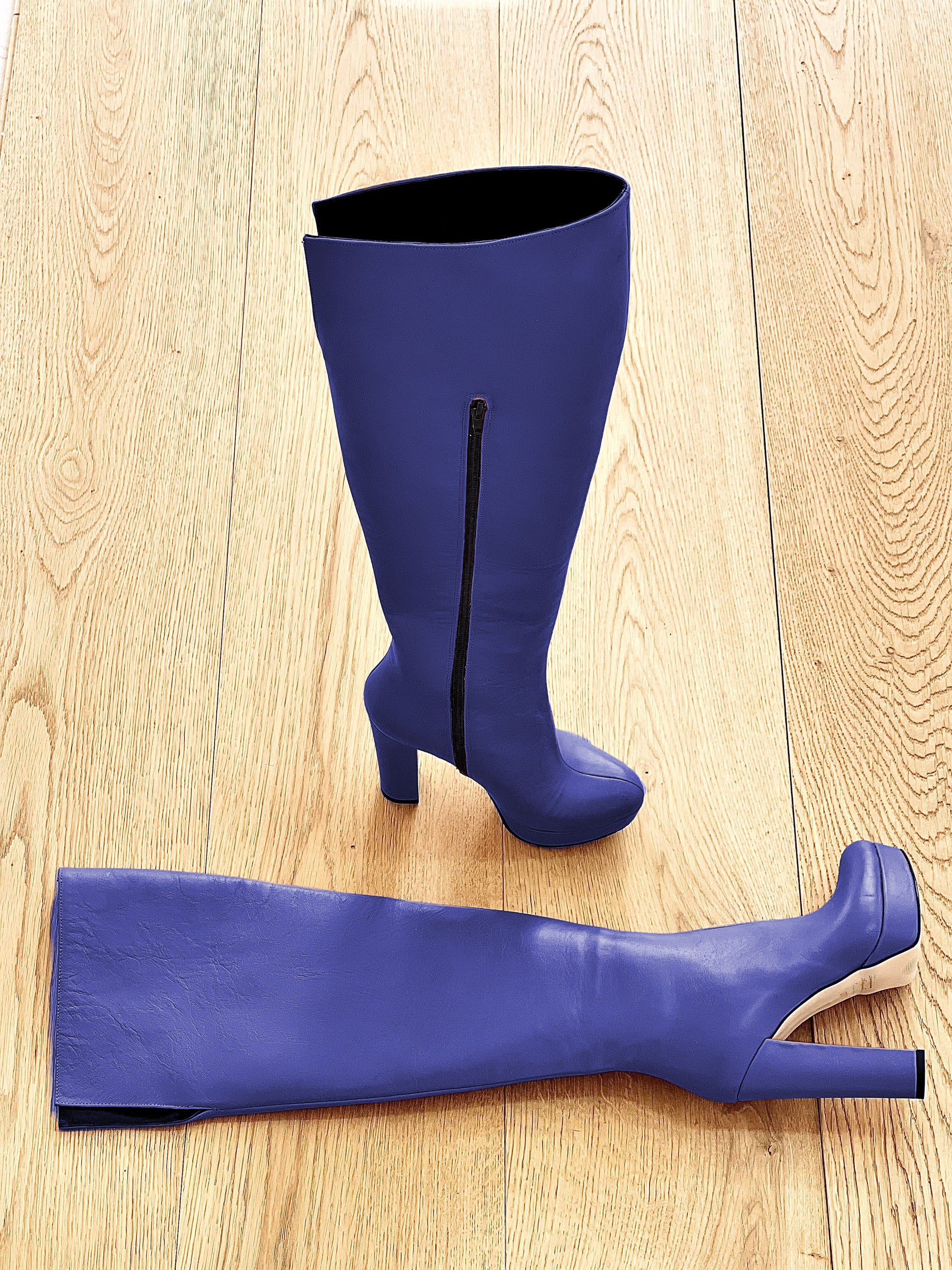 Hoge over-de-knielaarzen met ronde neus, brede hak en plateau.