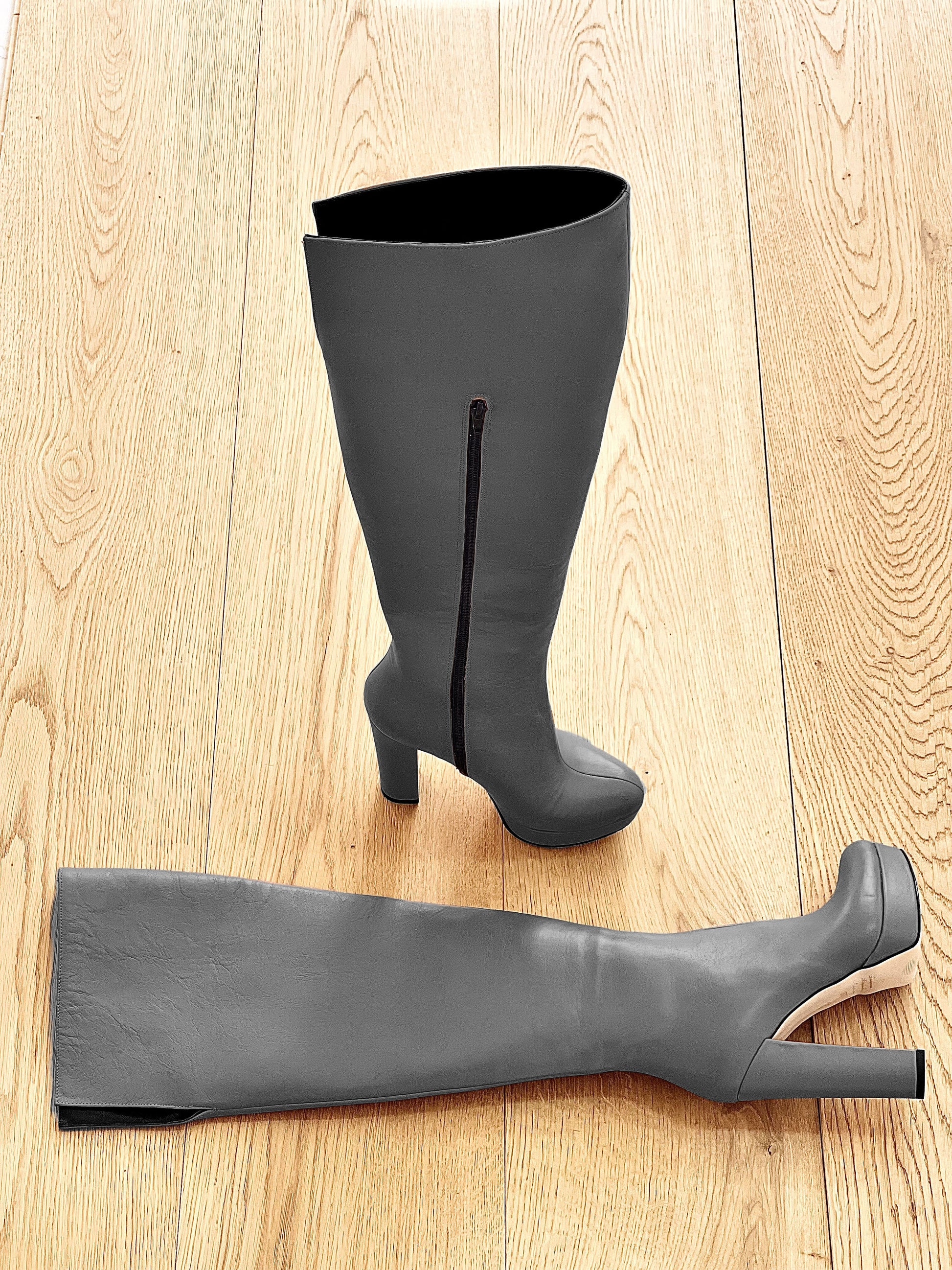 Hoge over-de-knielaarzen met ronde neus, brede hak en plateau.