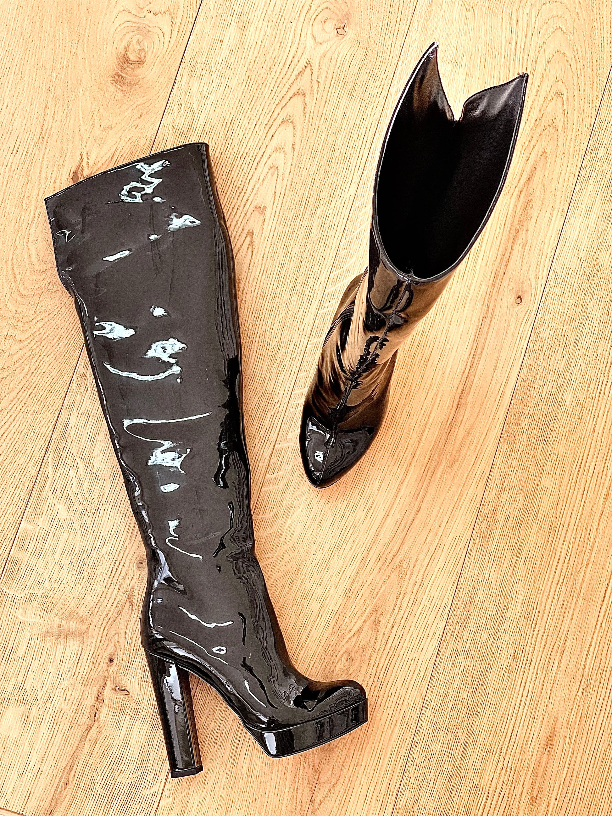 Over-de-knie hoge laarzen met ronde neus van lakleer met brede hak en plateau.