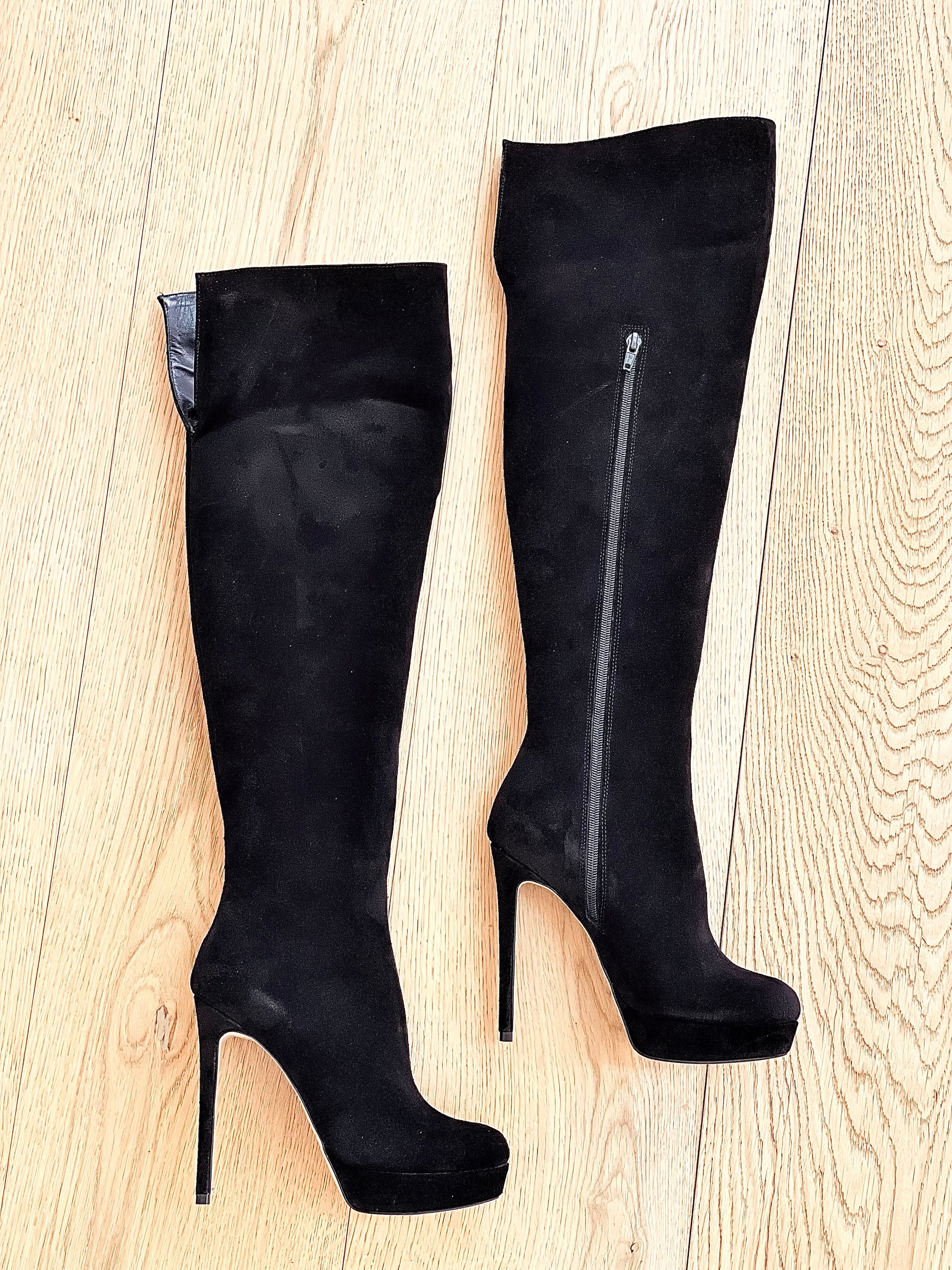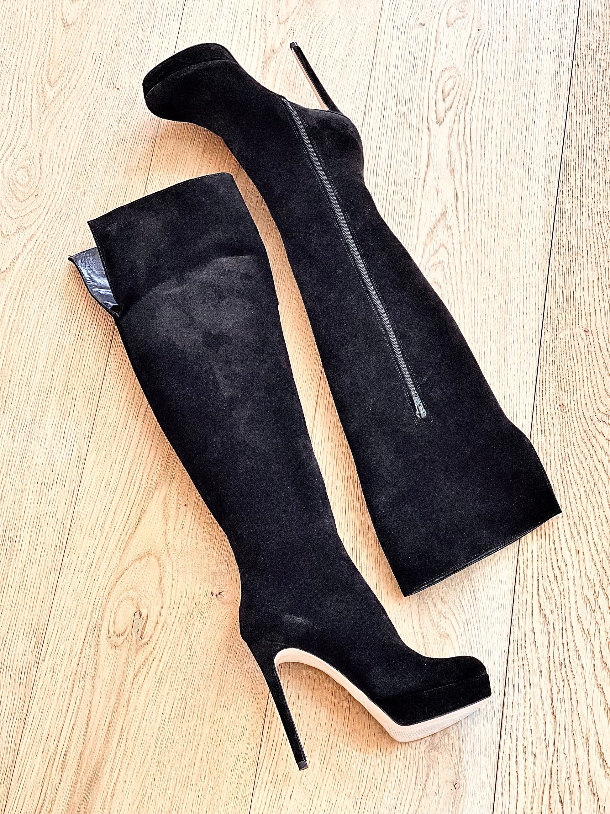 Hoge laarzen over de knie met ronde teen en suède plateauhak.