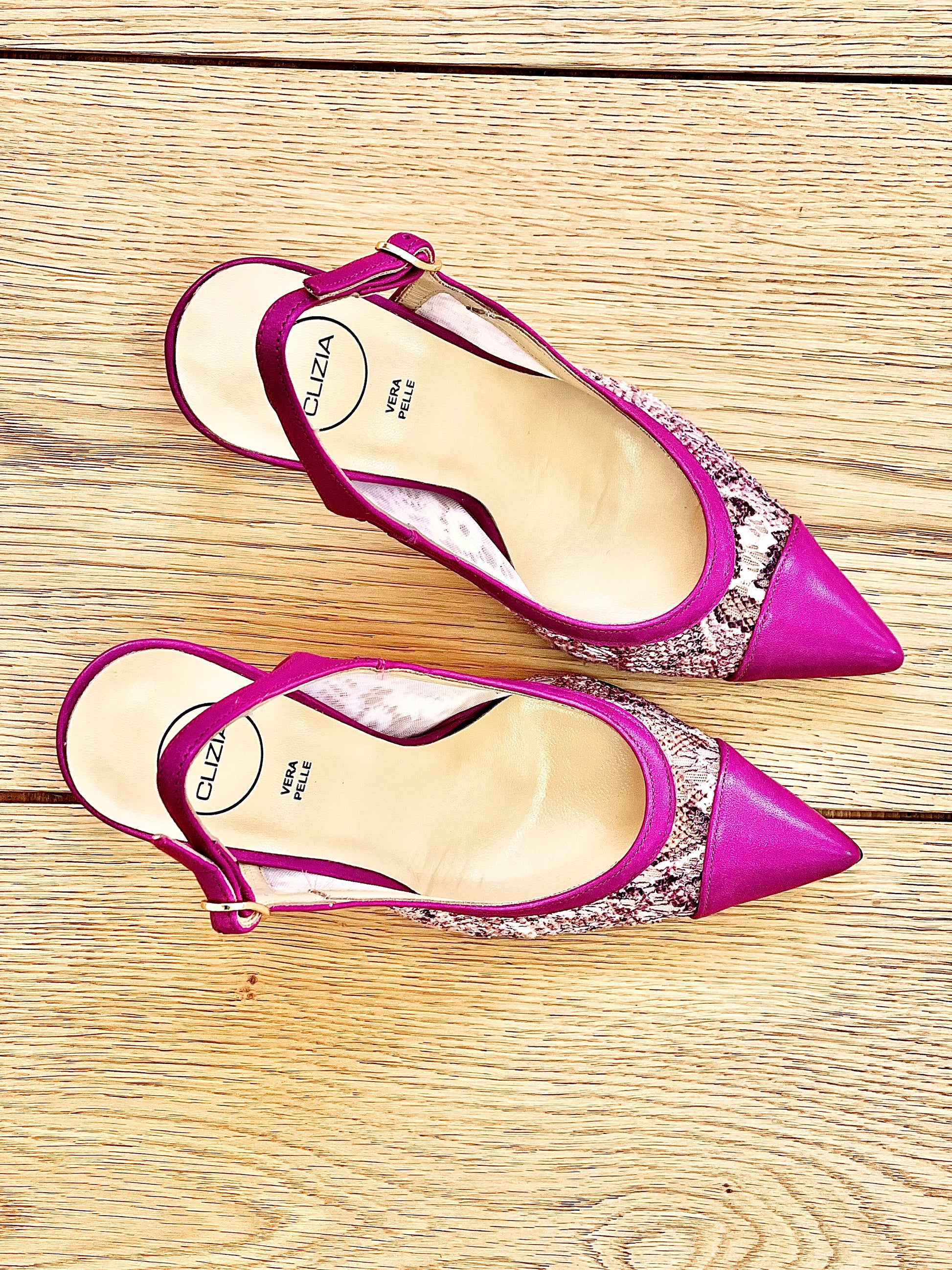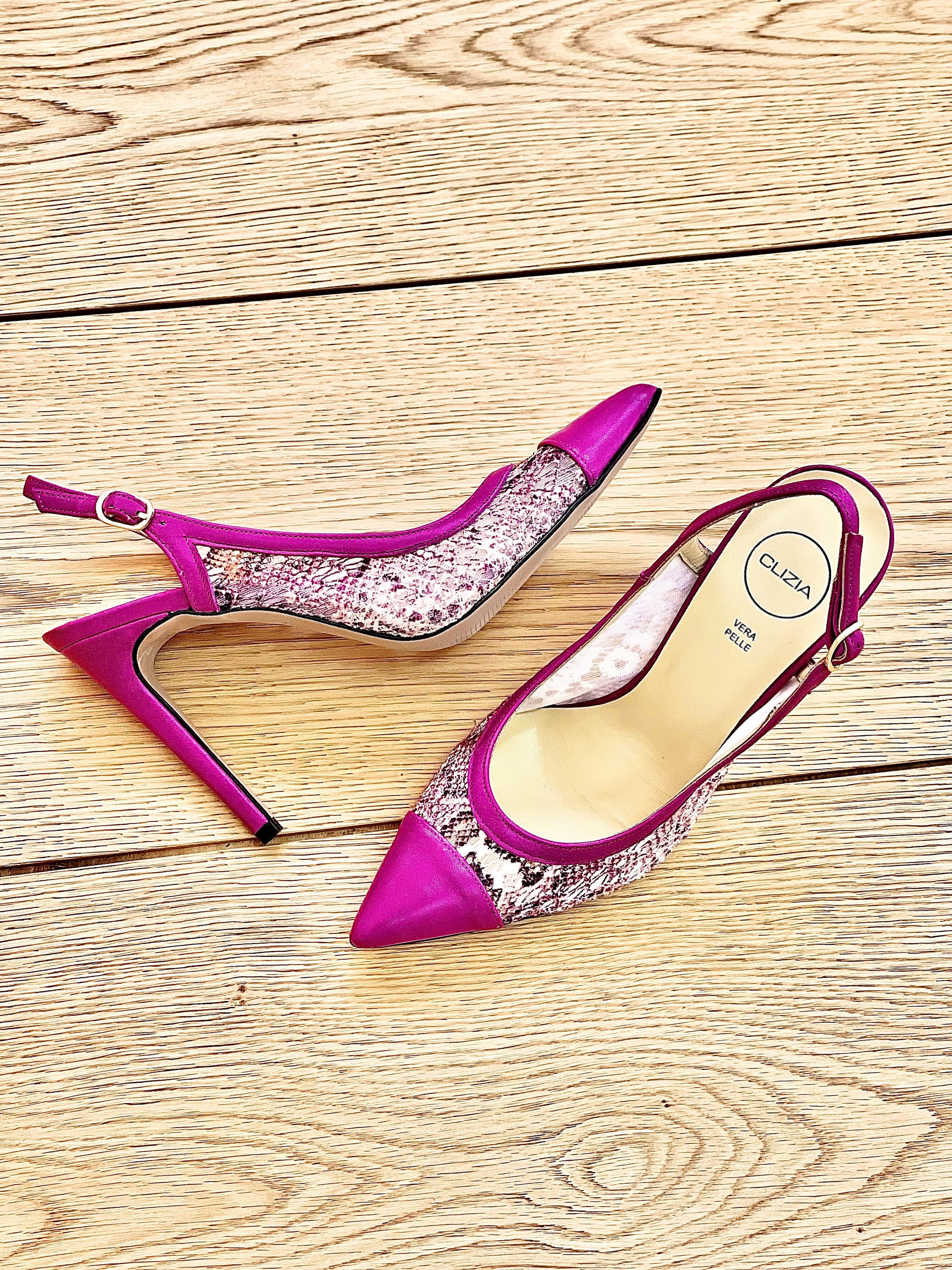 Slingback decolleté met spitse teen van mesh met dierenprint en hoge naaldhak.