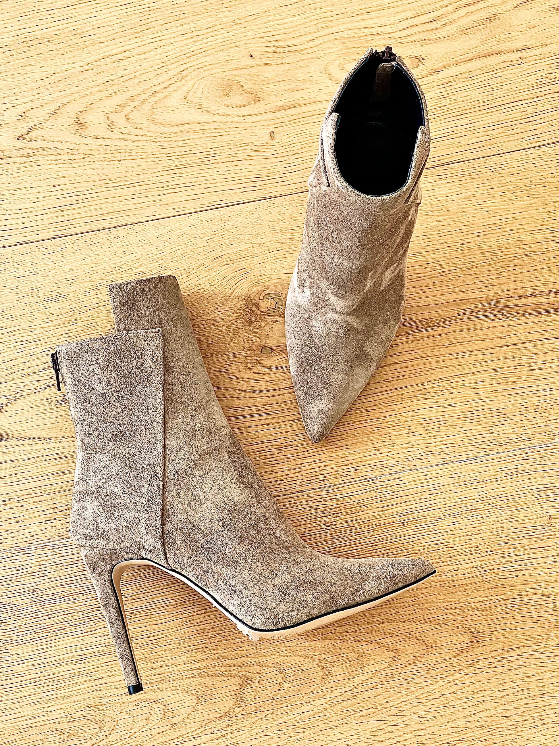 Hoge suède enkellaarsjes met een naaldhak van 10 cm.