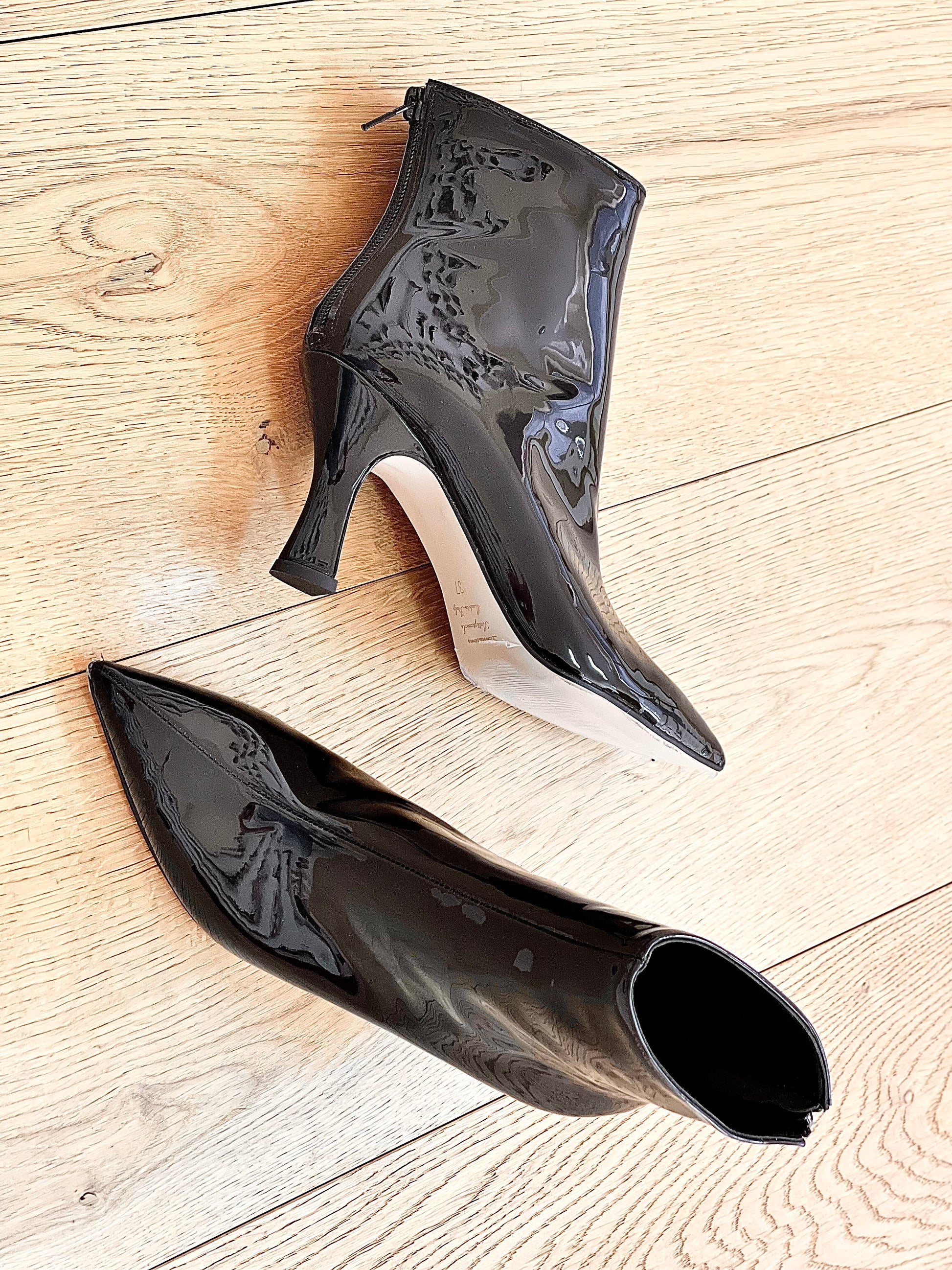Puntige lakleren enkellaarsjes met een hak van 8 cm.