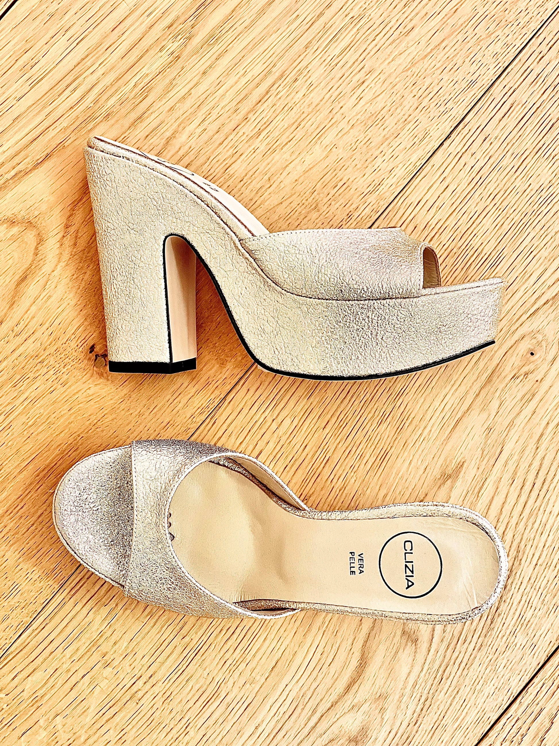 Gelamineerde hoge muiltjes sandalen op sleehak.