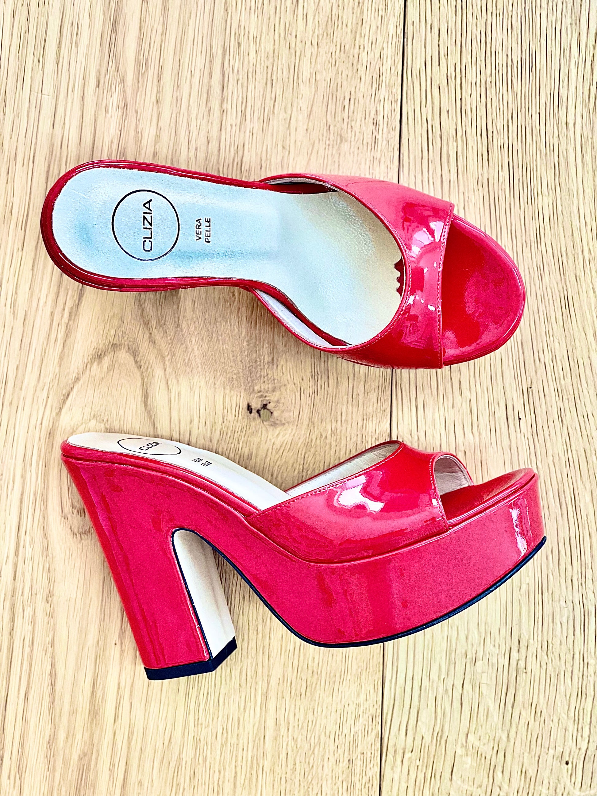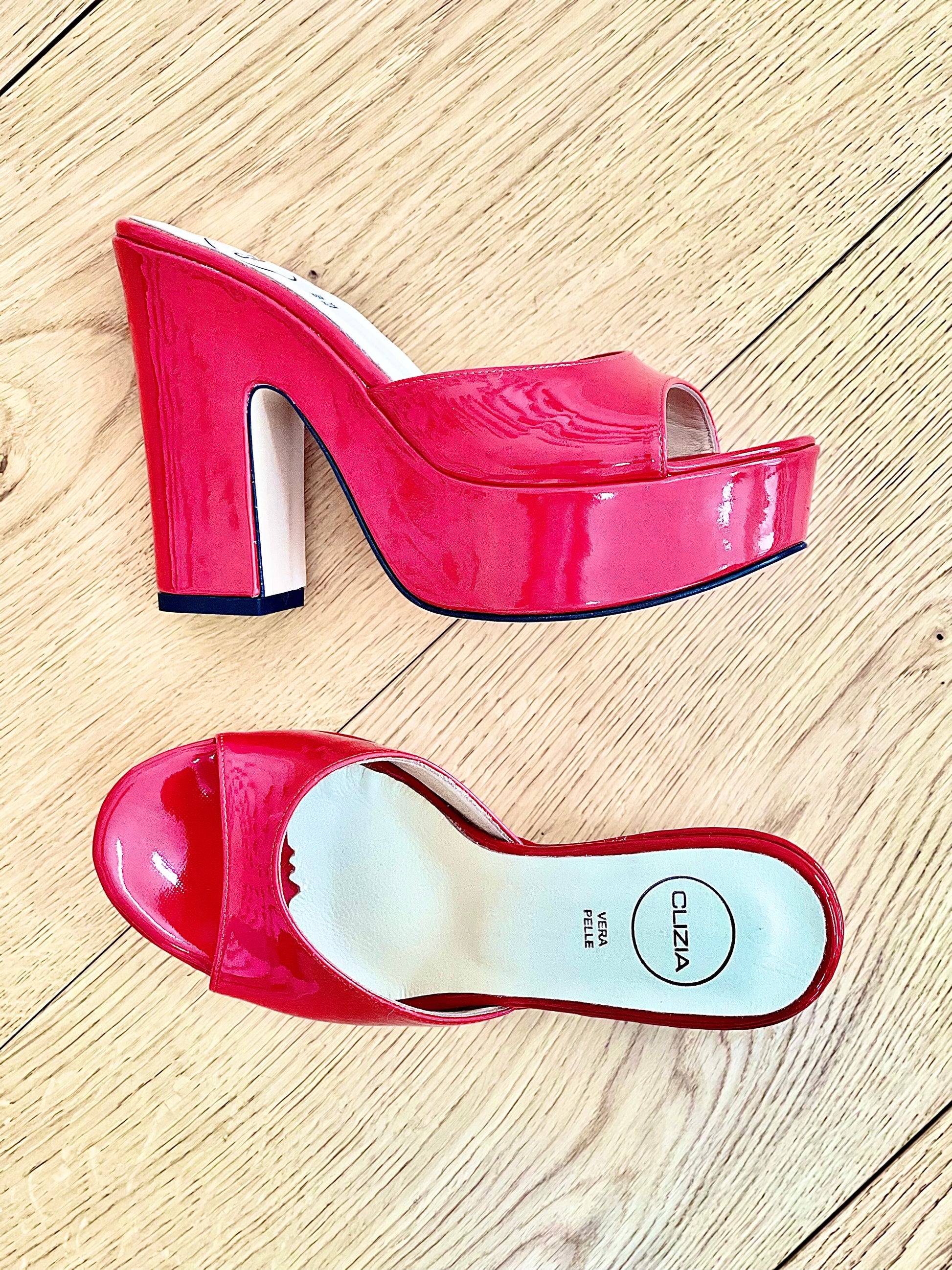 Hoge muiltjes in lakleer op sleehak.