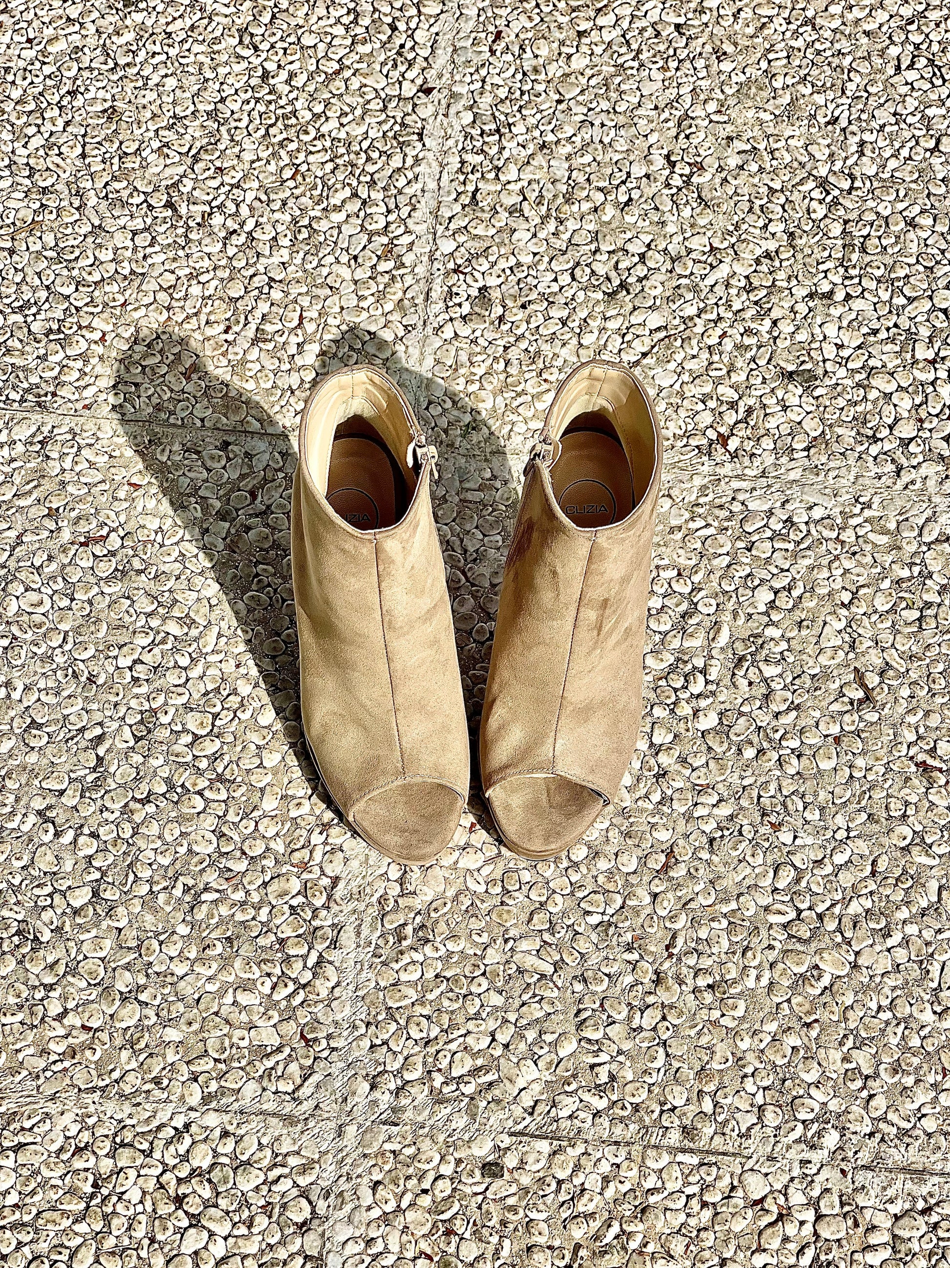 Suède enkellaarsjes met 12 cm hoge hak en 2 cm plateau.