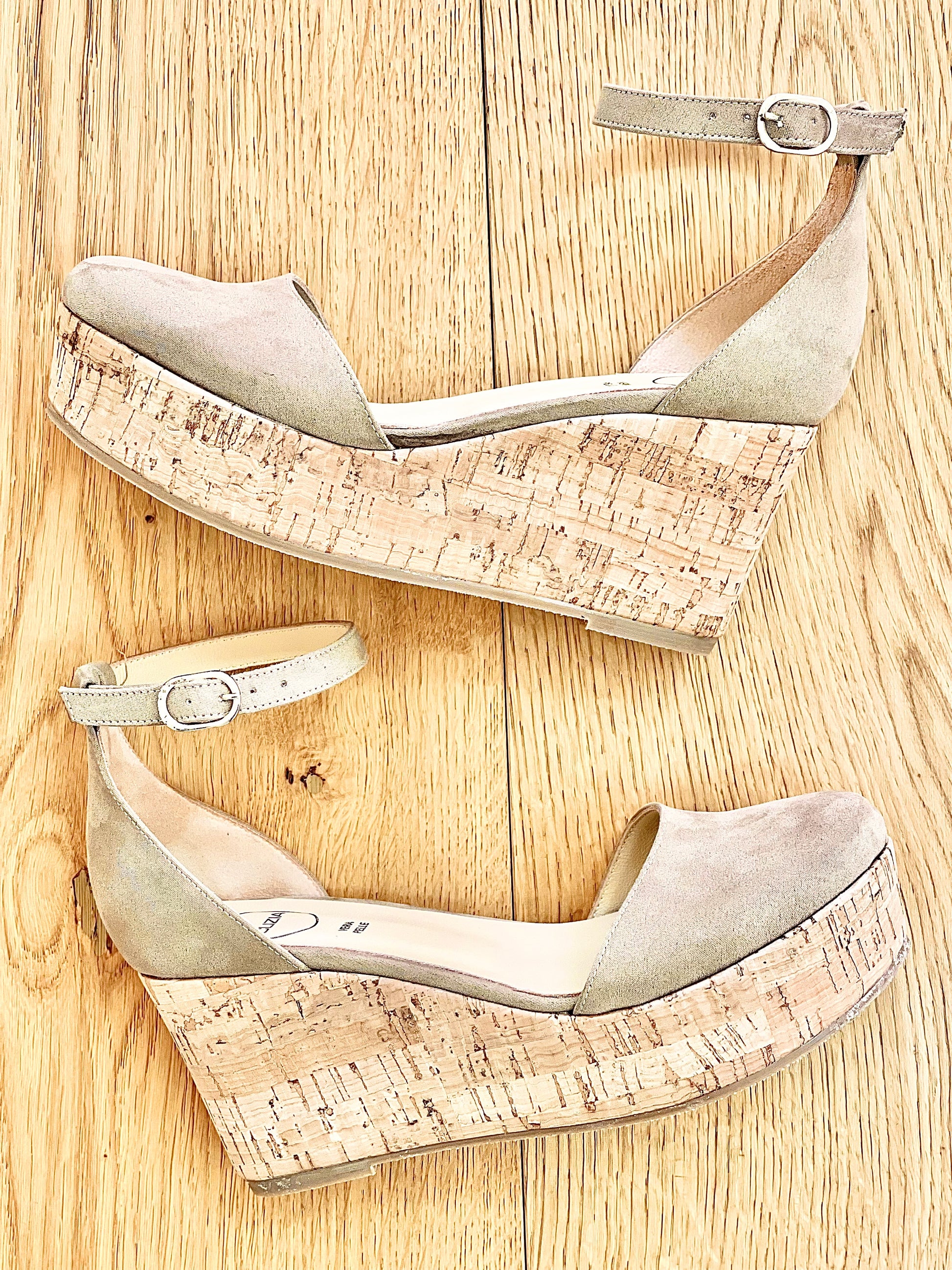 Suède teen en hiel decolleté op middelhoge kurken sleehak.