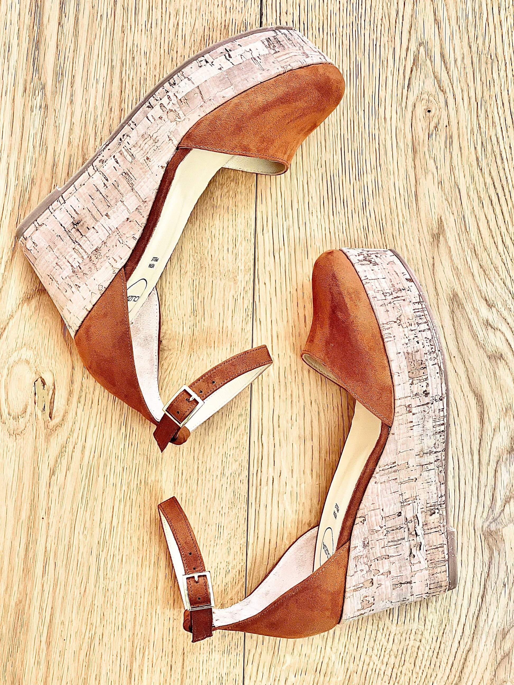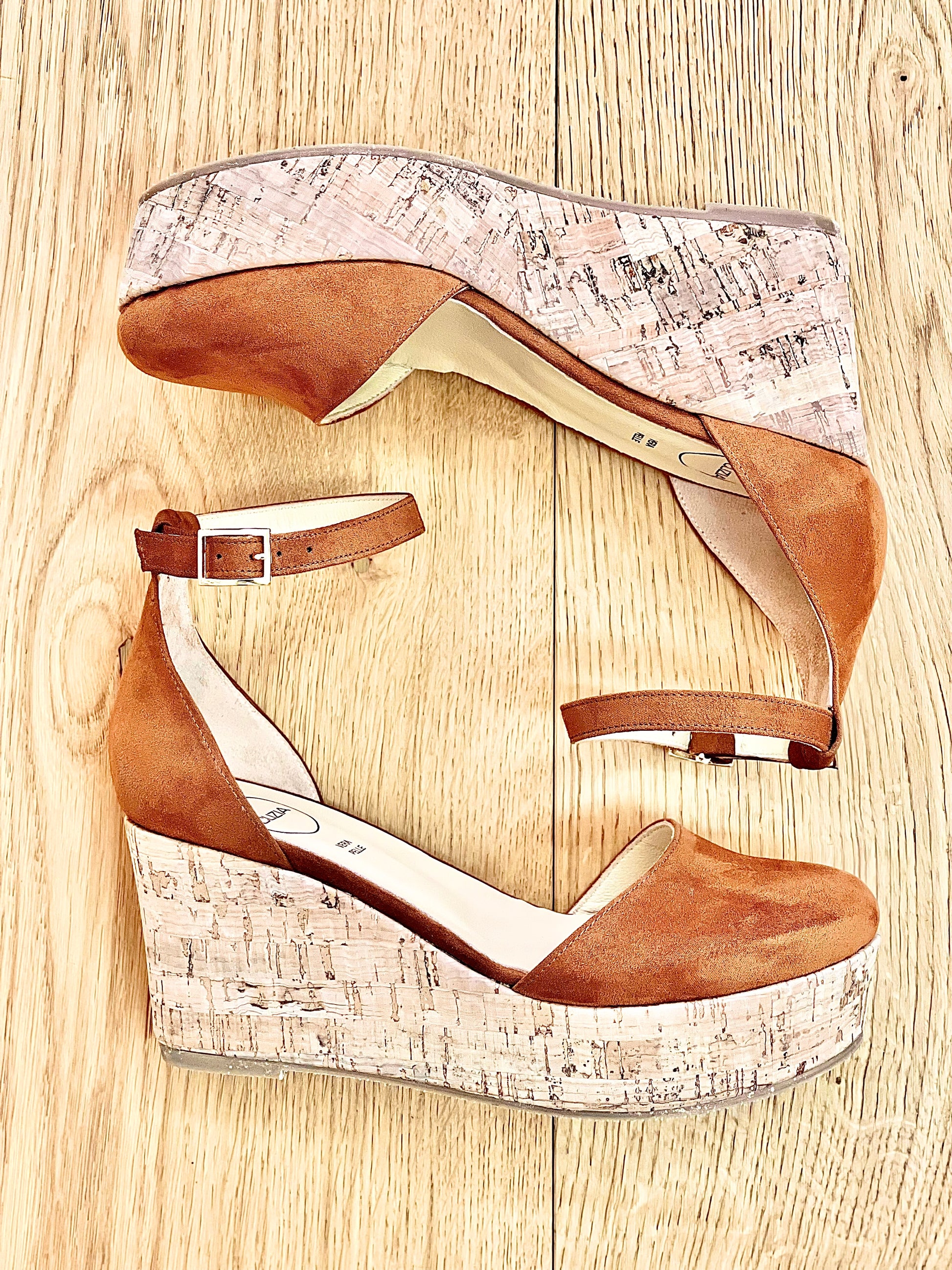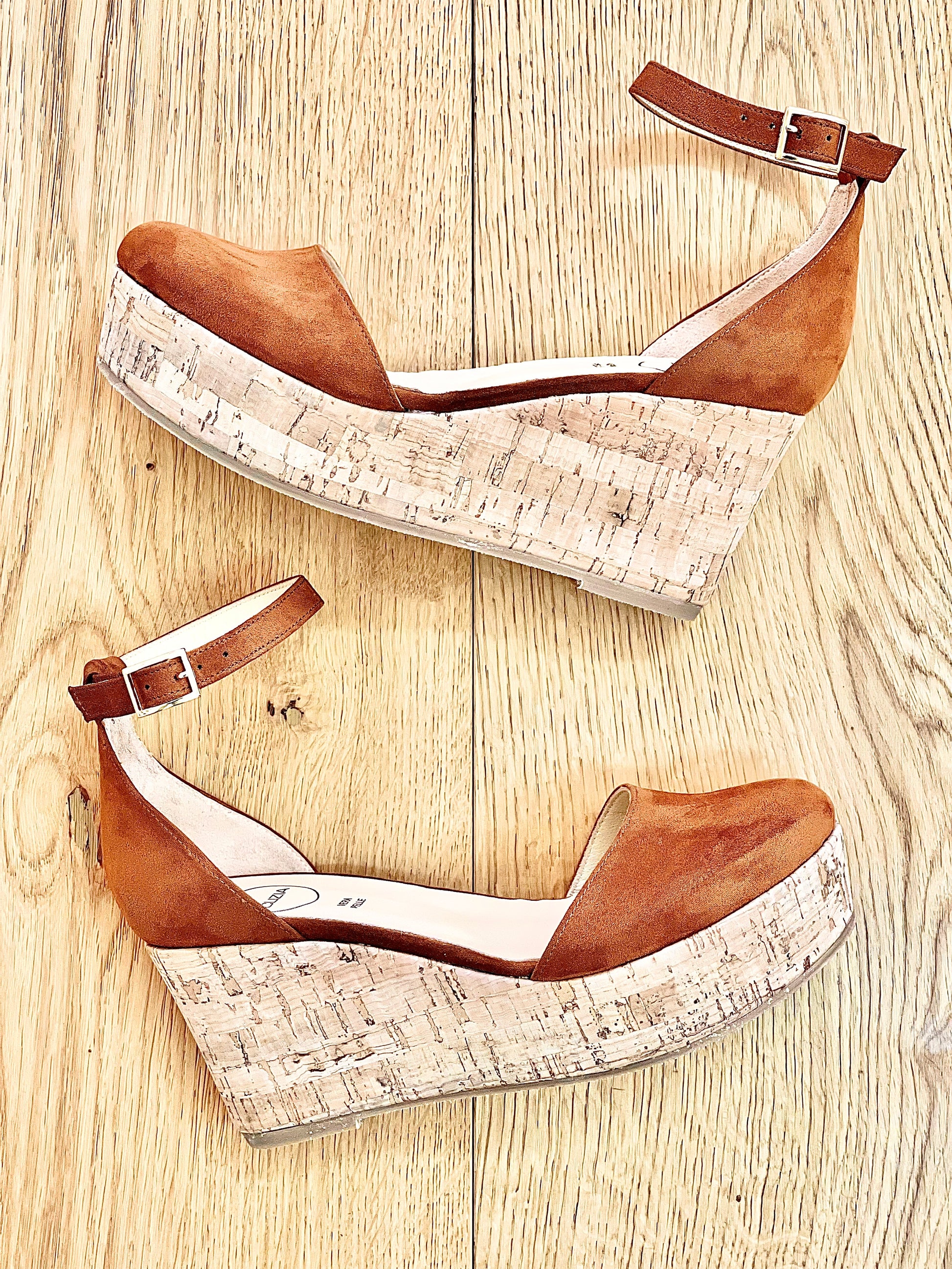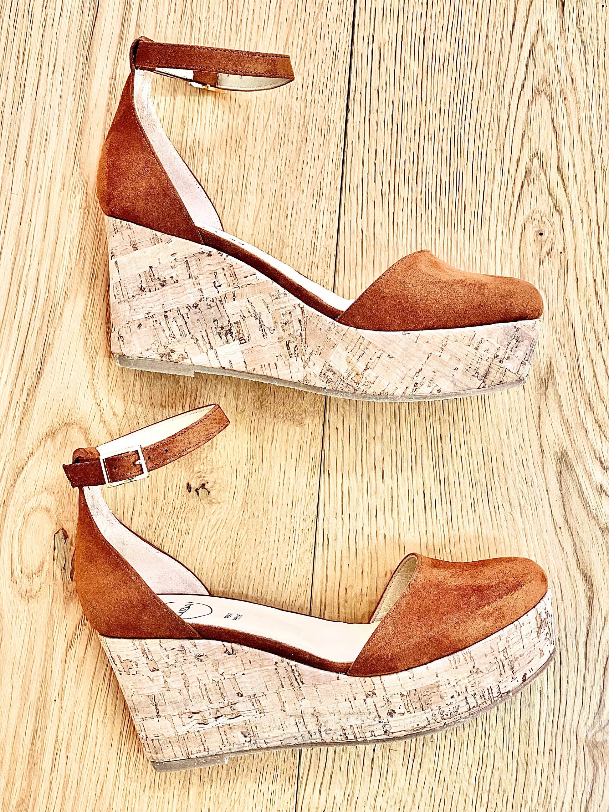 Suède teen en hiel decolleté op middelhoge kurken sleehak.