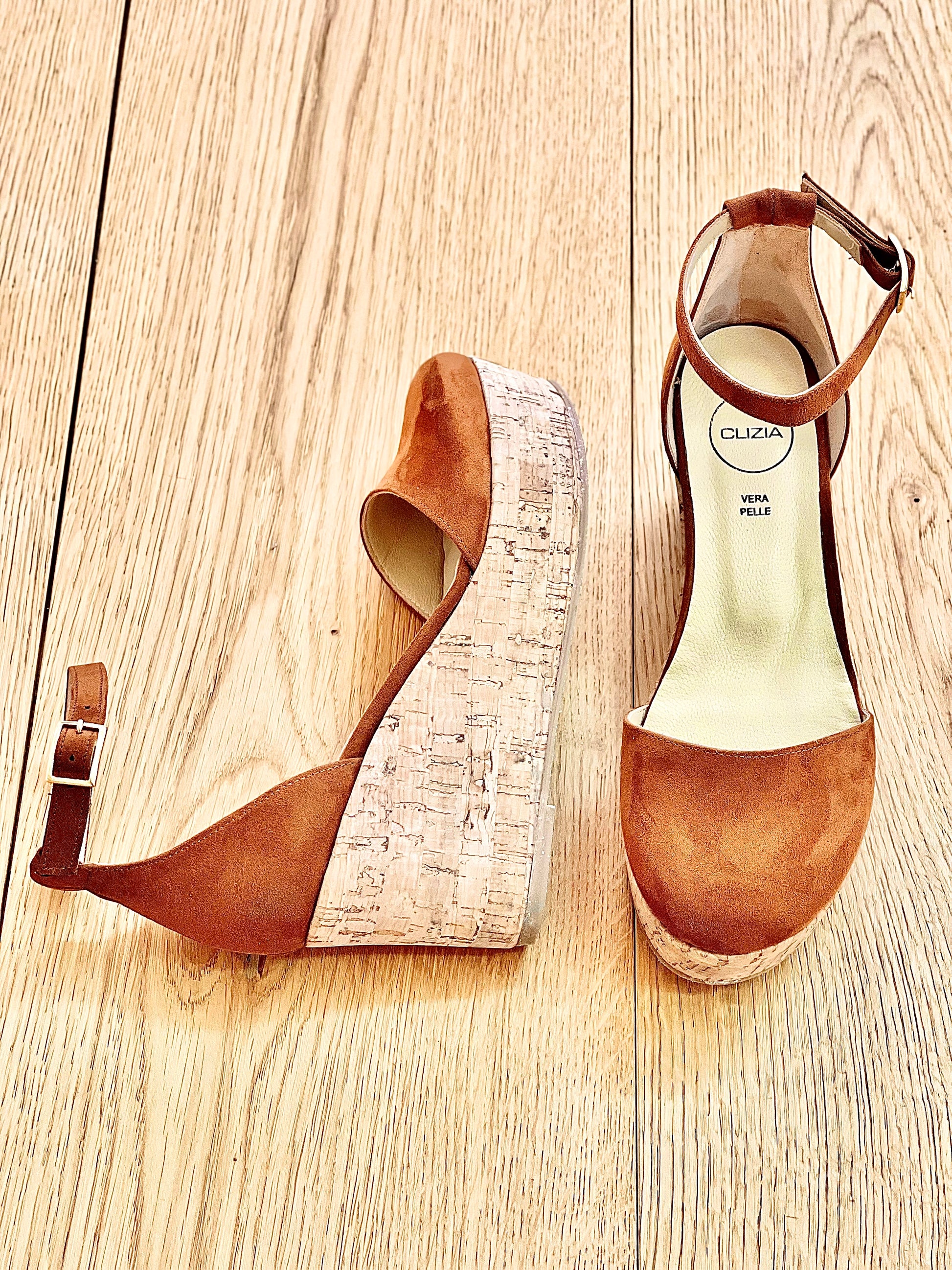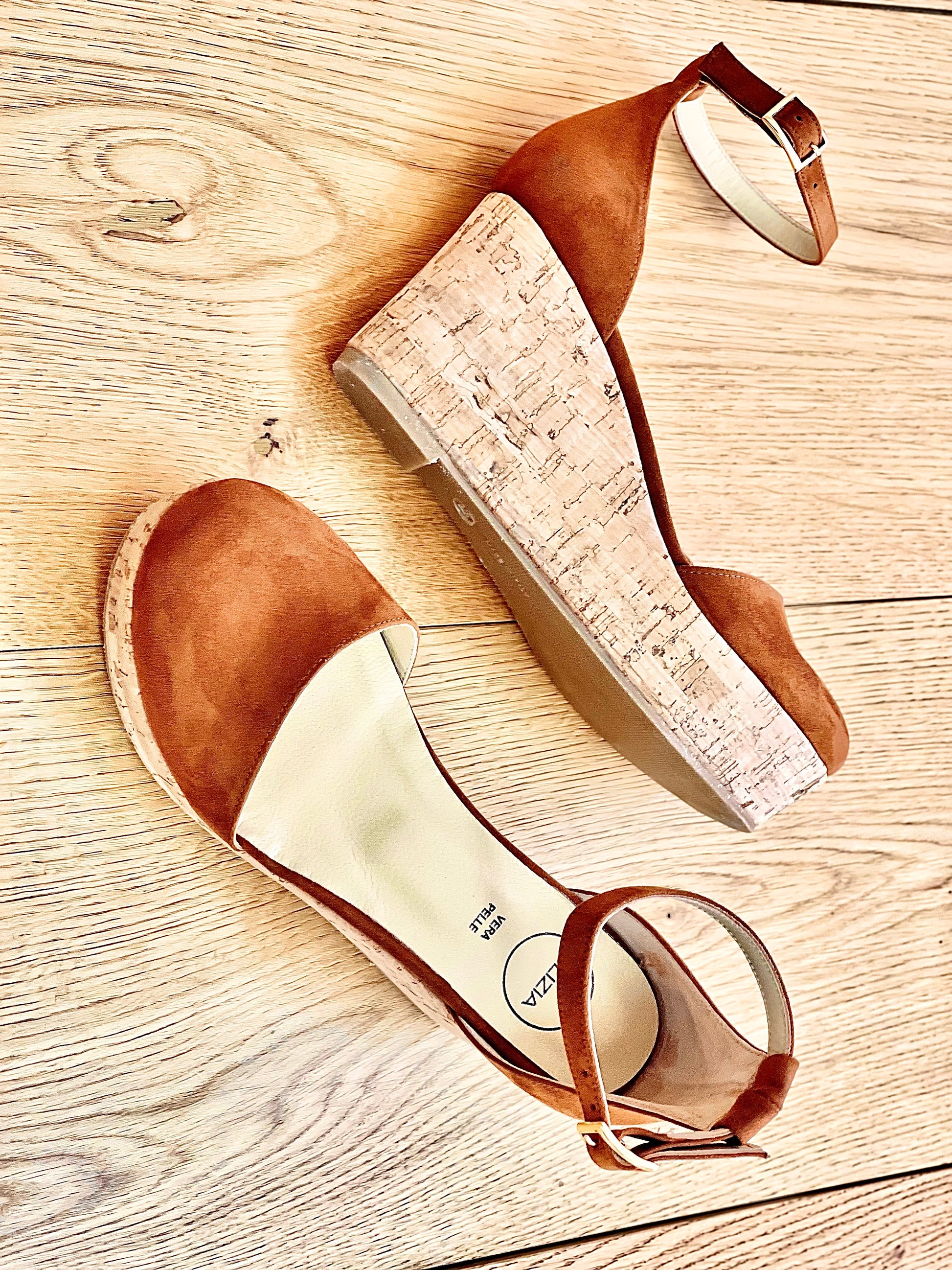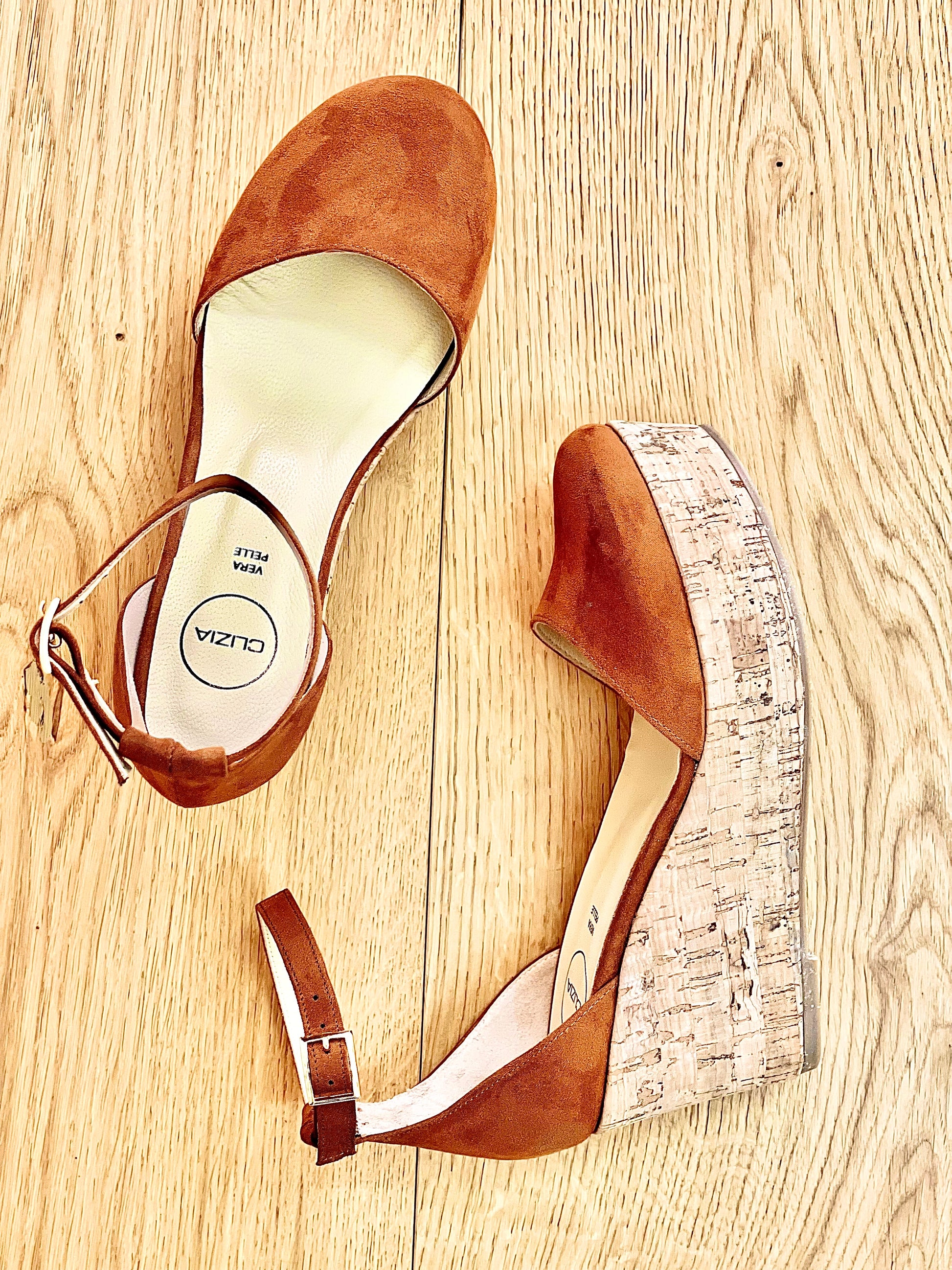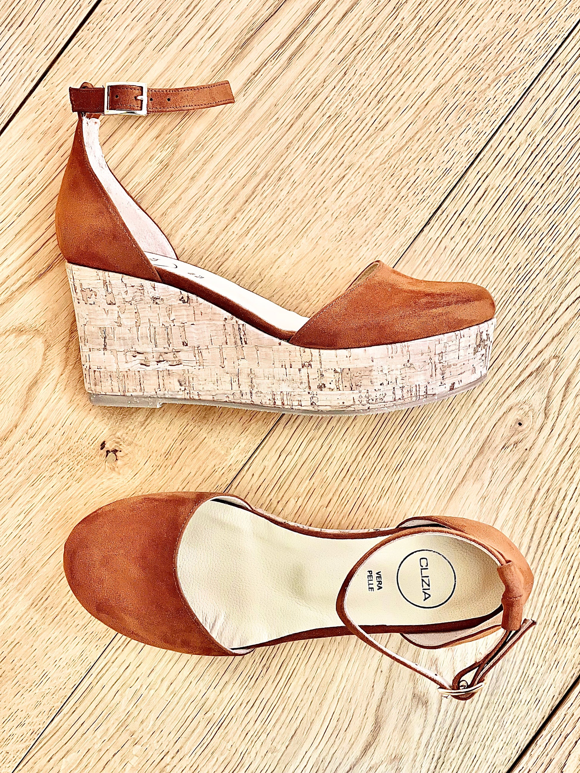 Suède teen en hiel decolleté op middelhoge kurken sleehak.