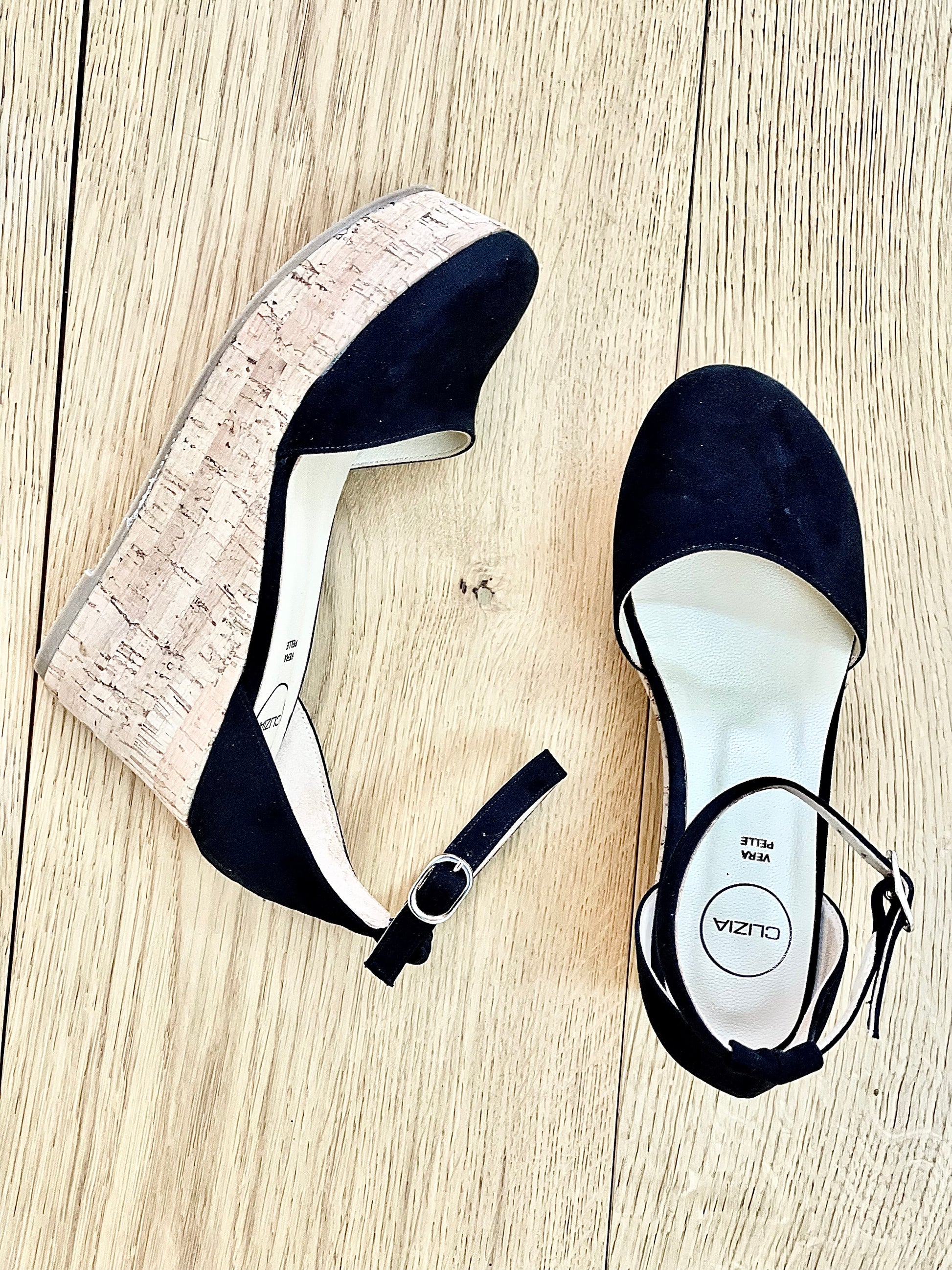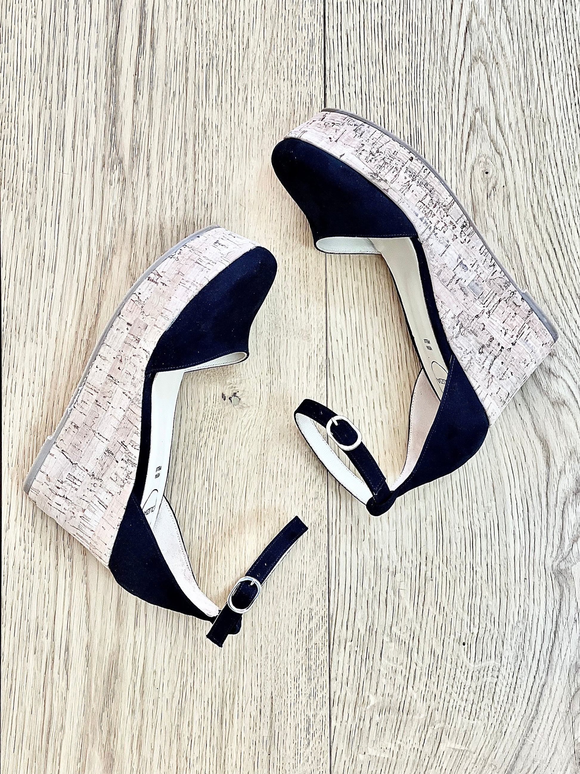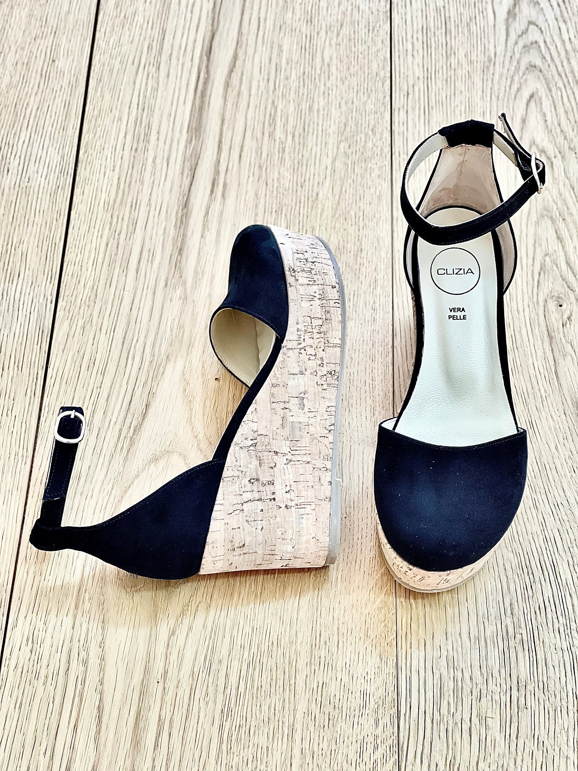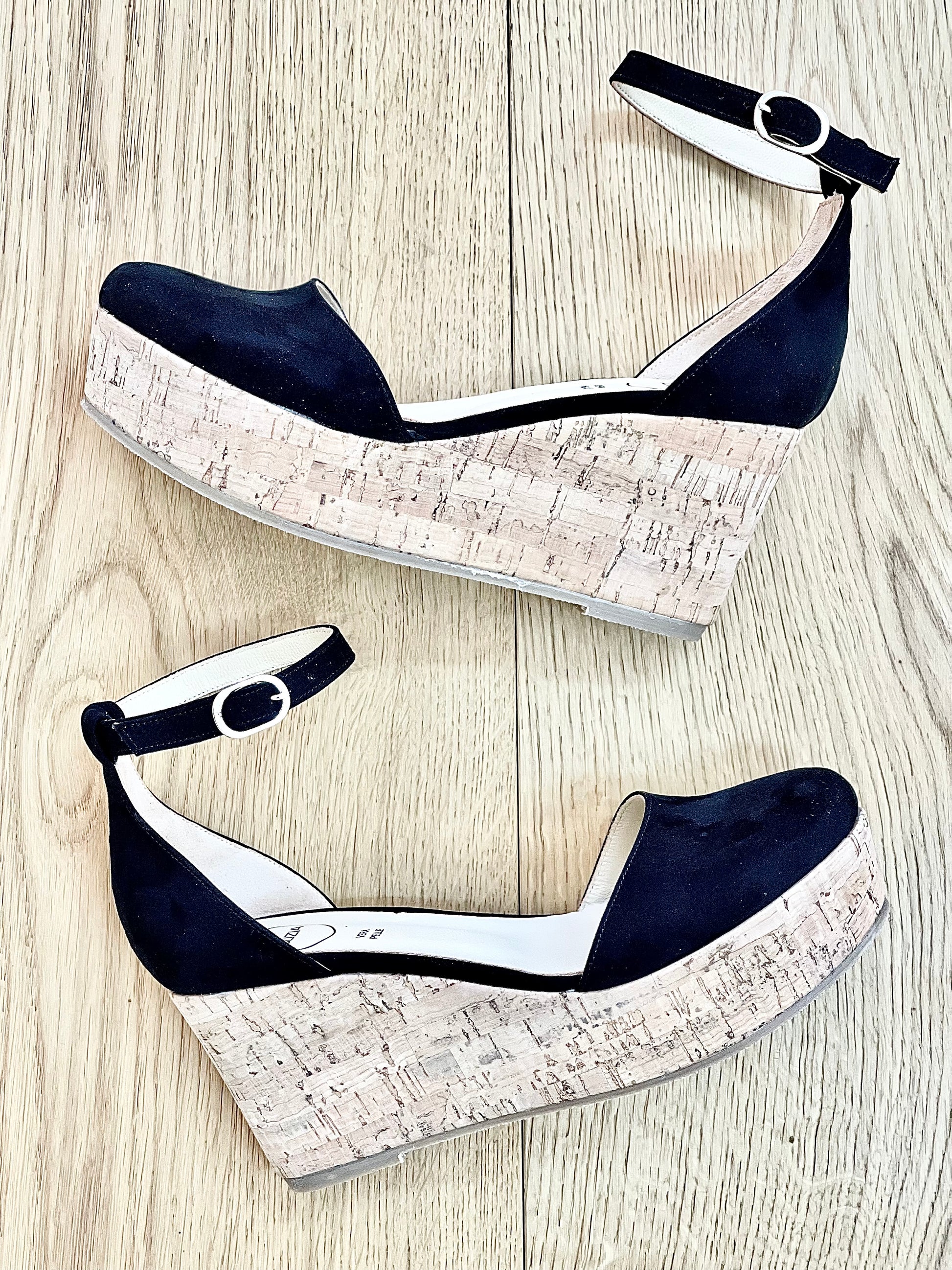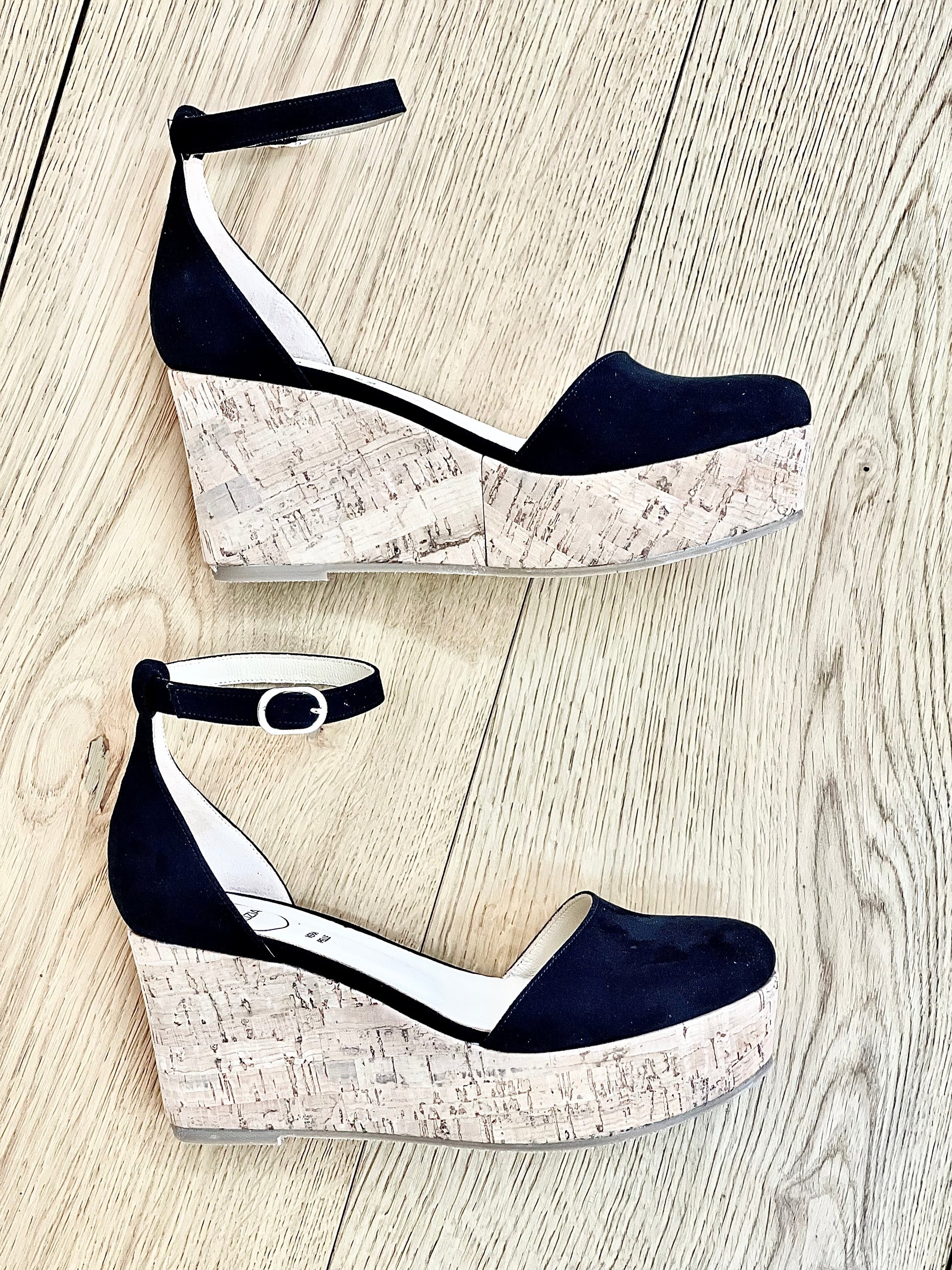 Suède teen en hiel decolleté op middelhoge kurken sleehak.