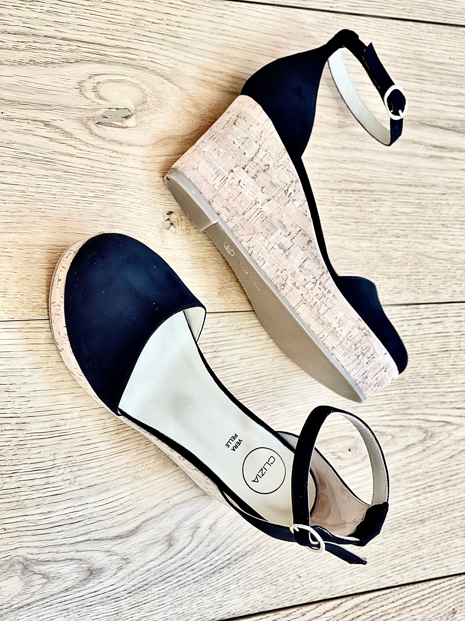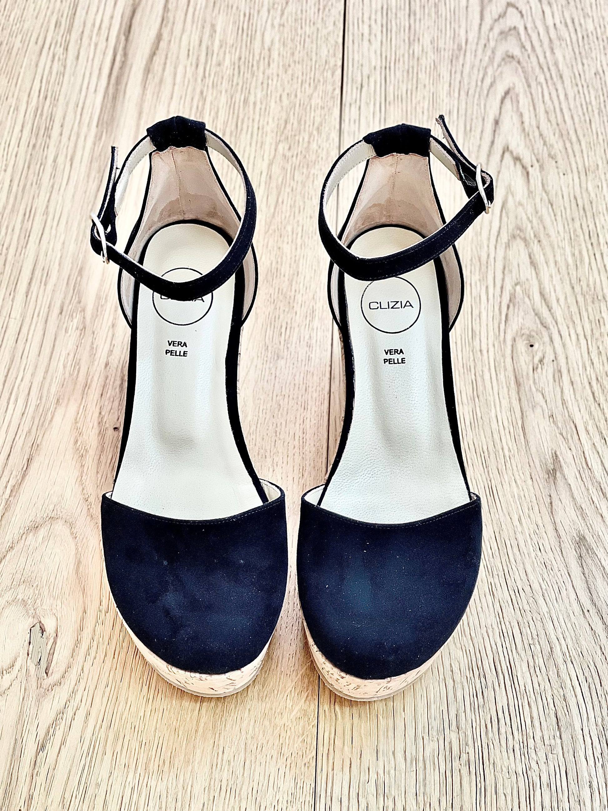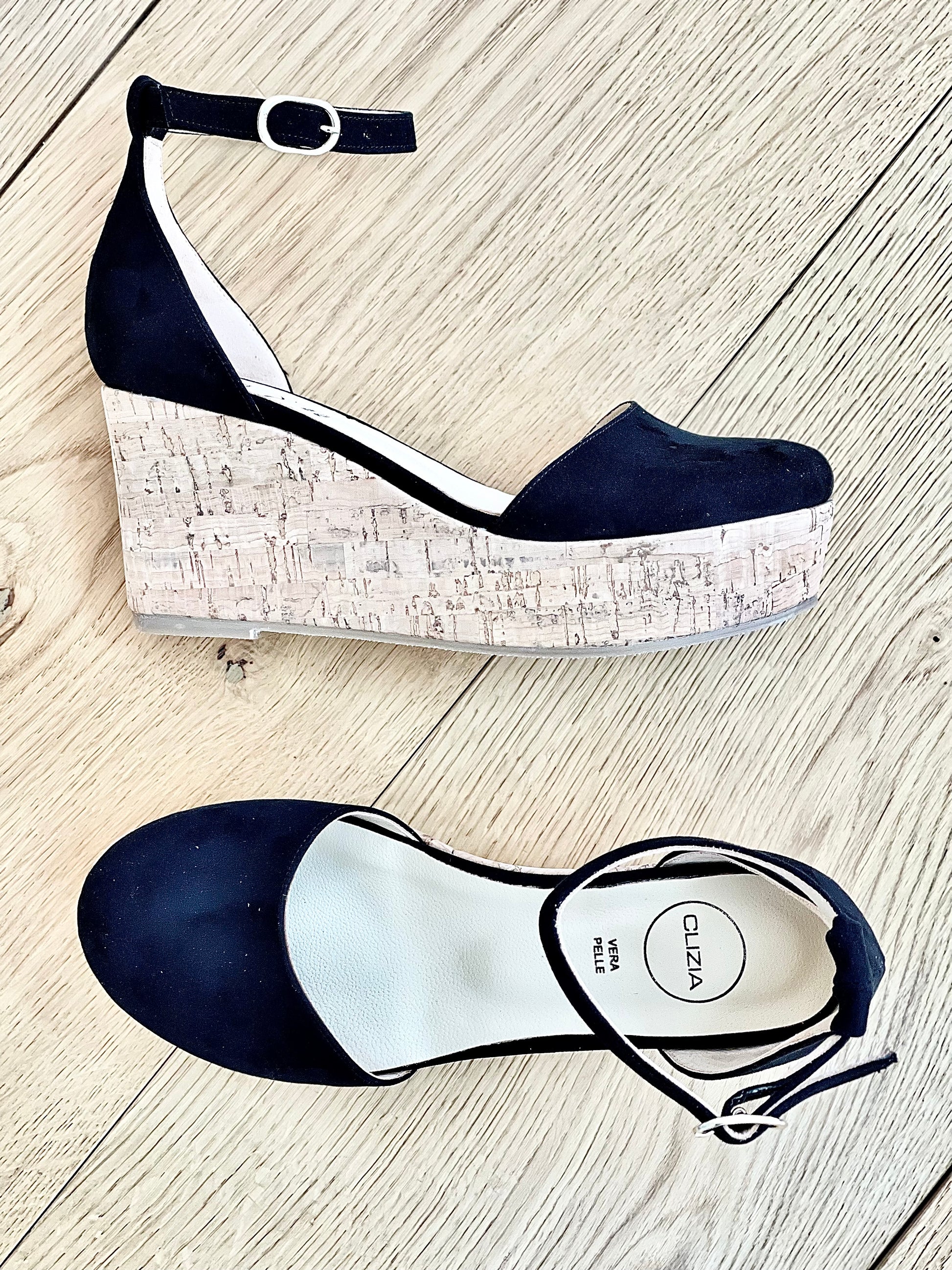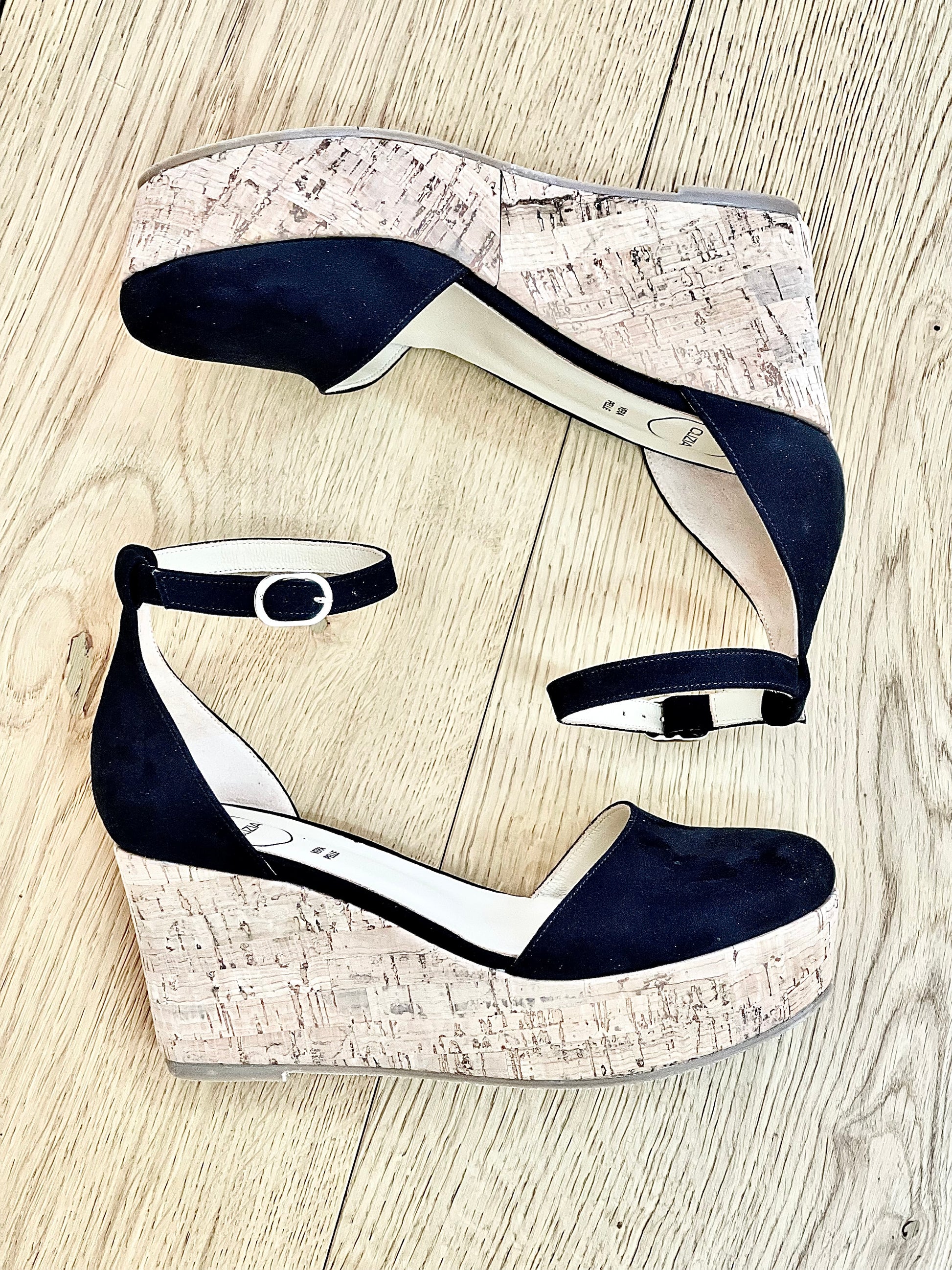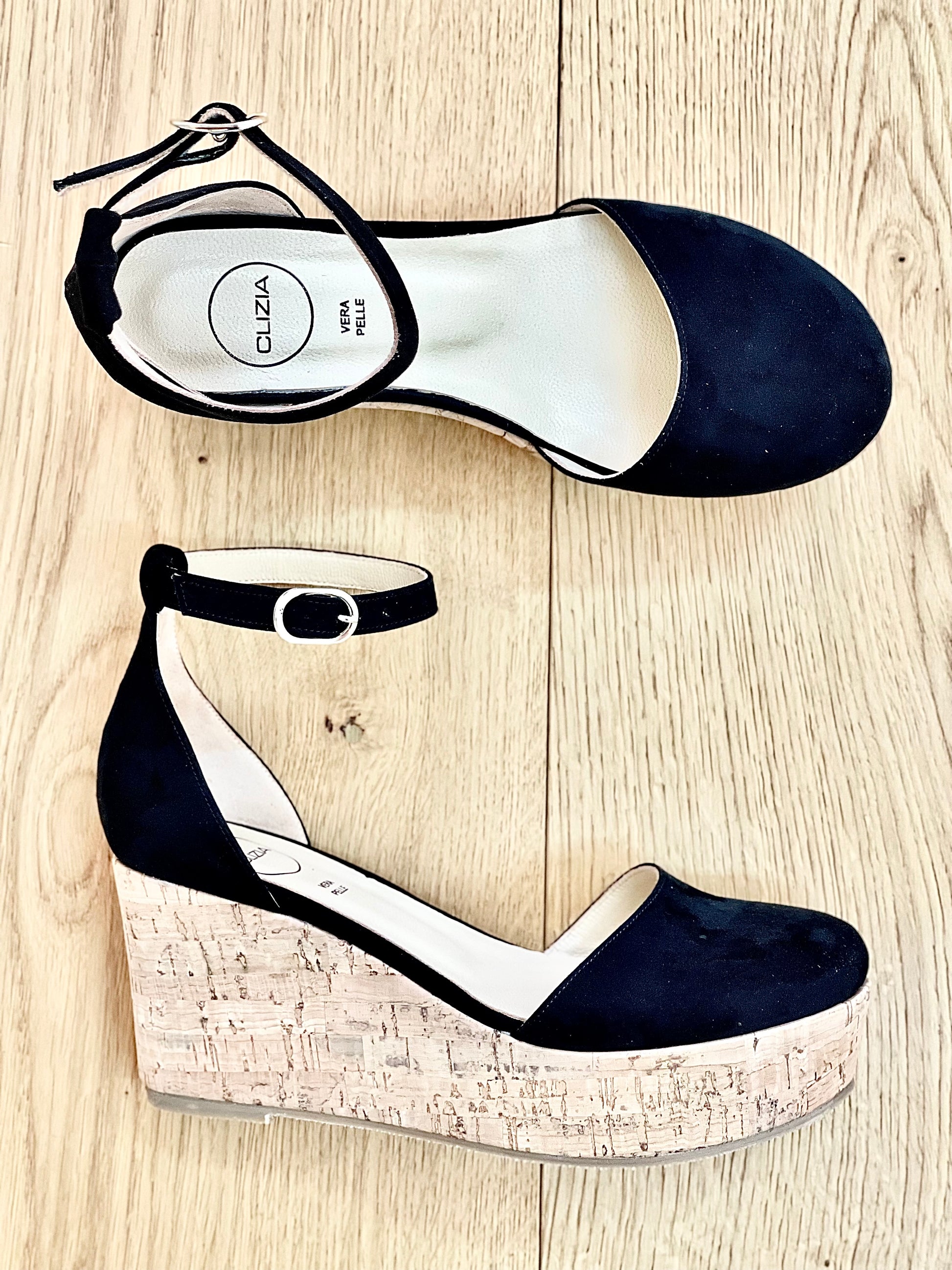 Suède teen en hiel decolleté op middelhoge kurken sleehak.