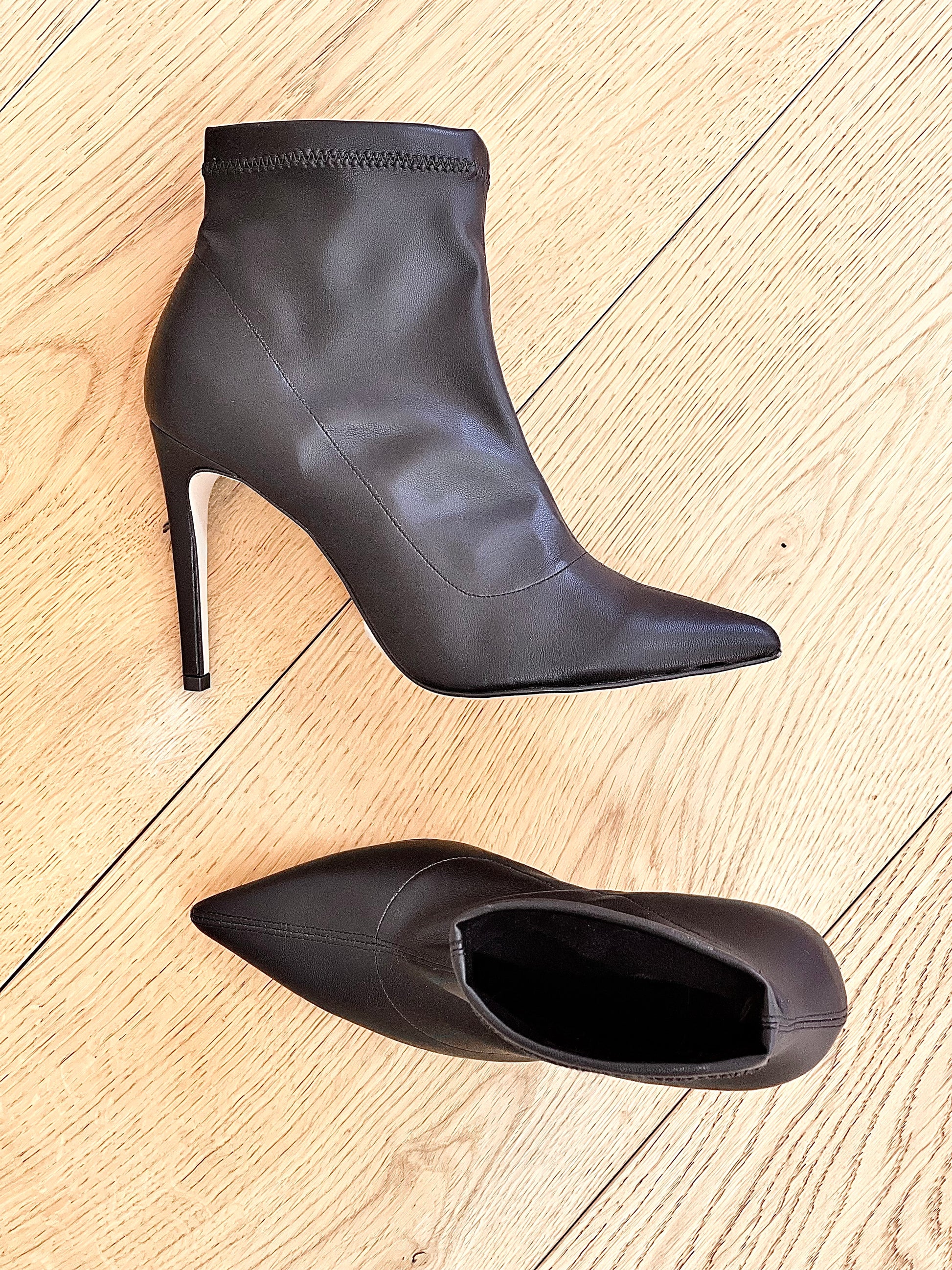 Hoge enkellaarsjes met elastiek en een naaldhak van 10 cm.