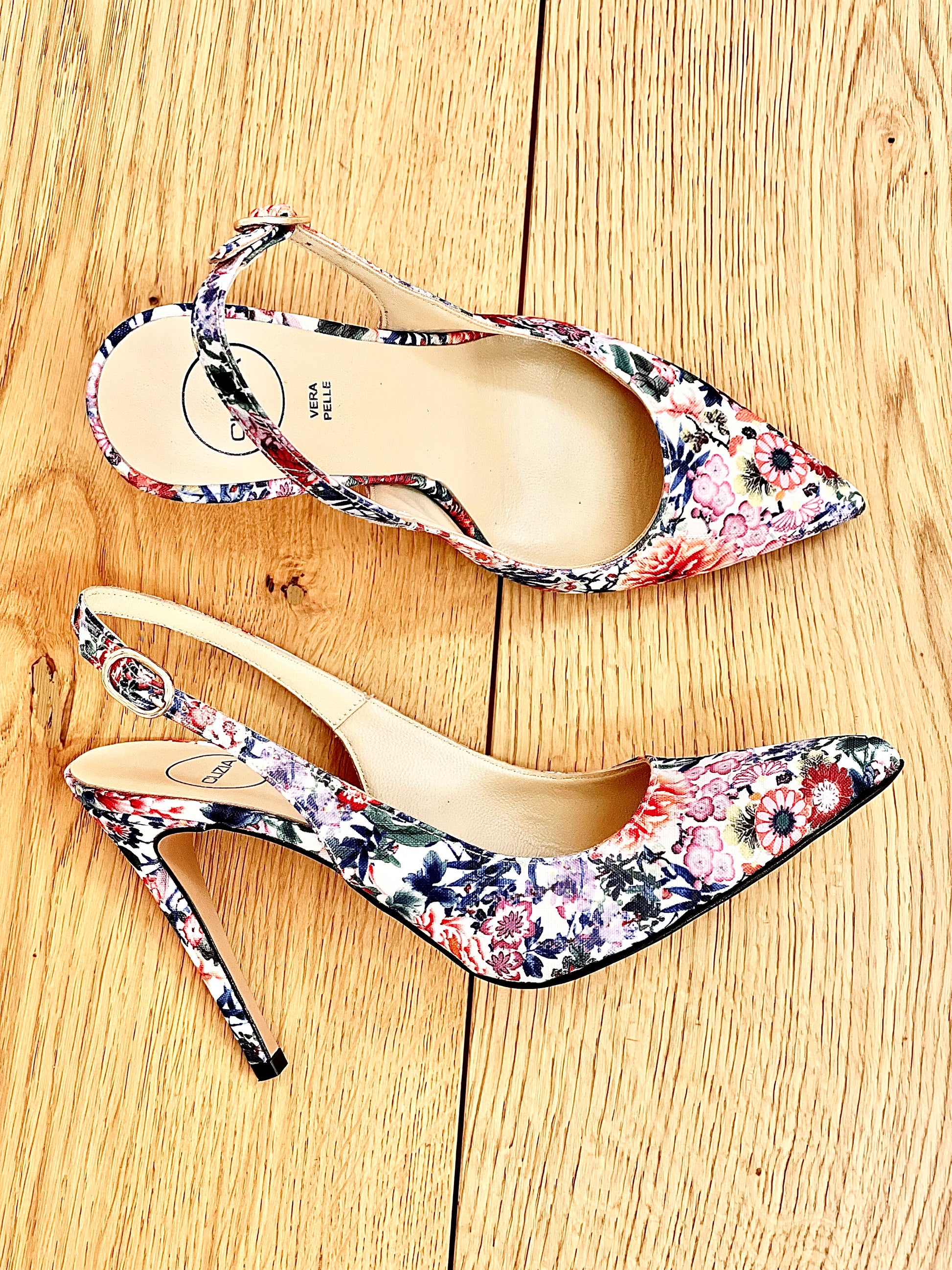 Spitse slingback decolleté in gebloemde hoge naaldhak.