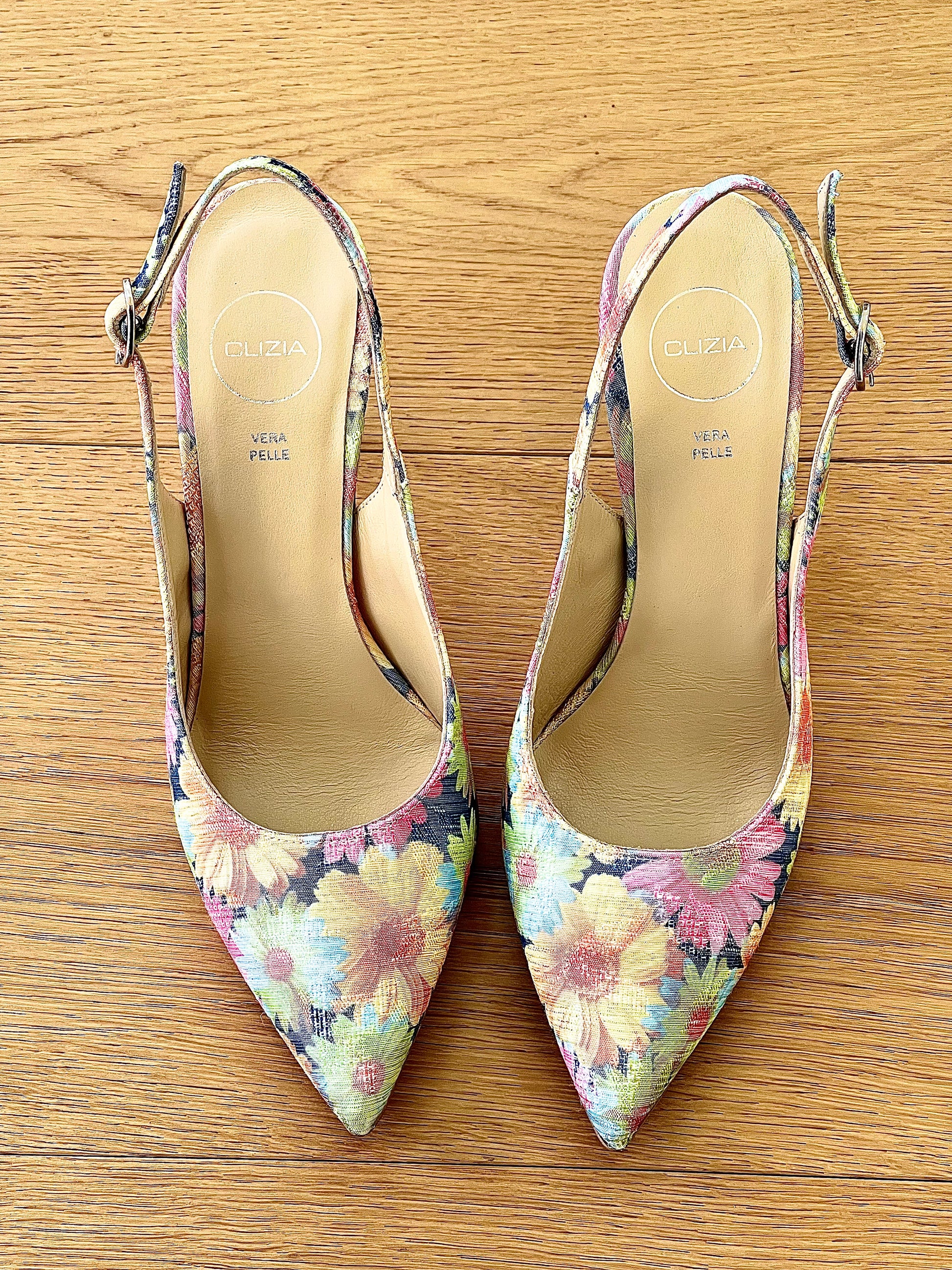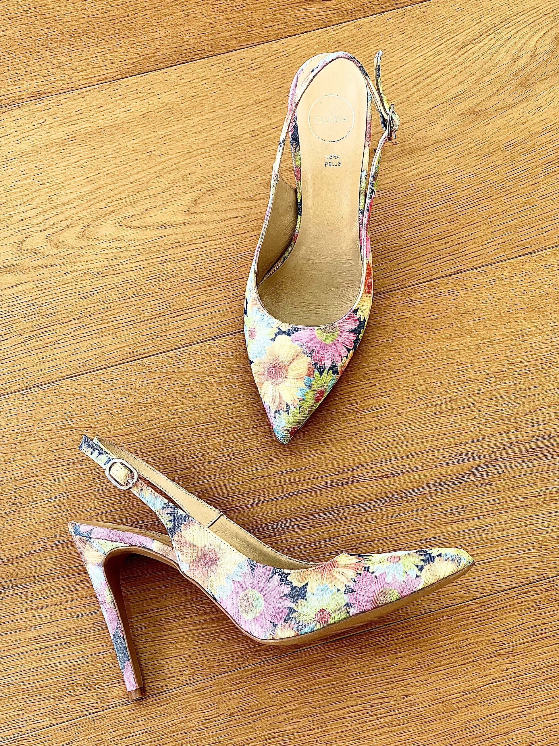 Spitse slingback decolleté in gebloemde hoge naaldhak.
