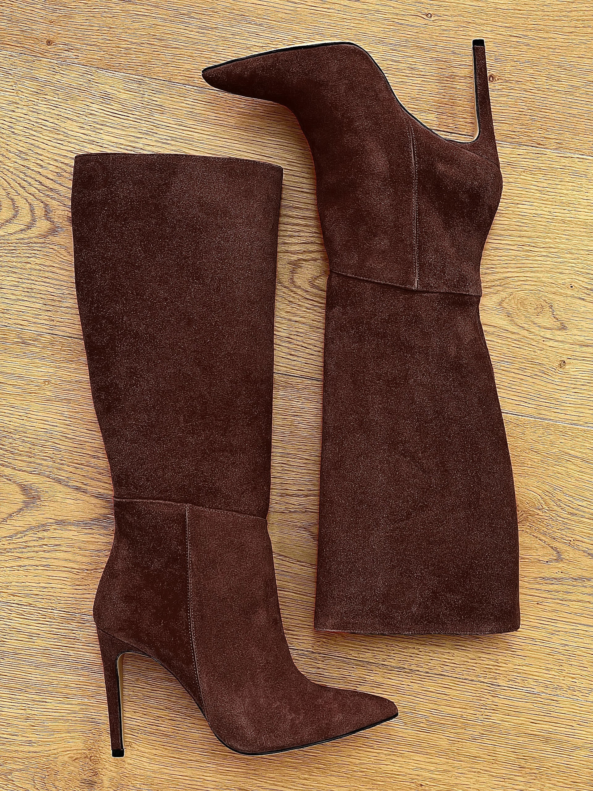 Tube laarzen met spitse teen van suède en een naaldhak van 10 cm.
