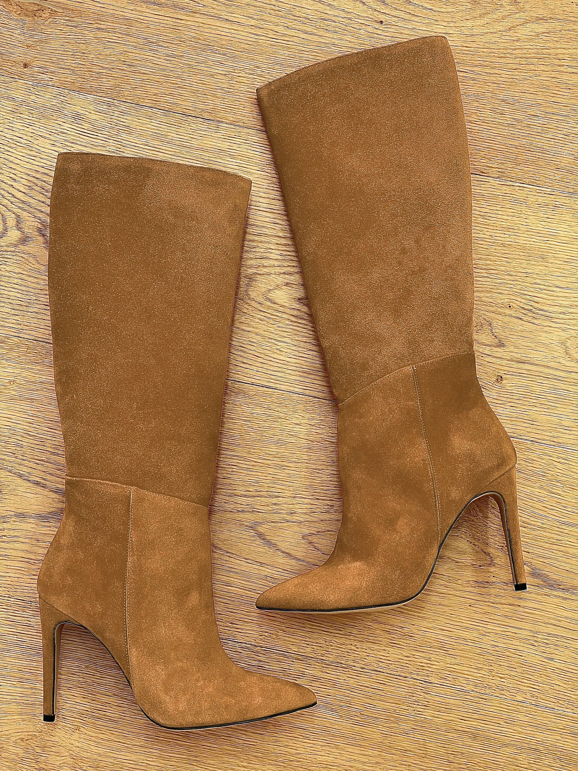 Tube laarzen met spitse teen van suède en een naaldhak van 10 cm.