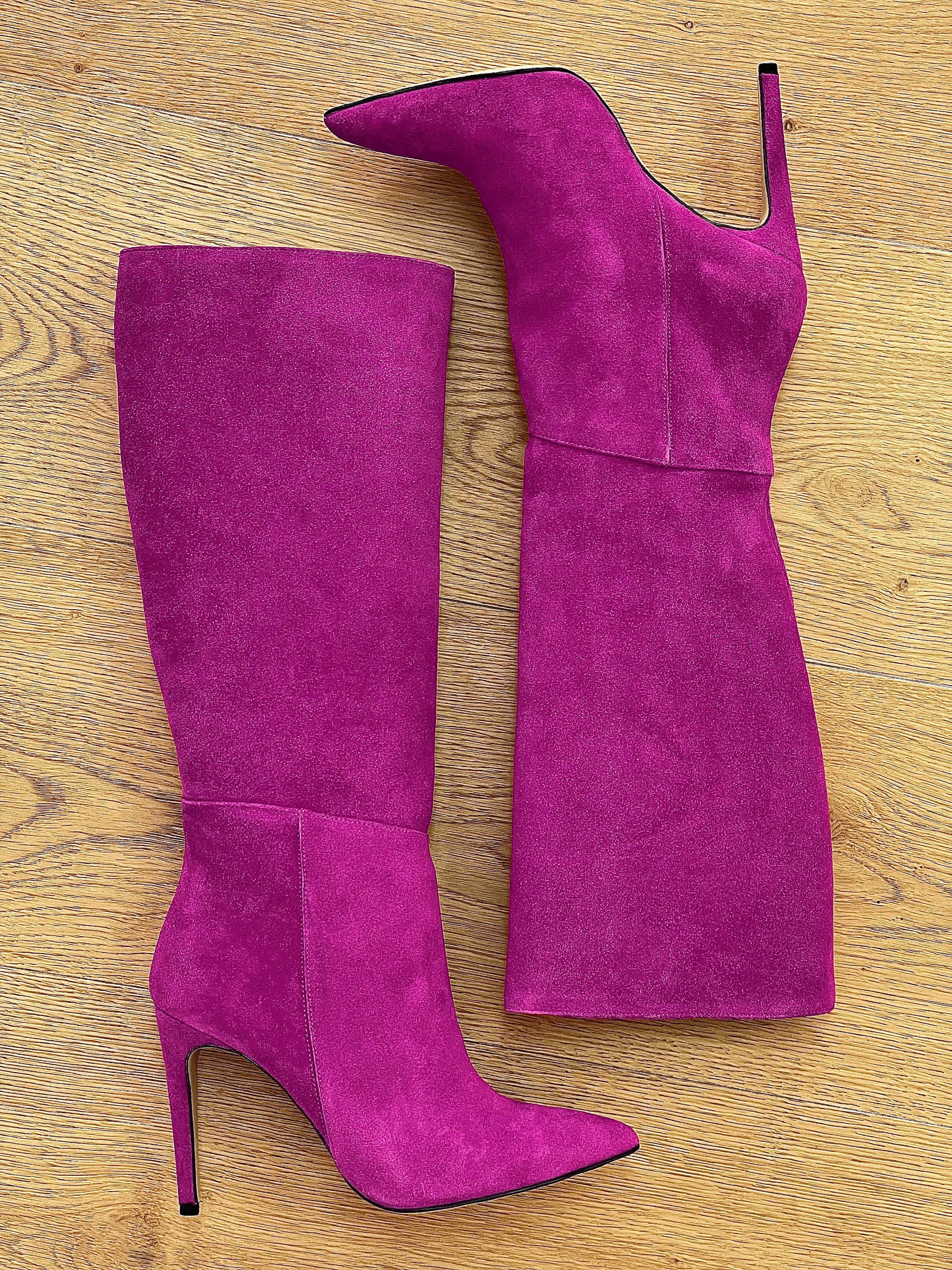 Tube laarzen met spitse teen van suède en een naaldhak van 10 cm.