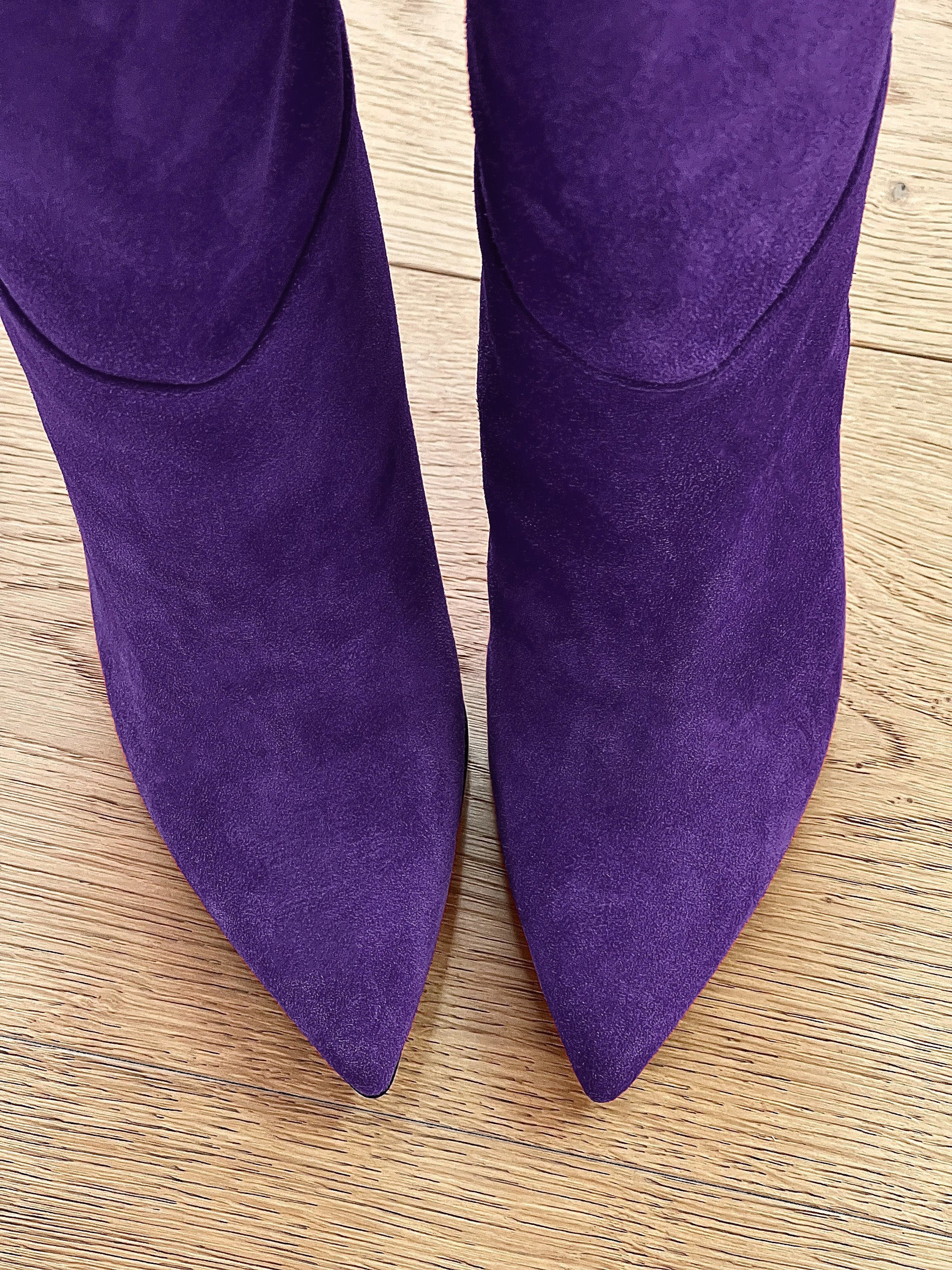 Tube laarzen met spitse teen van suède en een naaldhak van 10 cm.