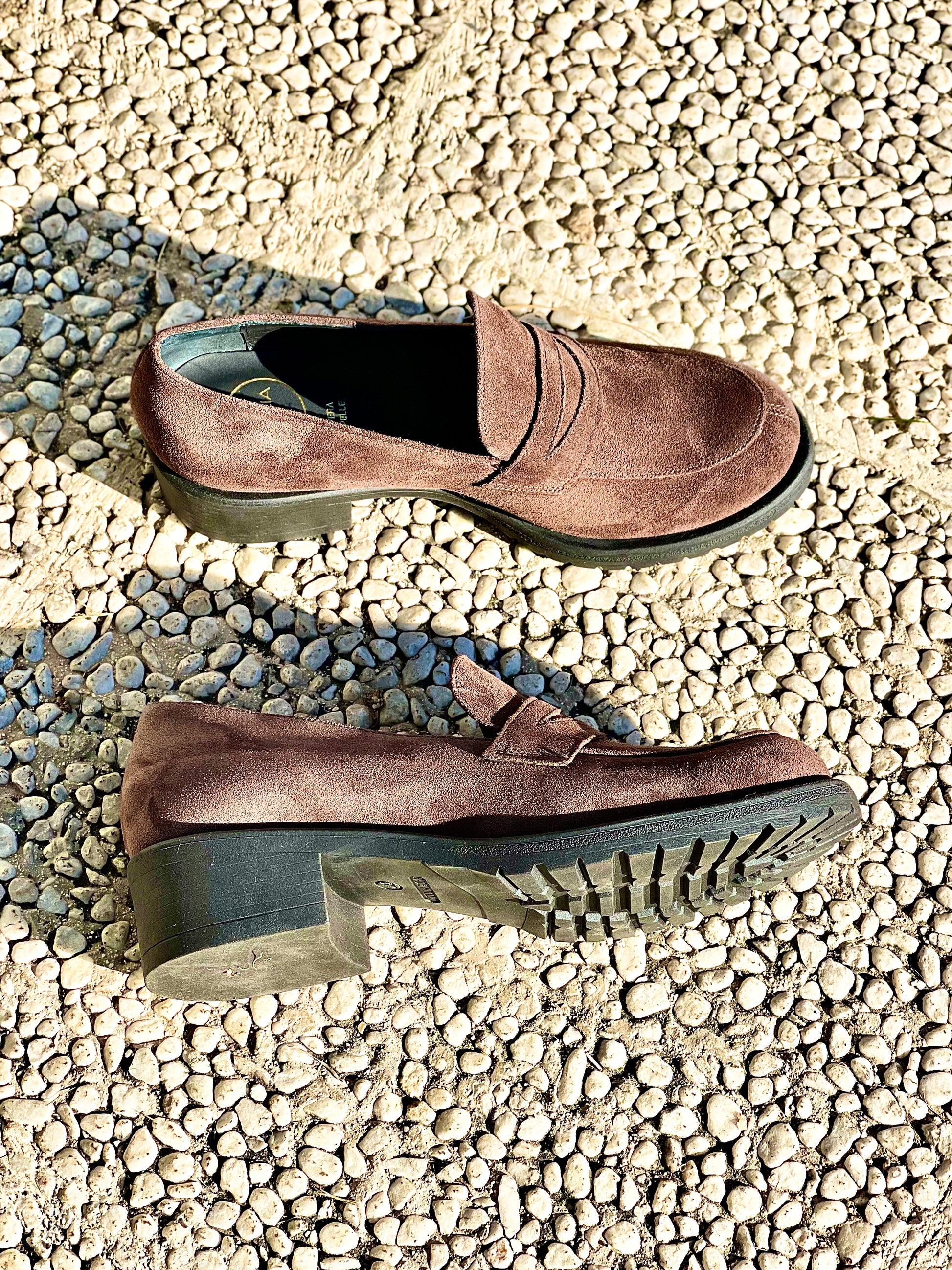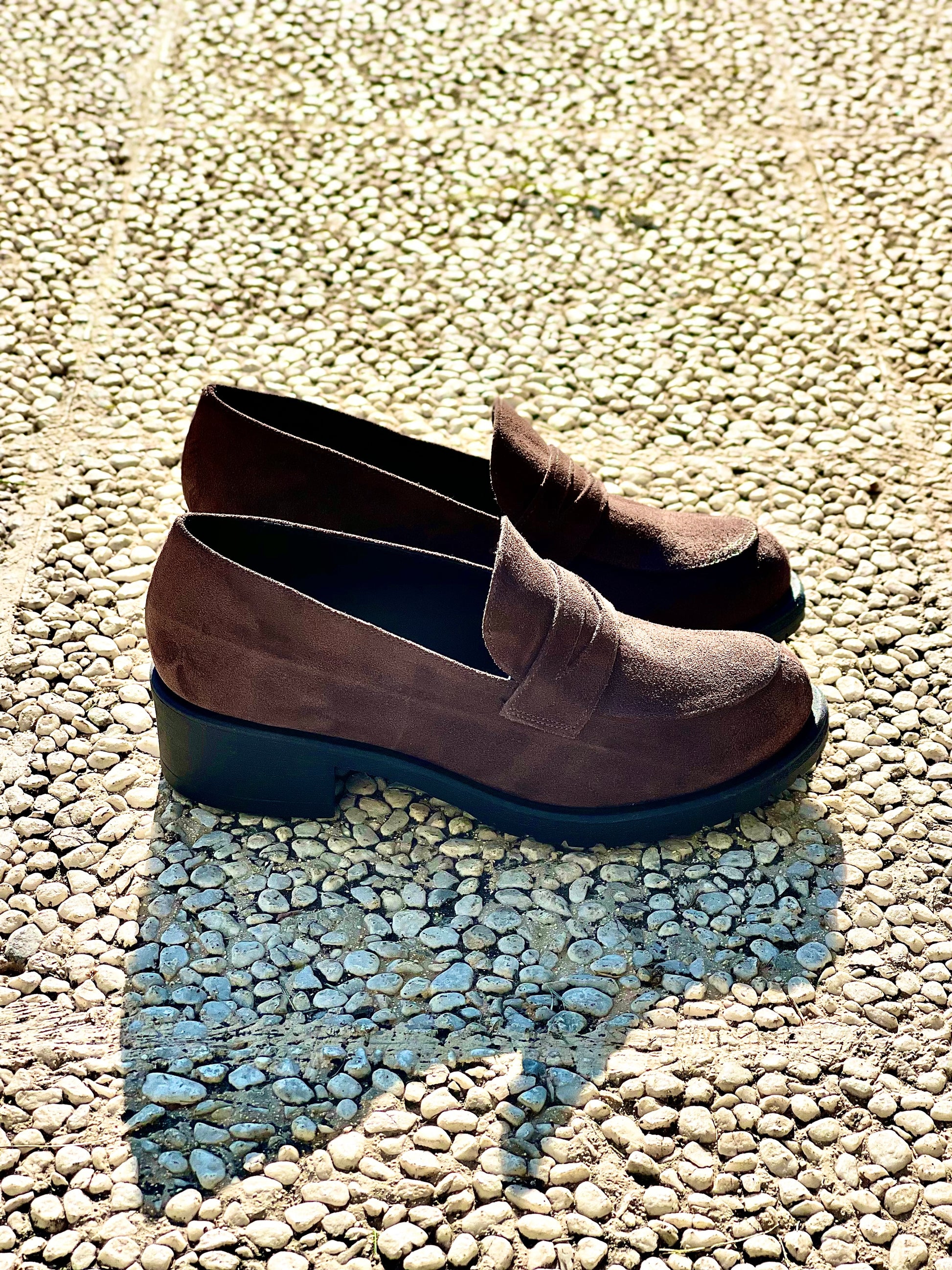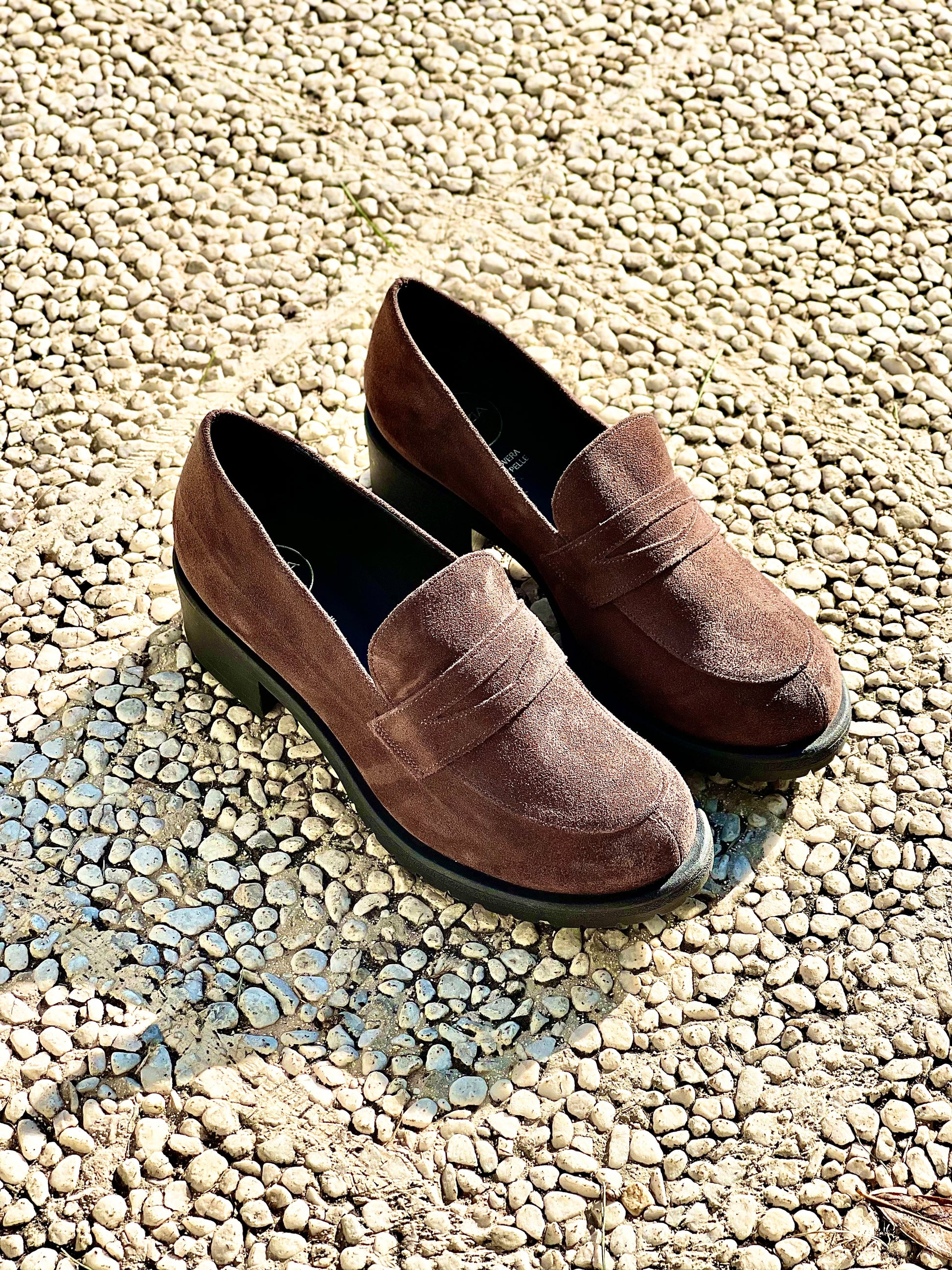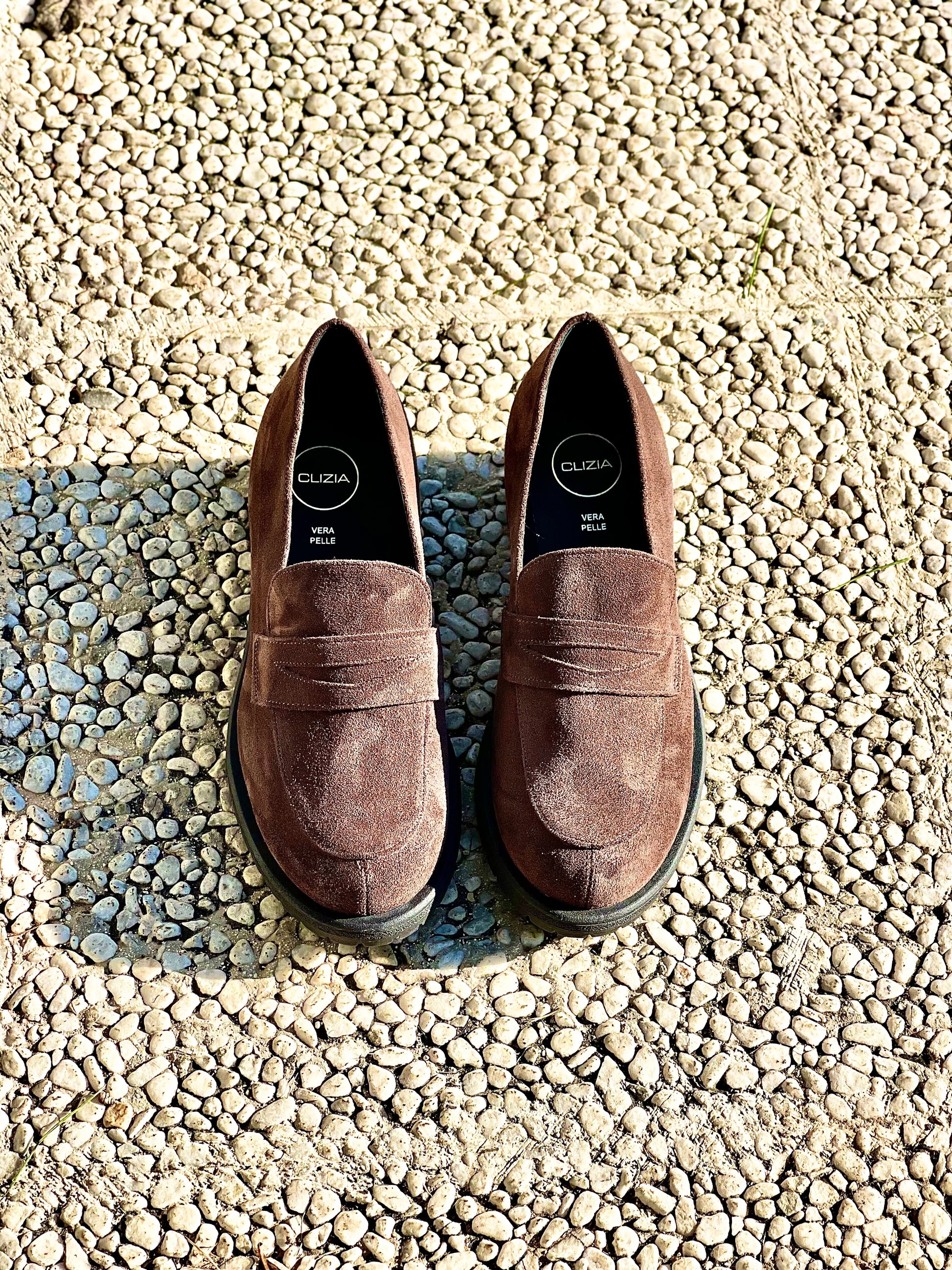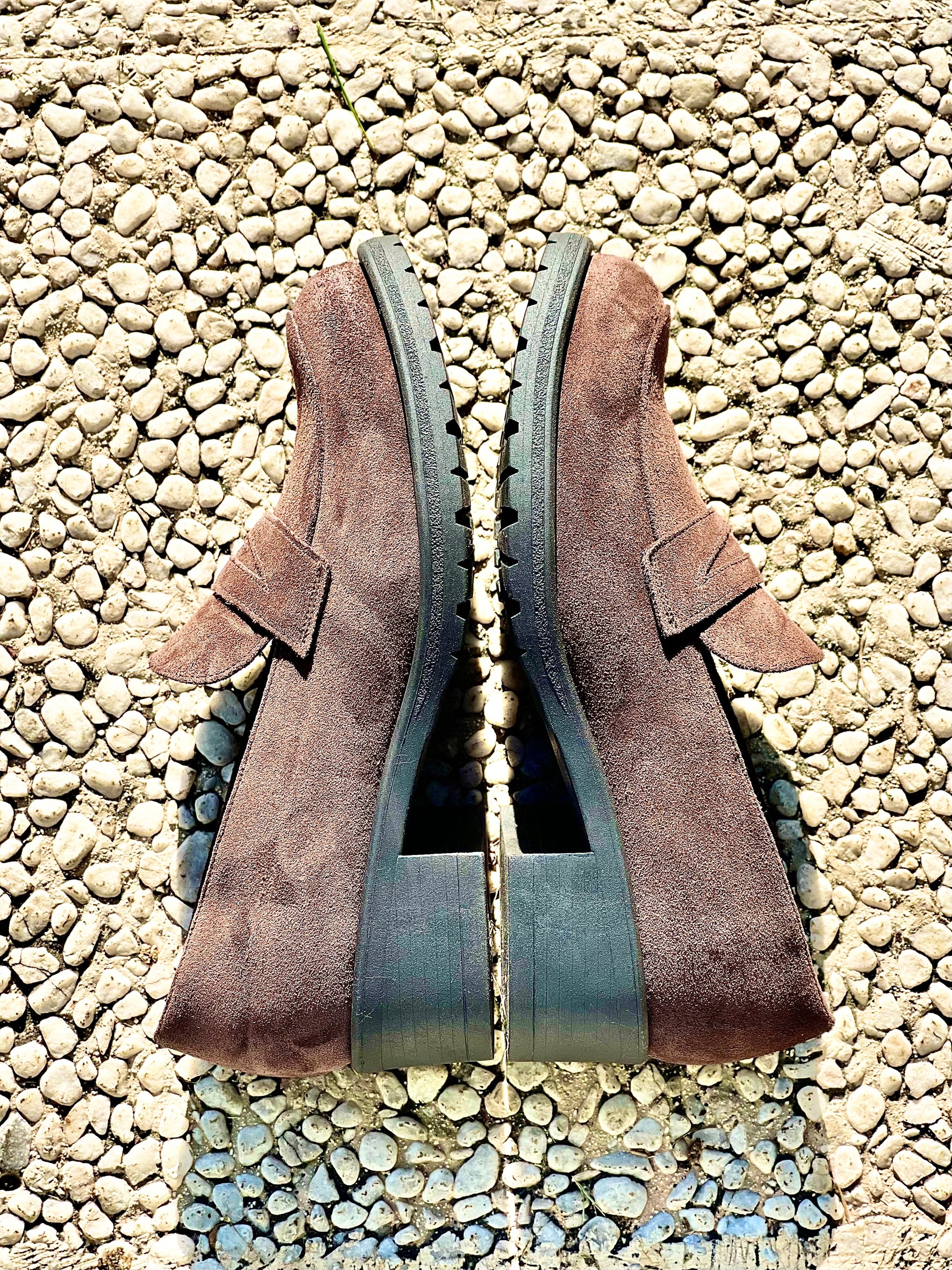 Suède mocassins met een hak van 3 cm.