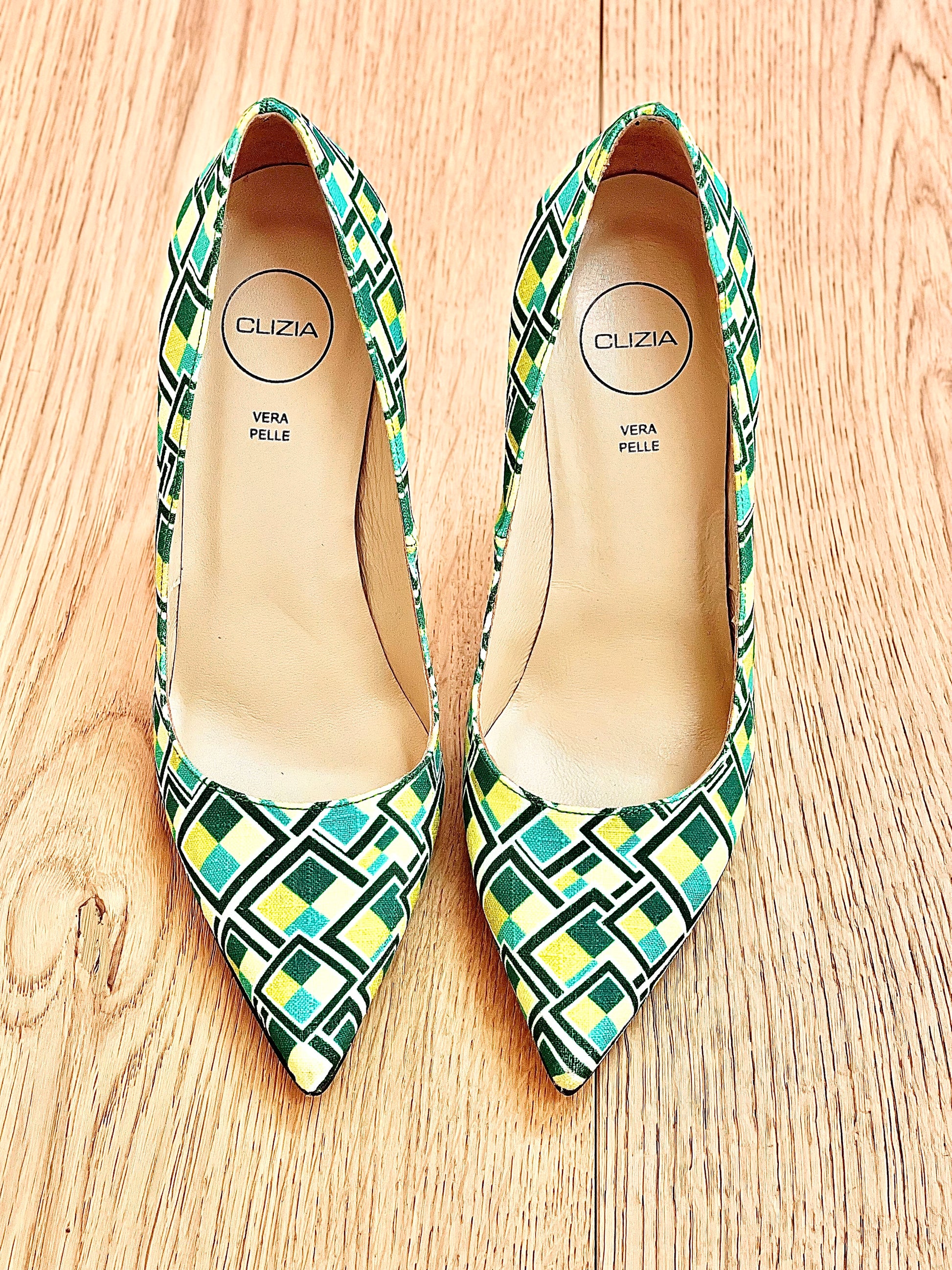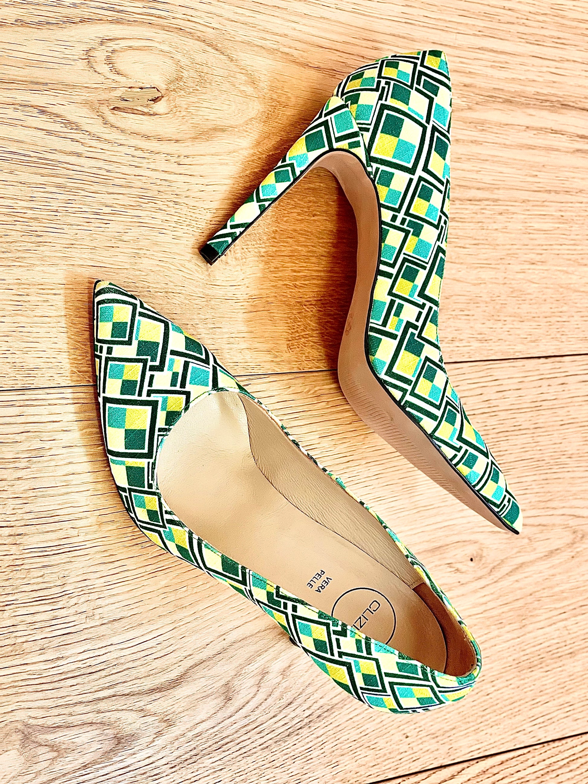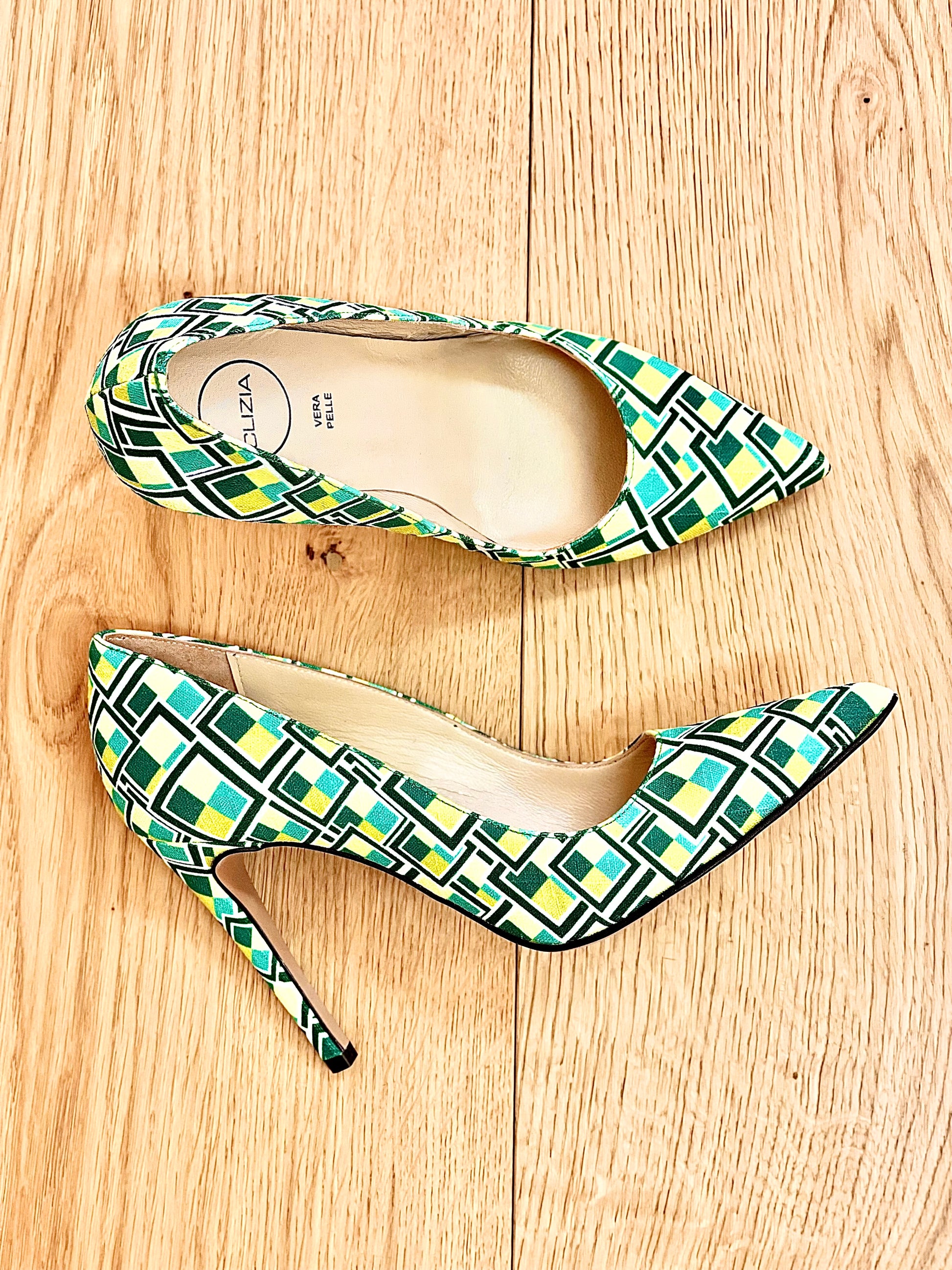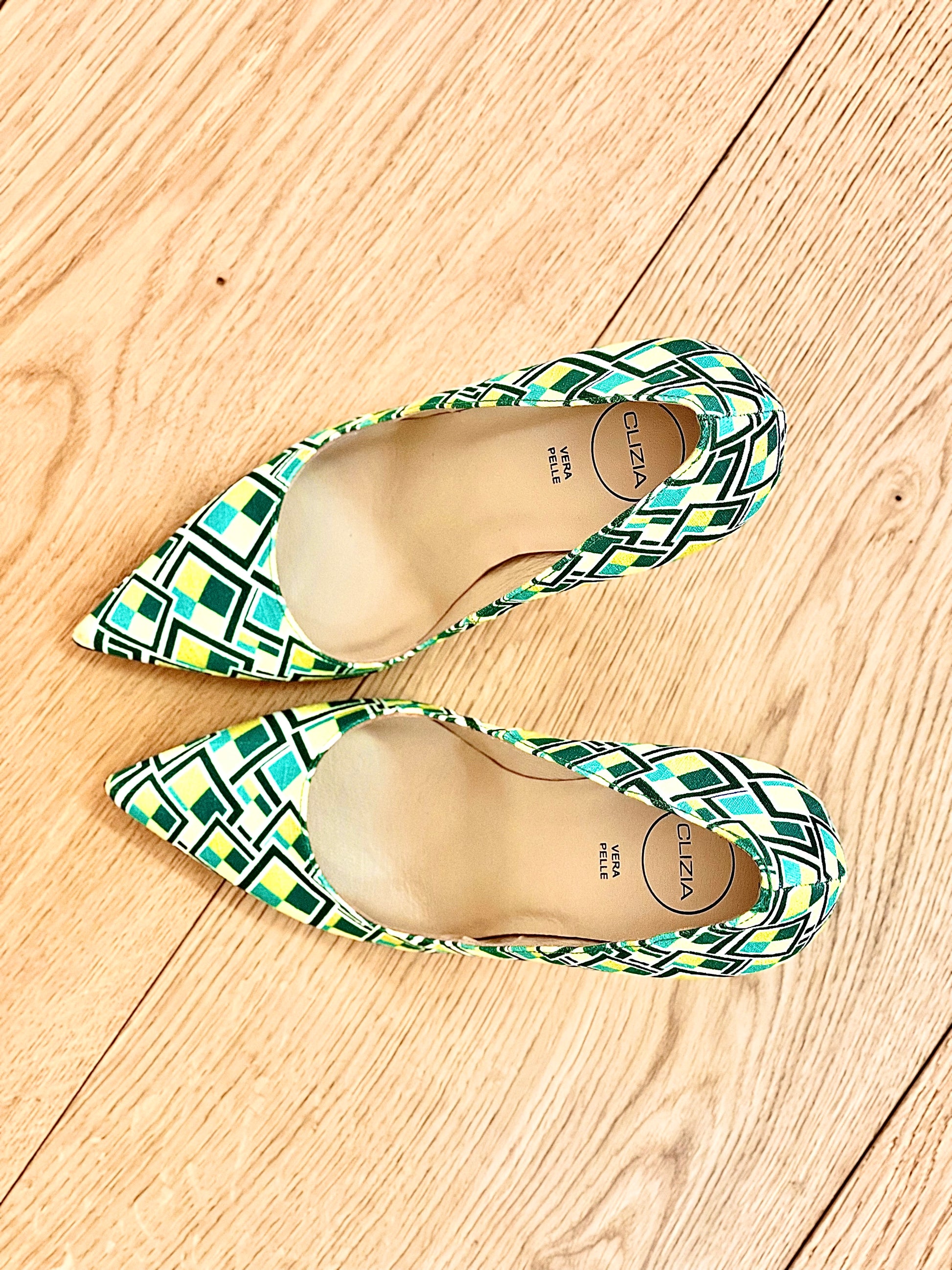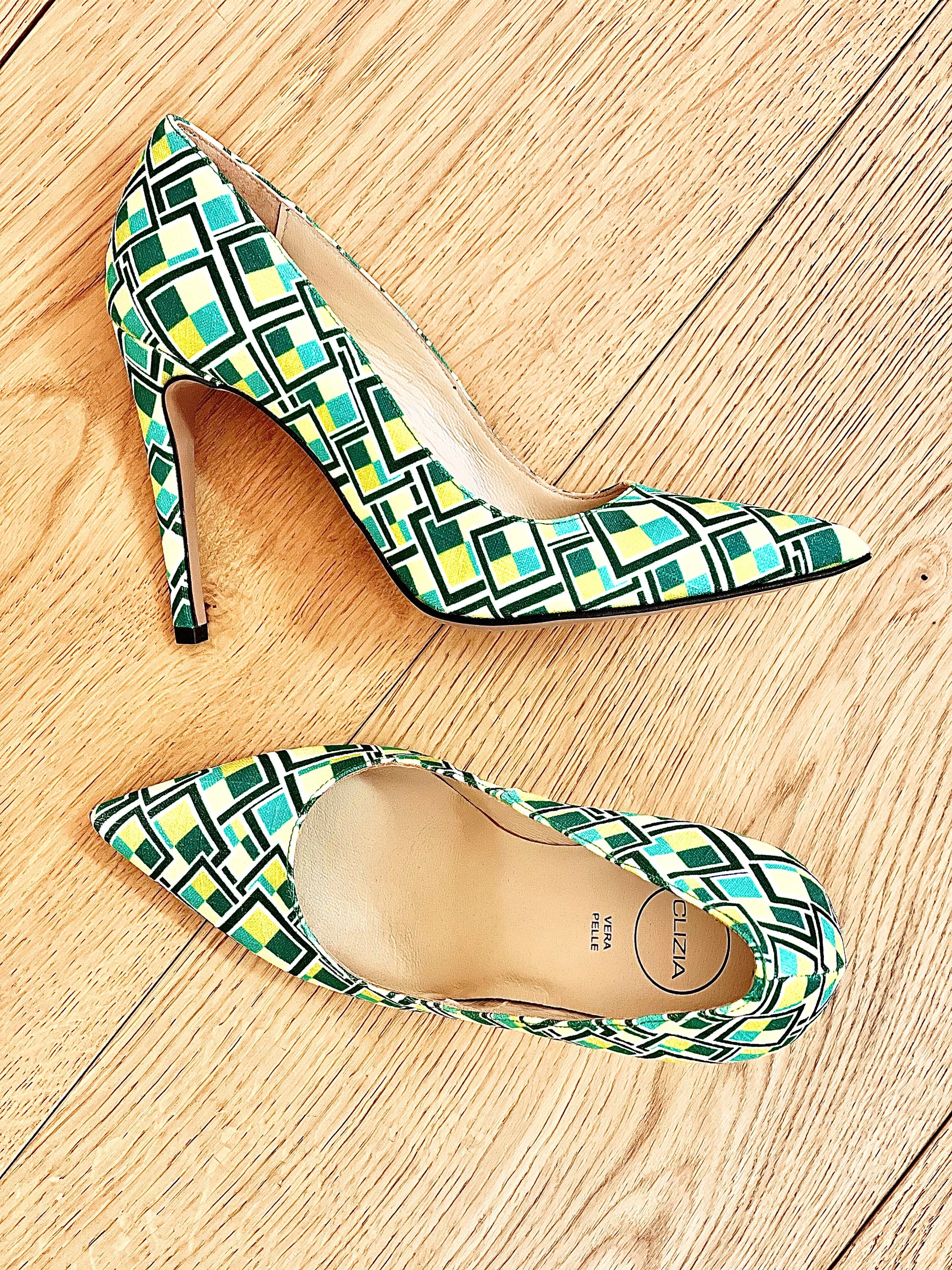 Puntig geometrisch decolleté met een 10 cm hoge naaldhak.