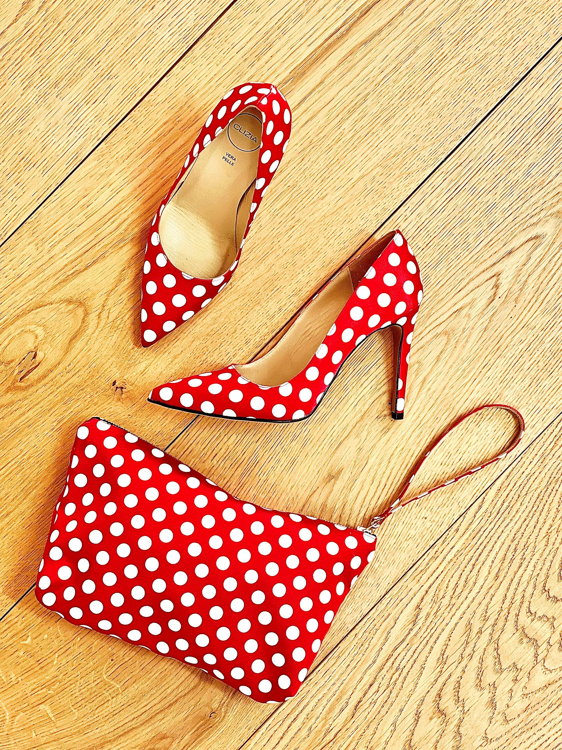 - Bovenstuk: Satijnen stippenprint rood/wit