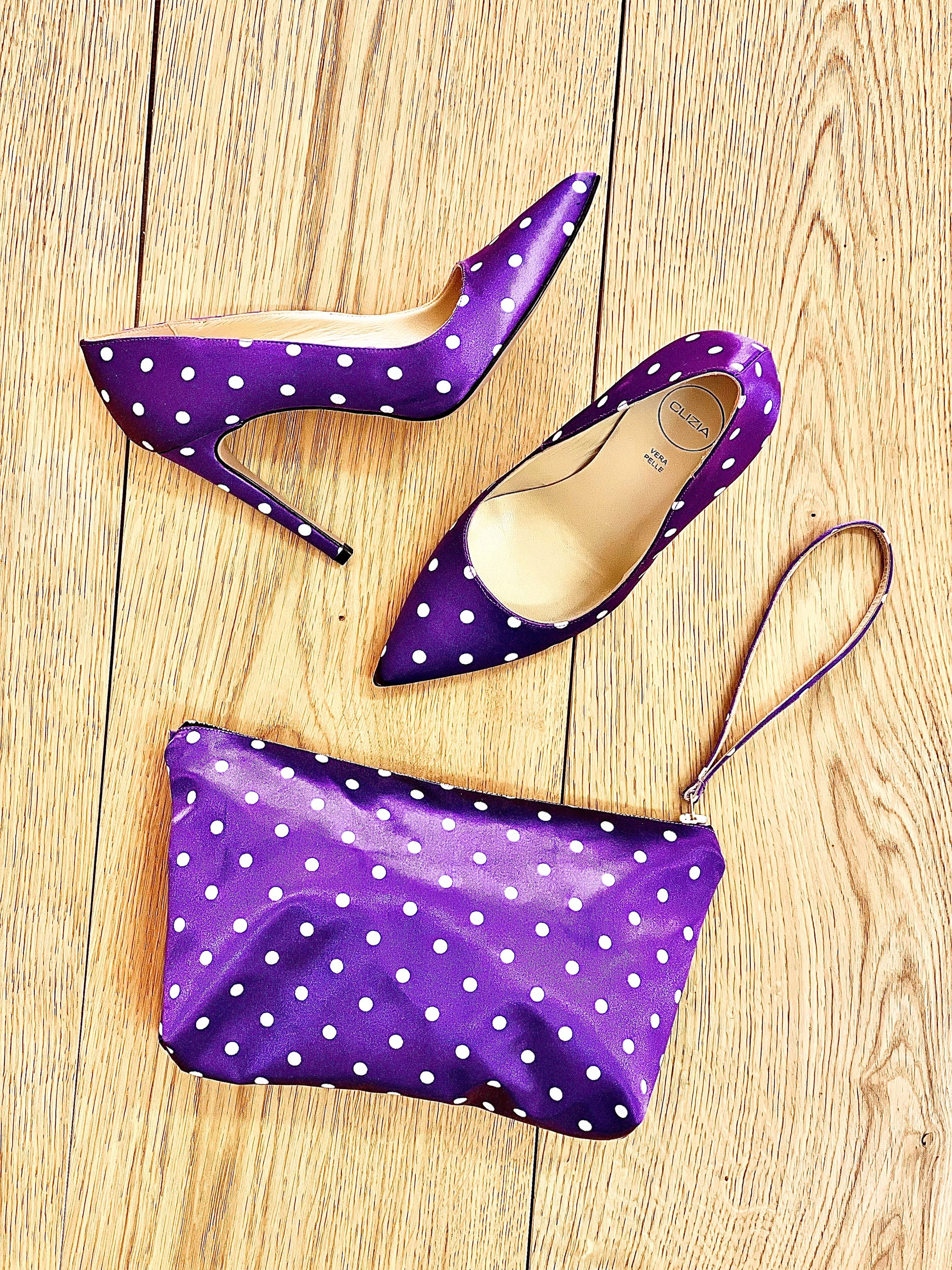 - Bovenstuk: Satijnen stippenprint paars/wit