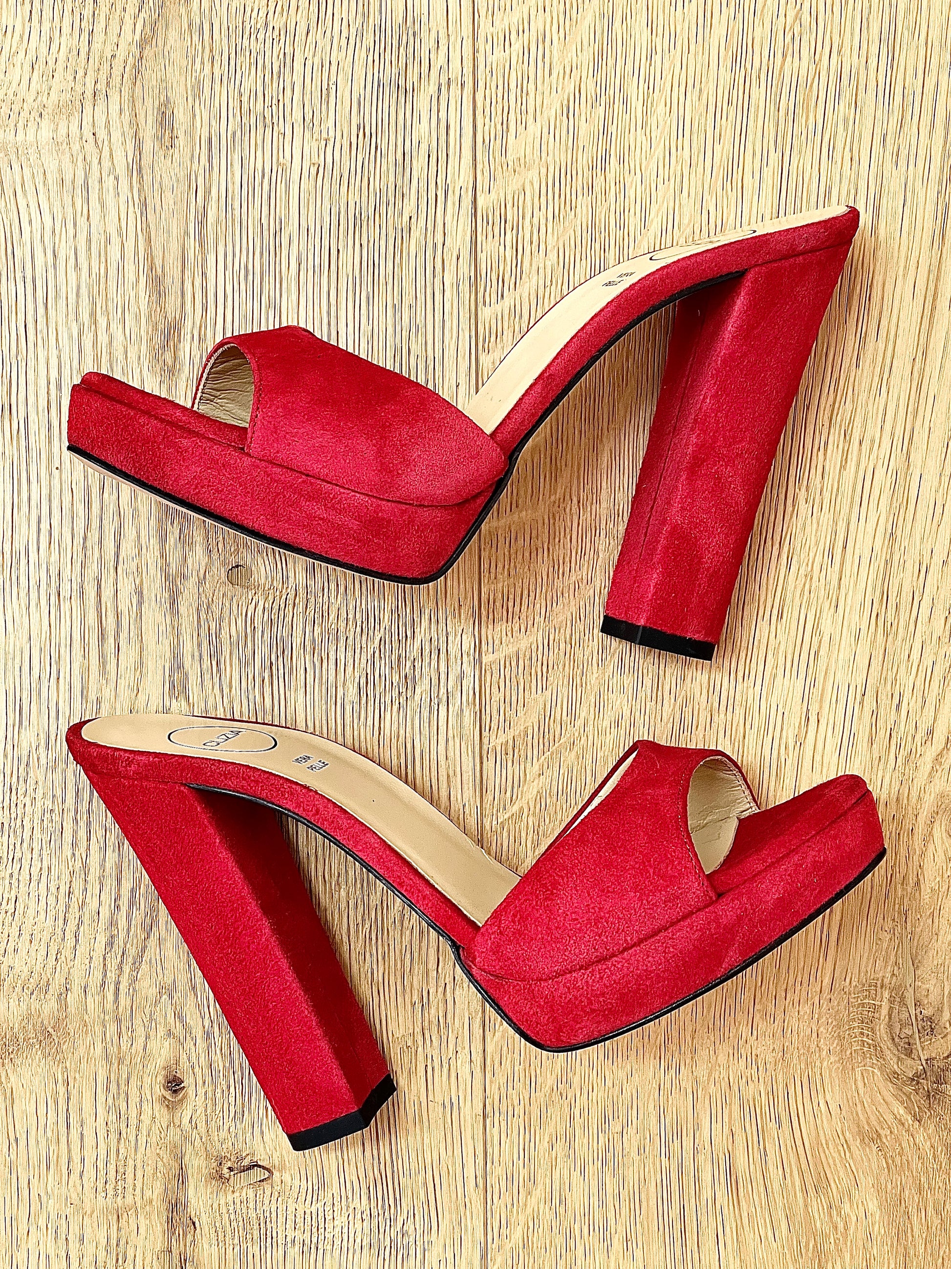 Hoge suède muiltjes sandalen met plateau en brede hak.