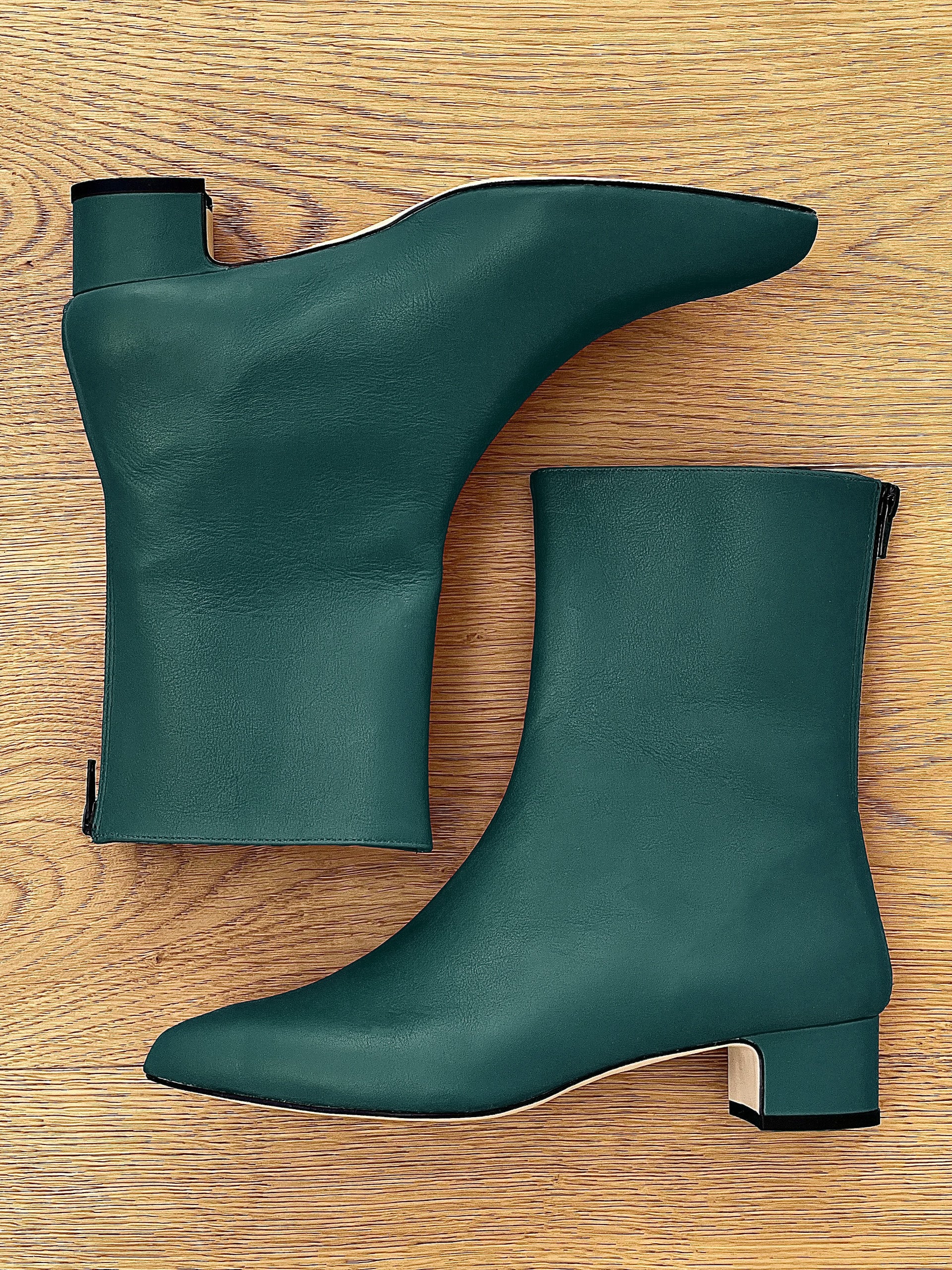 Enkellaarsjes met brede hak en ritssluiting aan de achterkant.