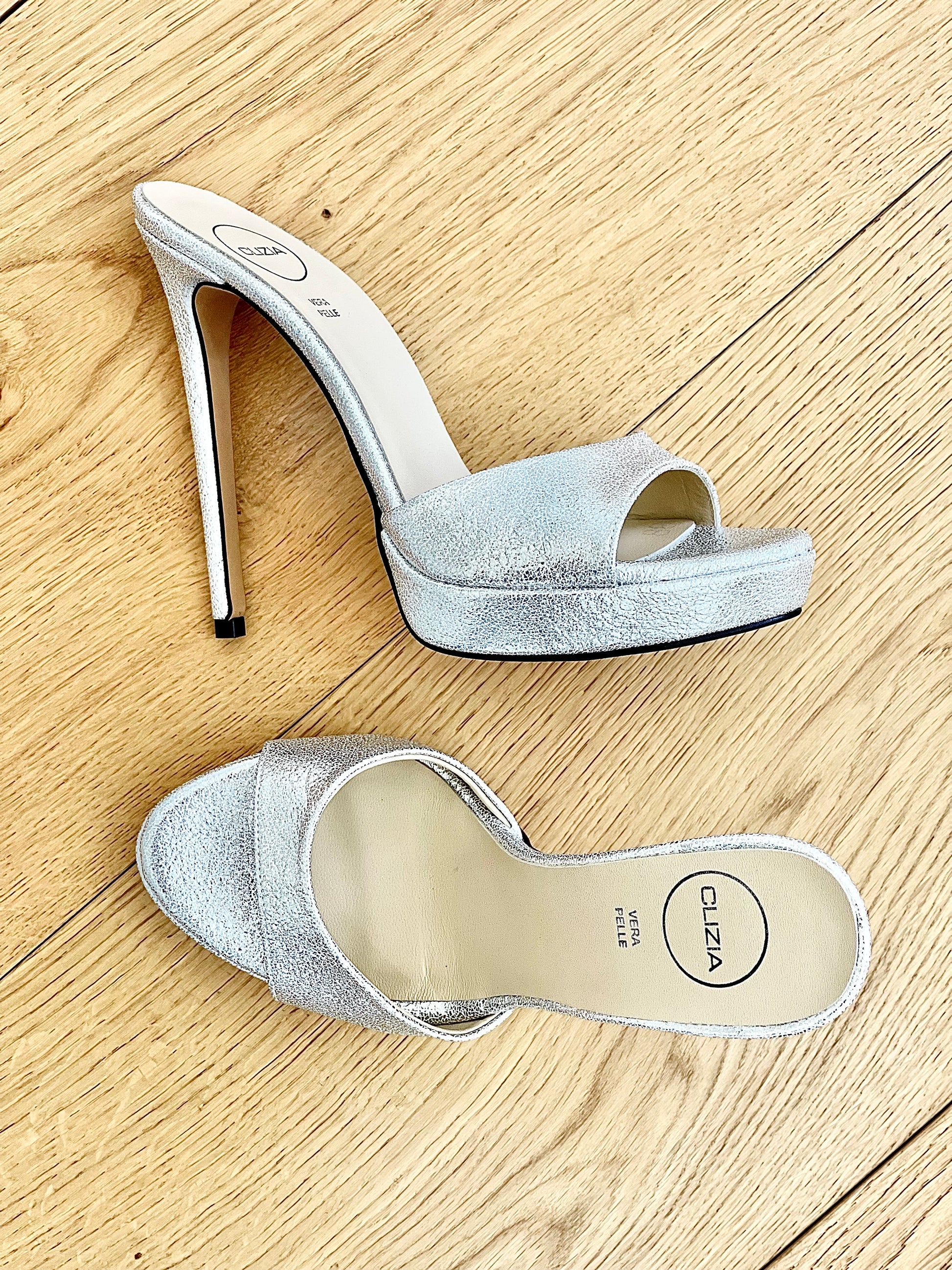 Gelamineerde hoge muiltjes sandalen met plateau en naaldhak.