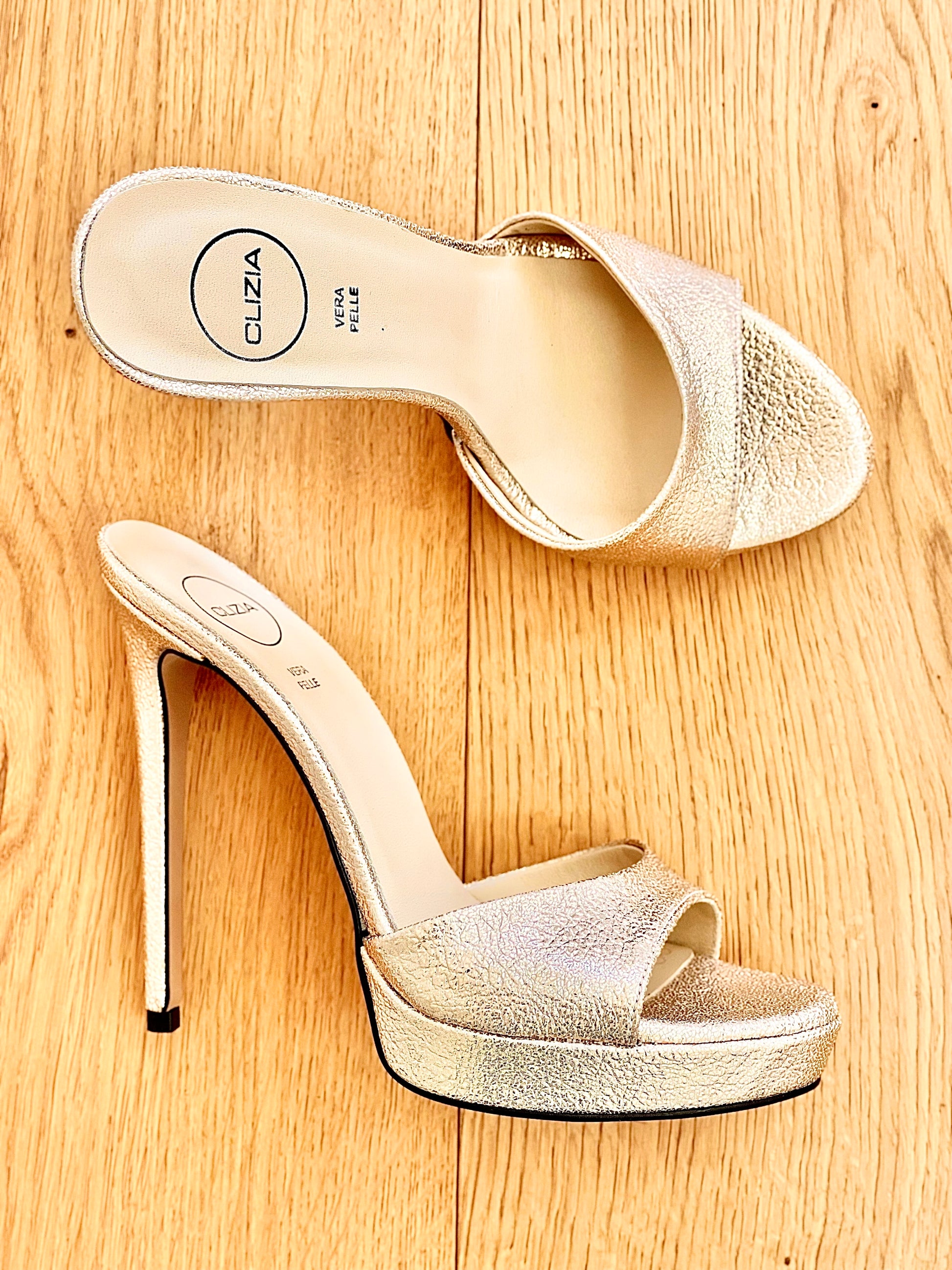 Gelamineerde hoge muiltjes sandalen met plateau en naaldhak.