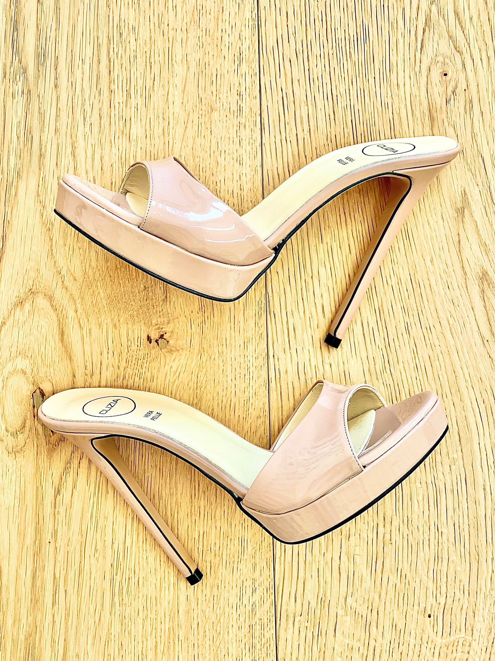 Hoge lakleren muiltjes met plateau en naaldhak.