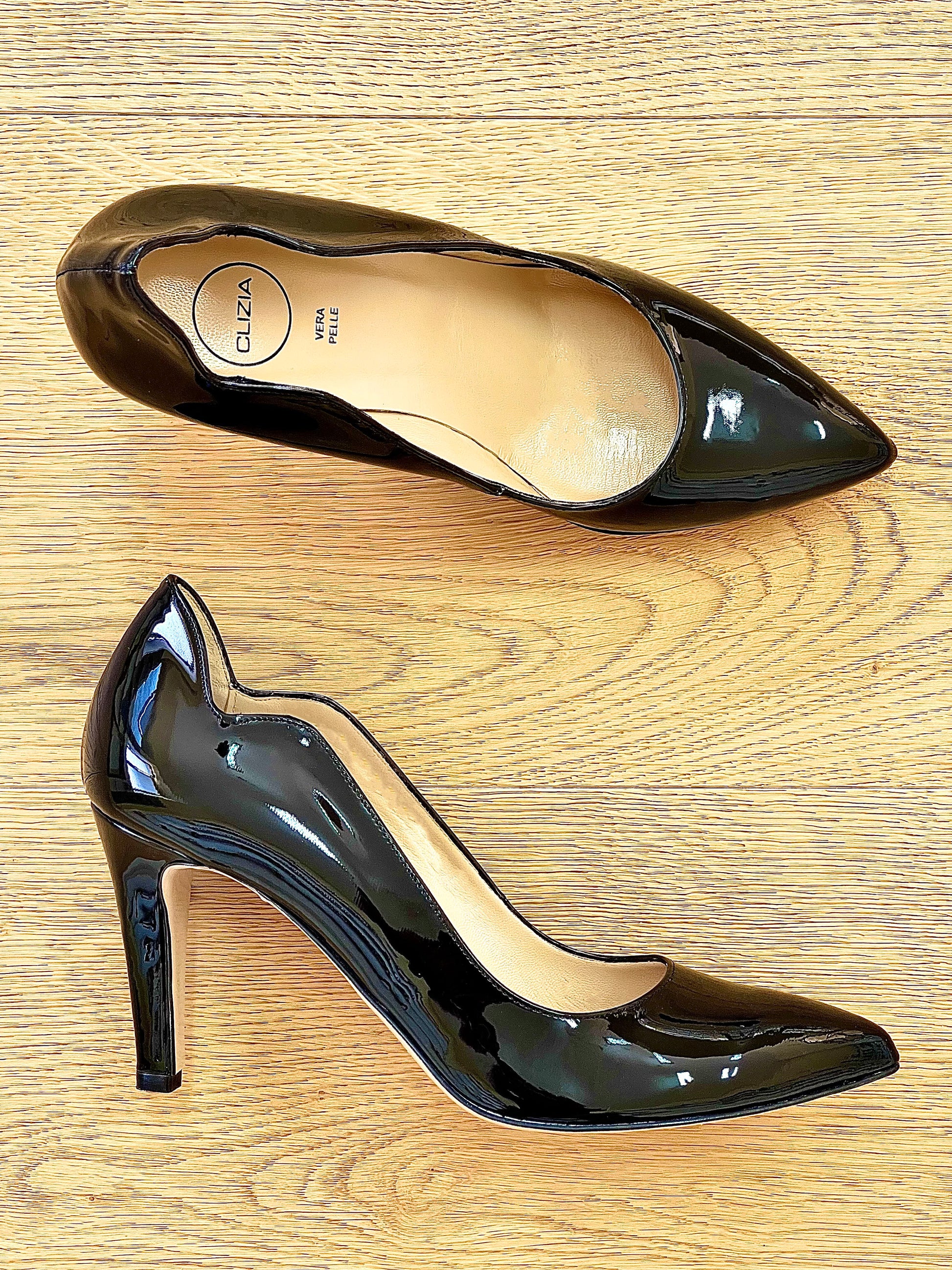 Pump met spitse teen in lakleer met een hak van 8 cm.