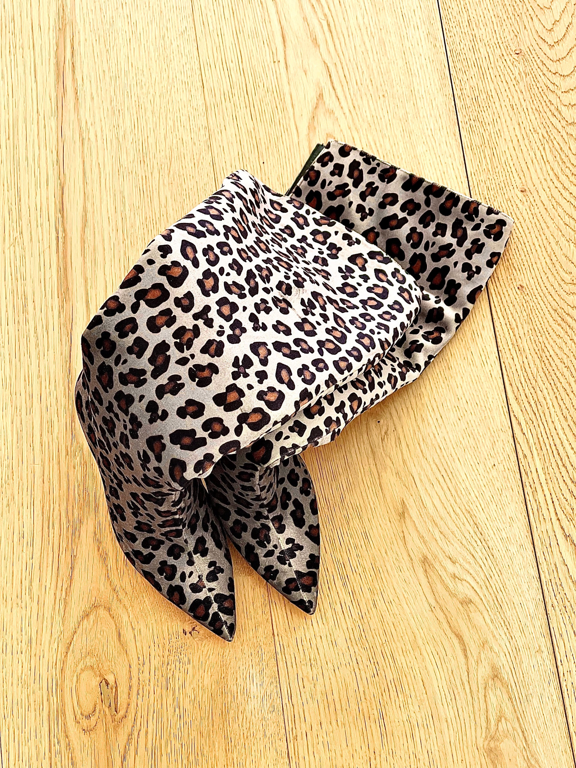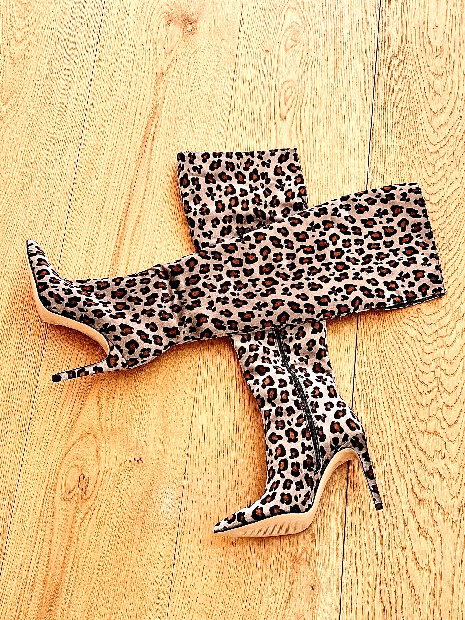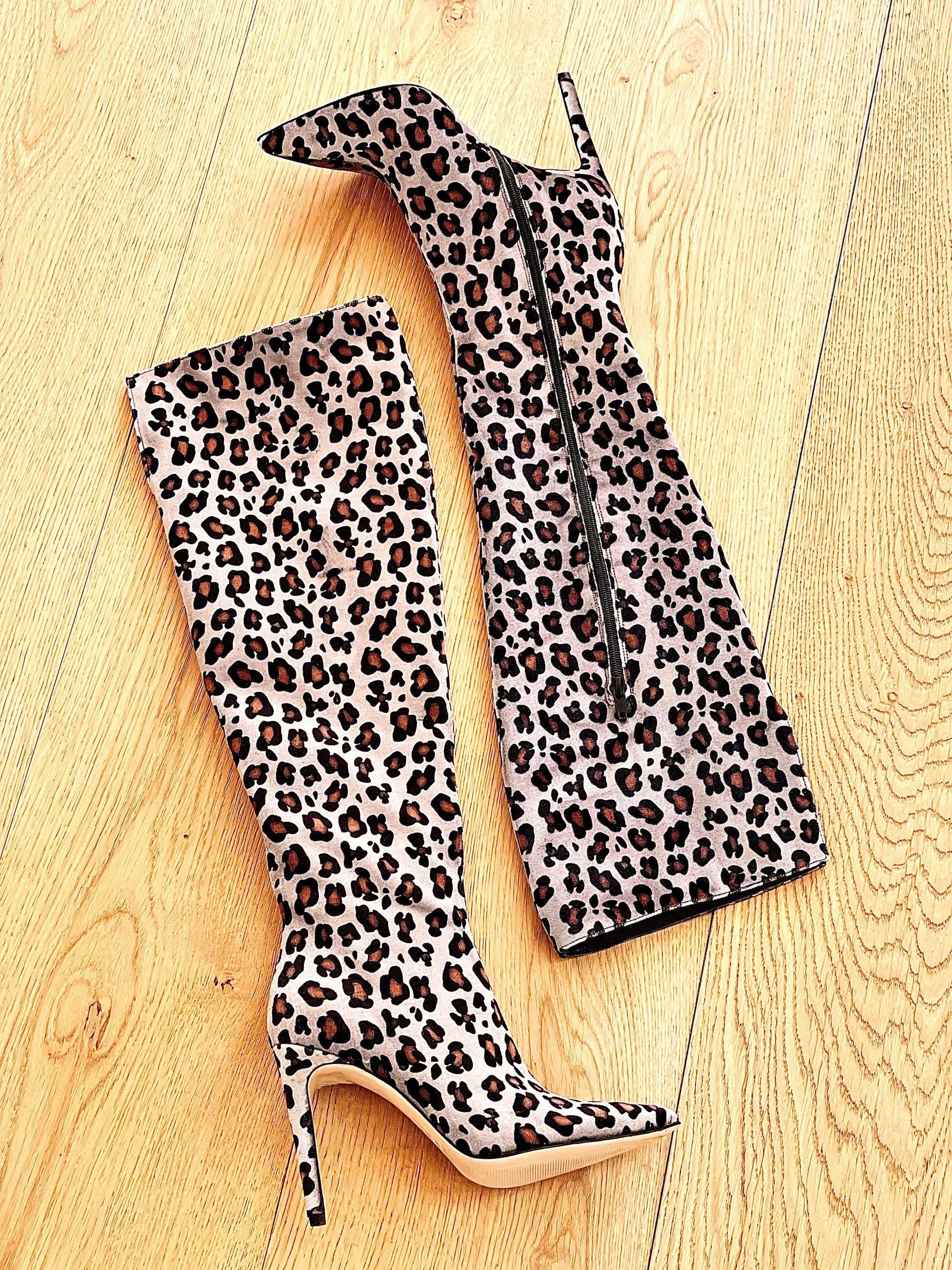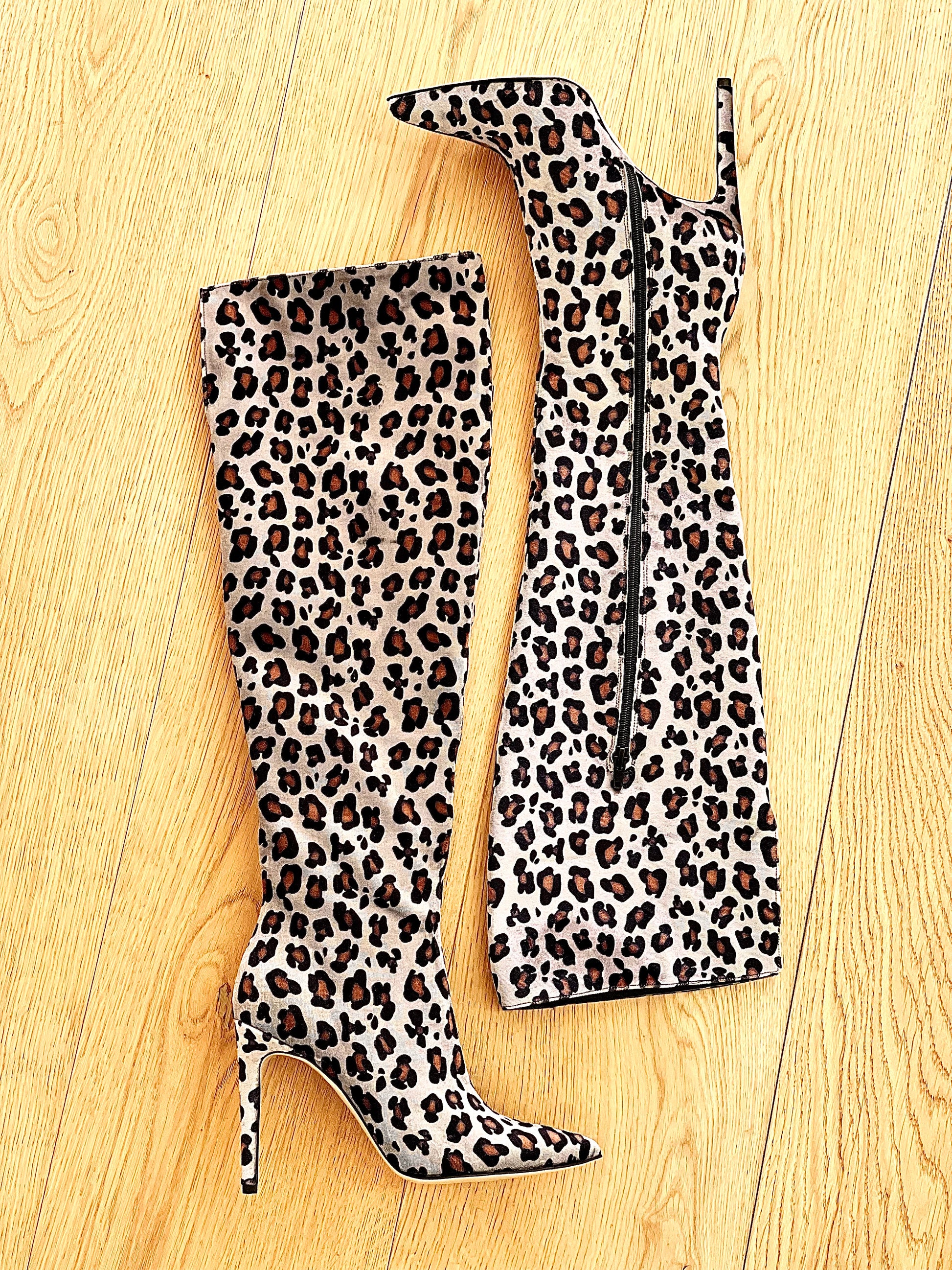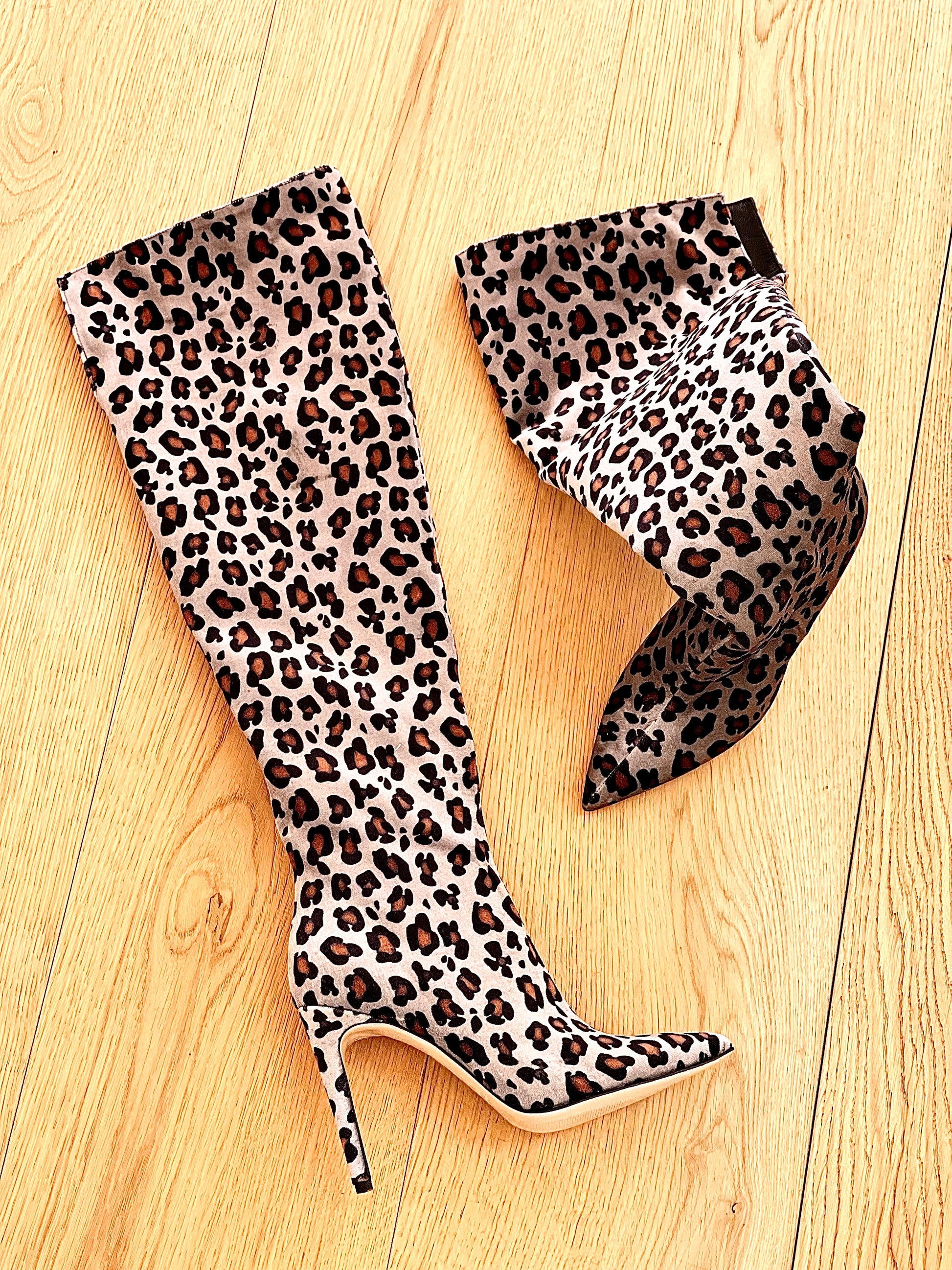 Hoge over-de-knielaarzen met een spitse animalier naaldhak van 10 cm.