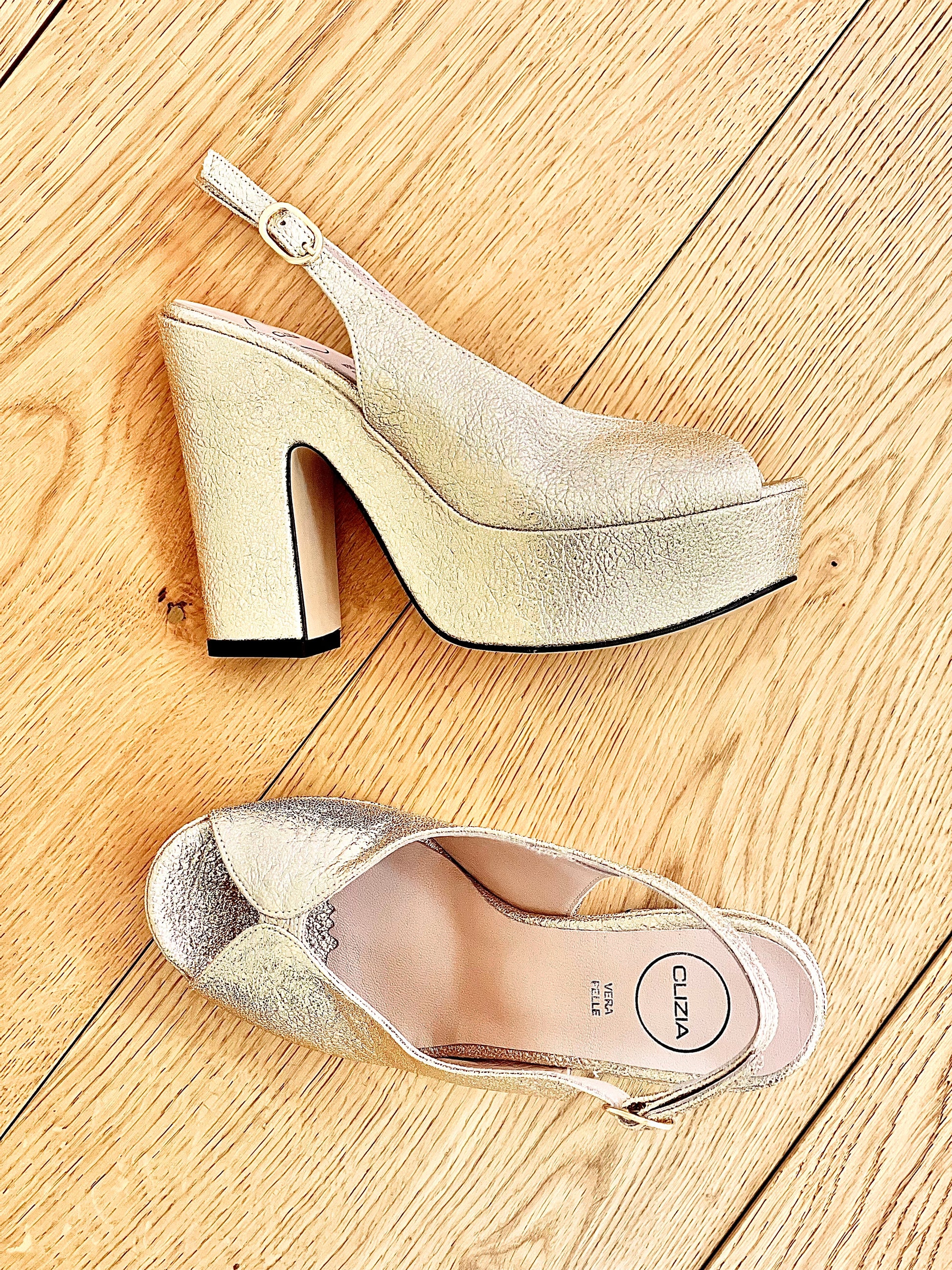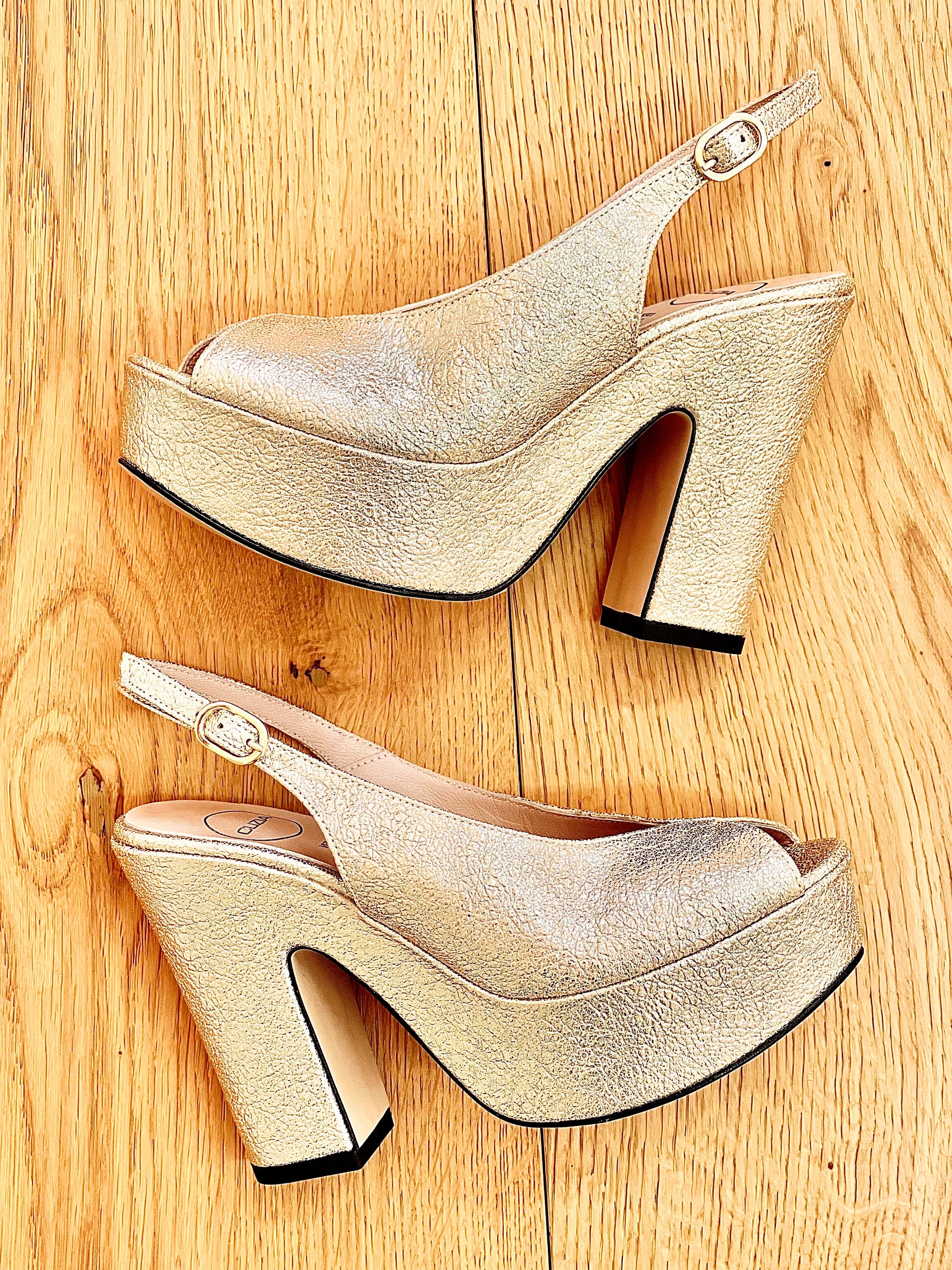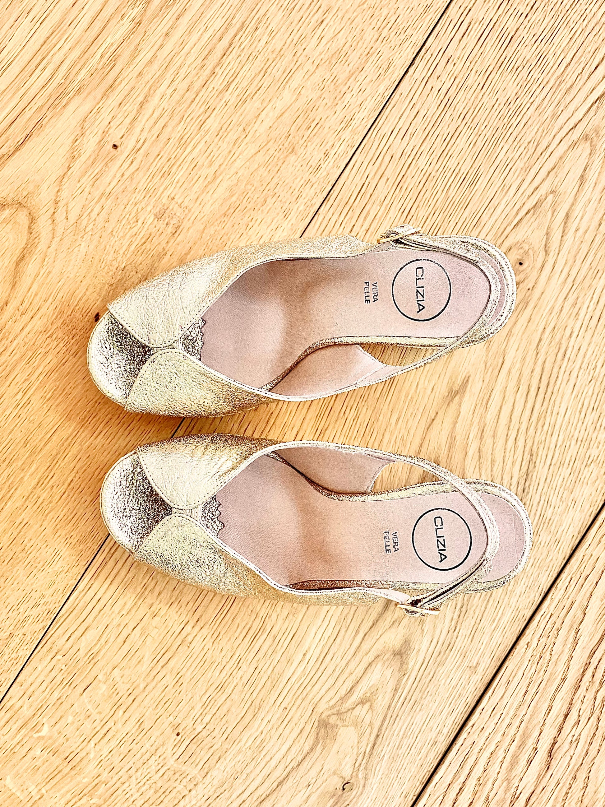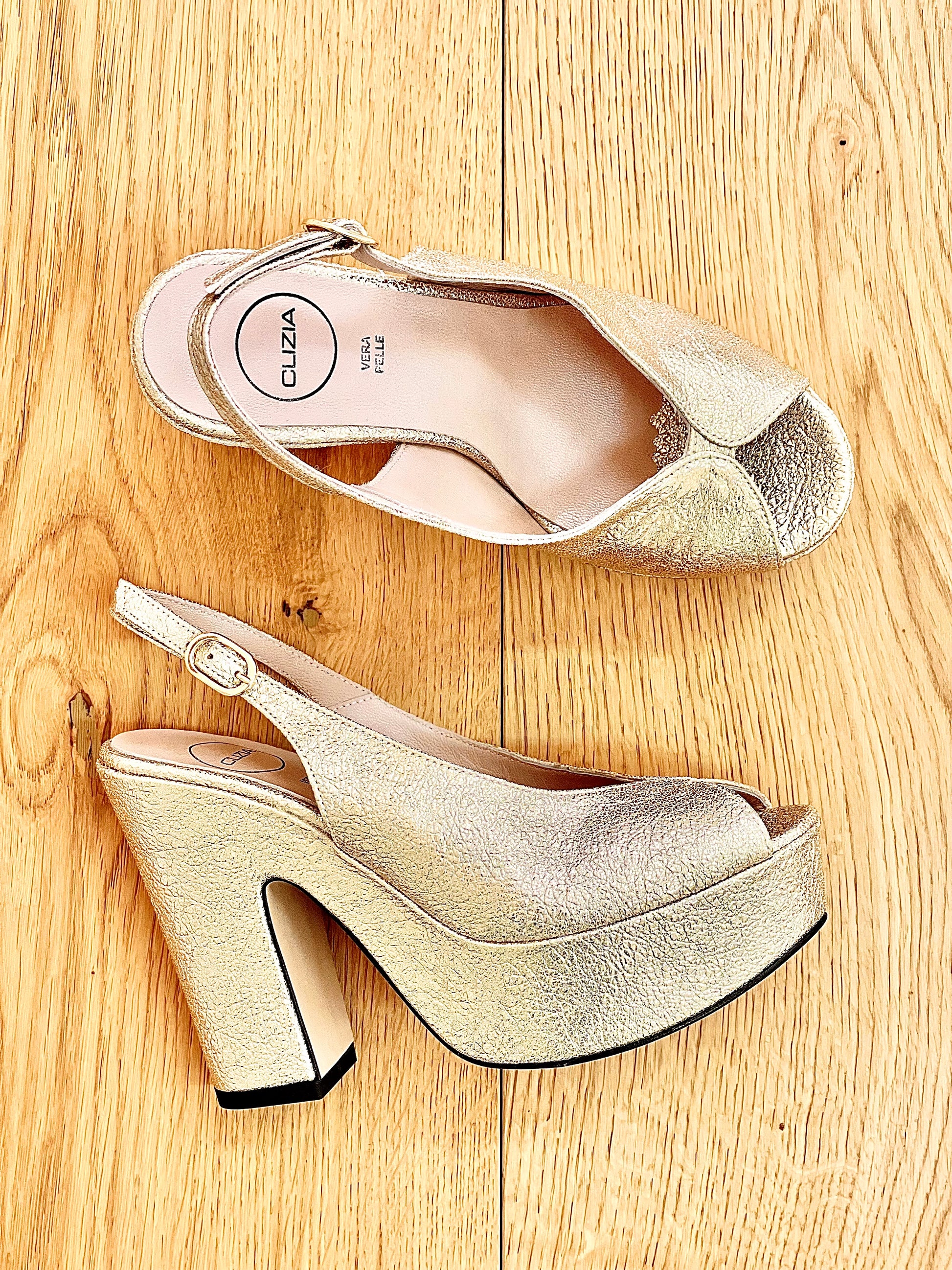 Gelamineerde slingback pumps op sleehak met hoge hak.