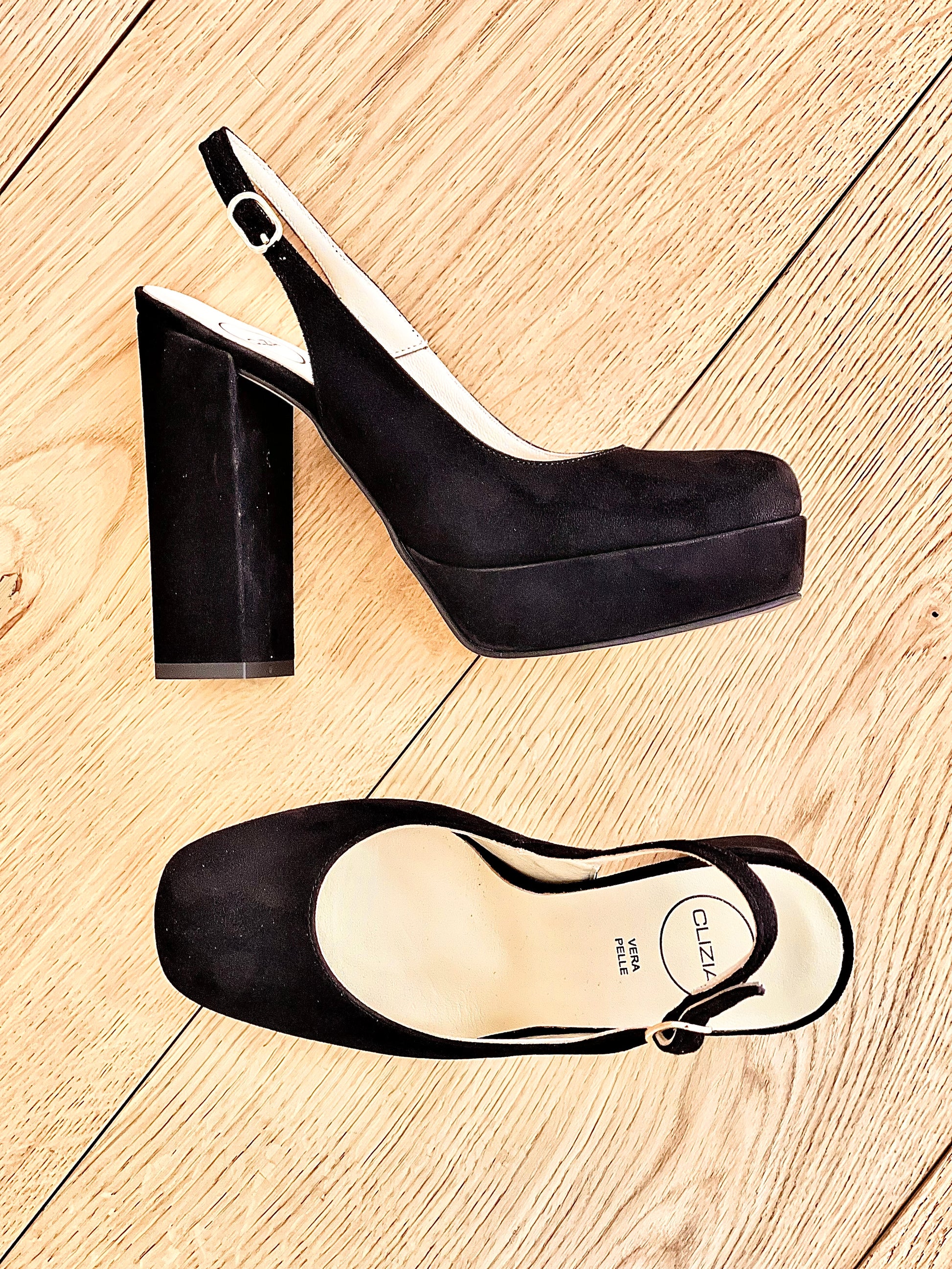Suède slingback decolleté met semi-vierkante teen, plateau en brede hoge hak.
