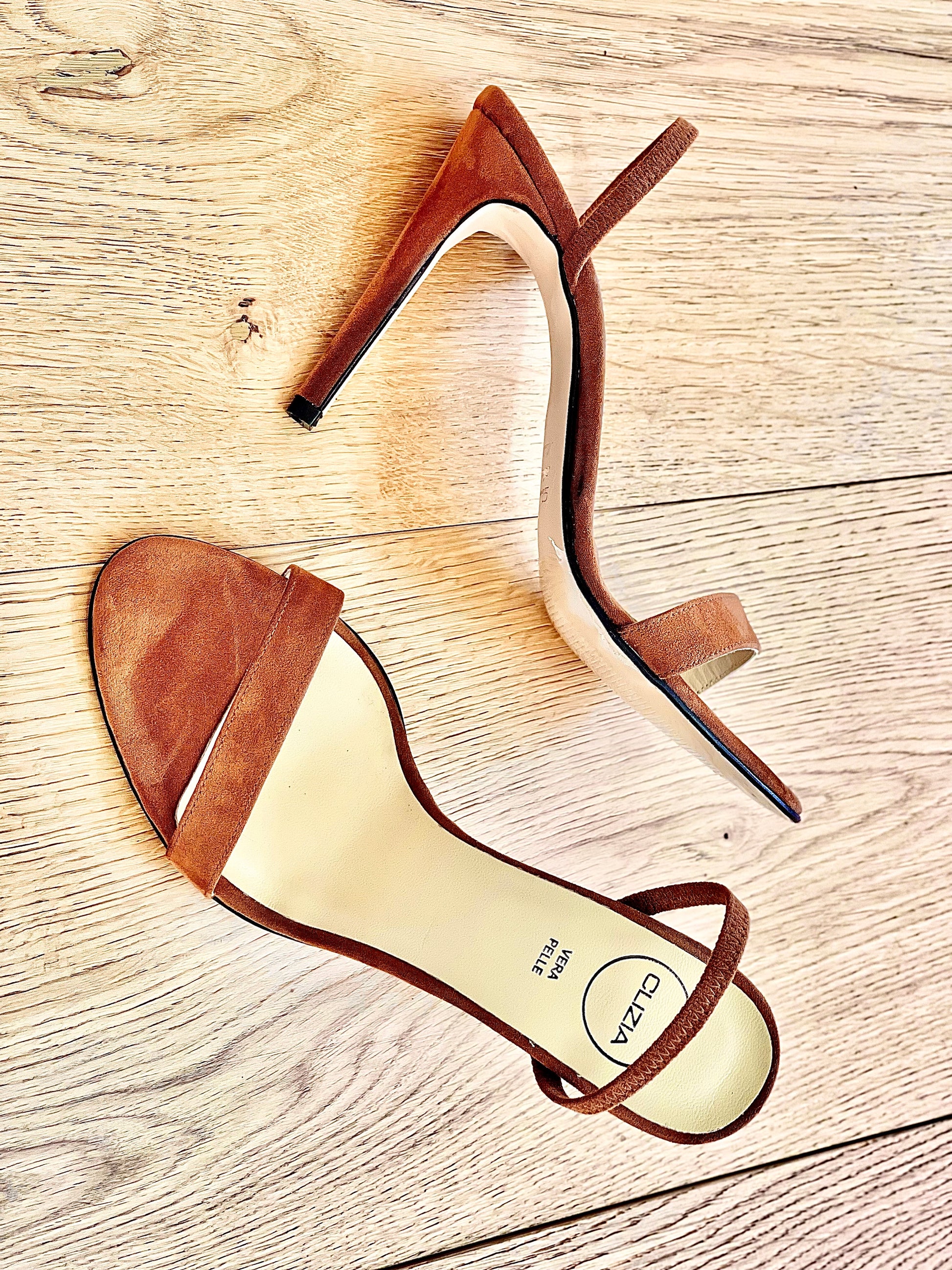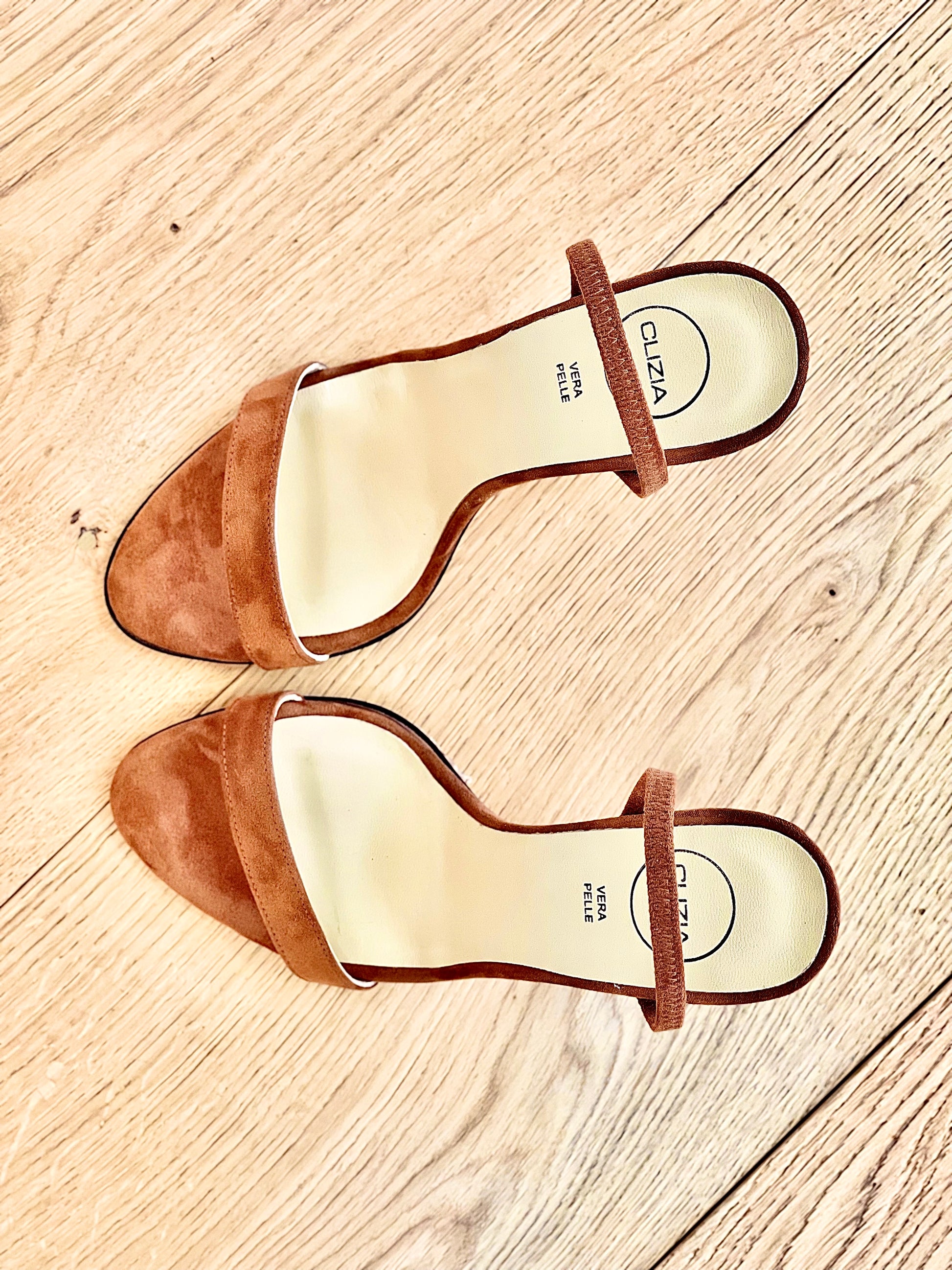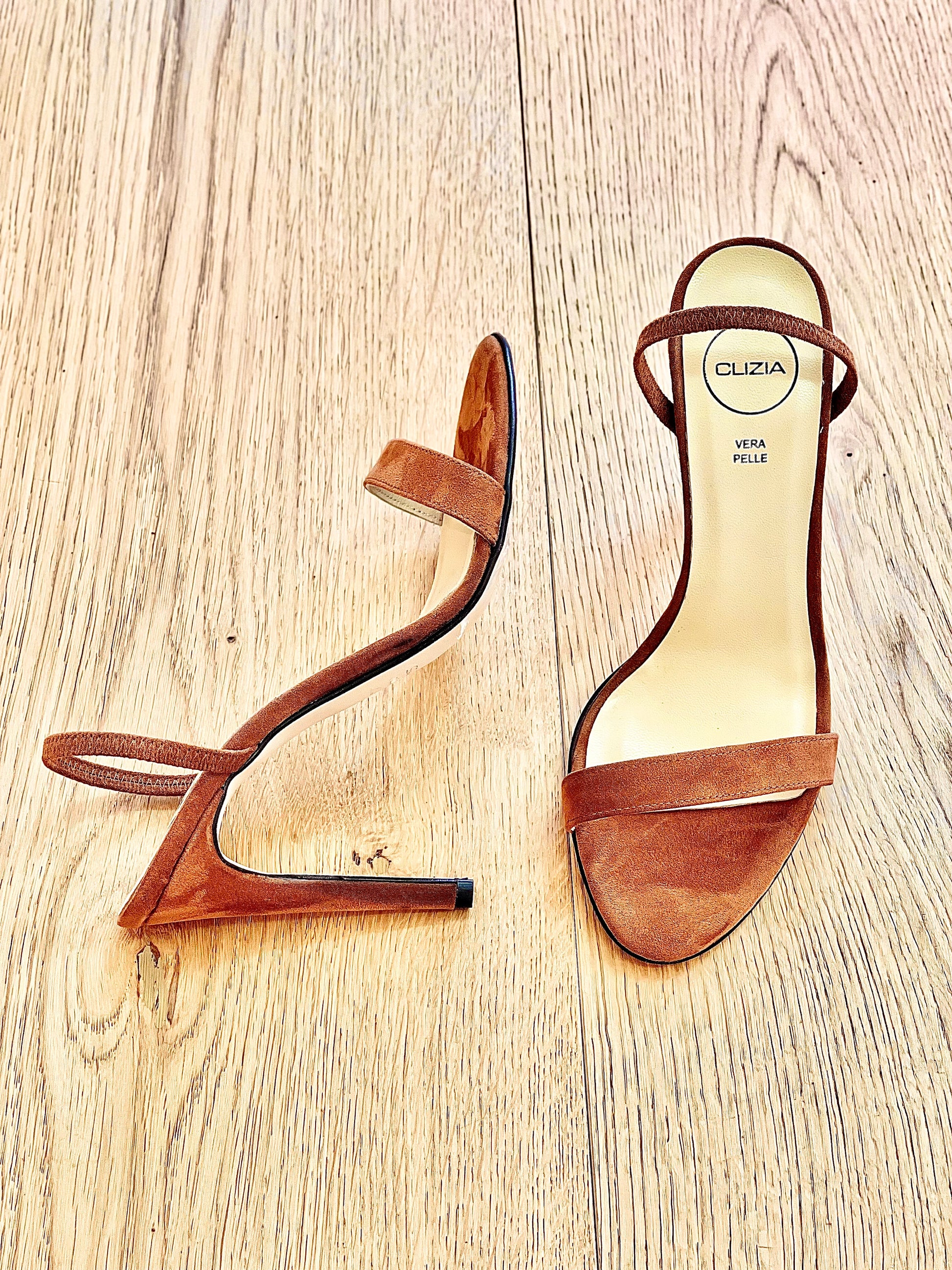 Hoge suède sandalen met elastische hak en naaldhakband.