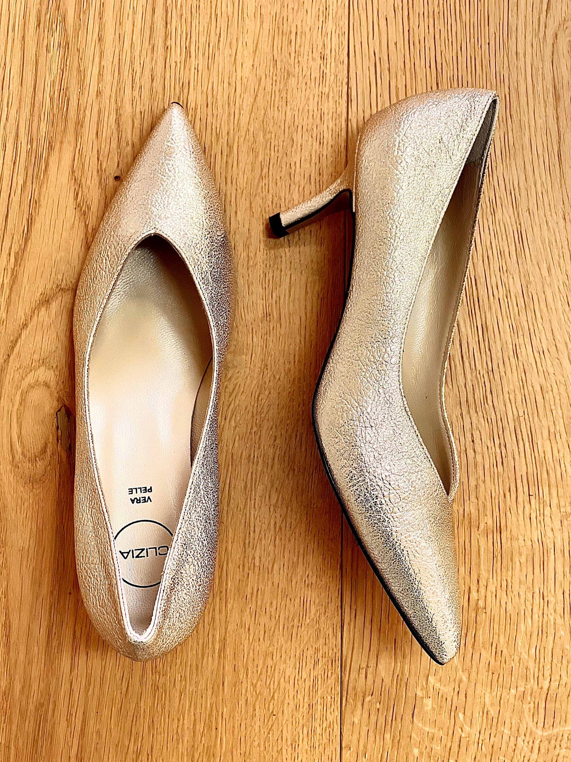 Gelamineerde pump met V-hals en hak van 6 cm.